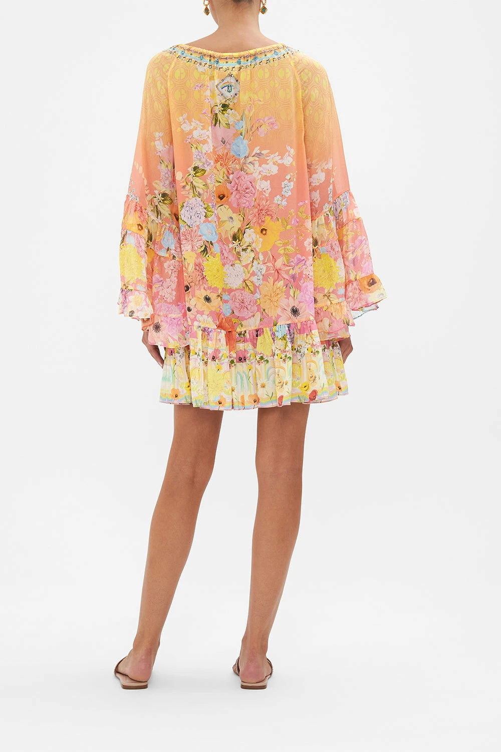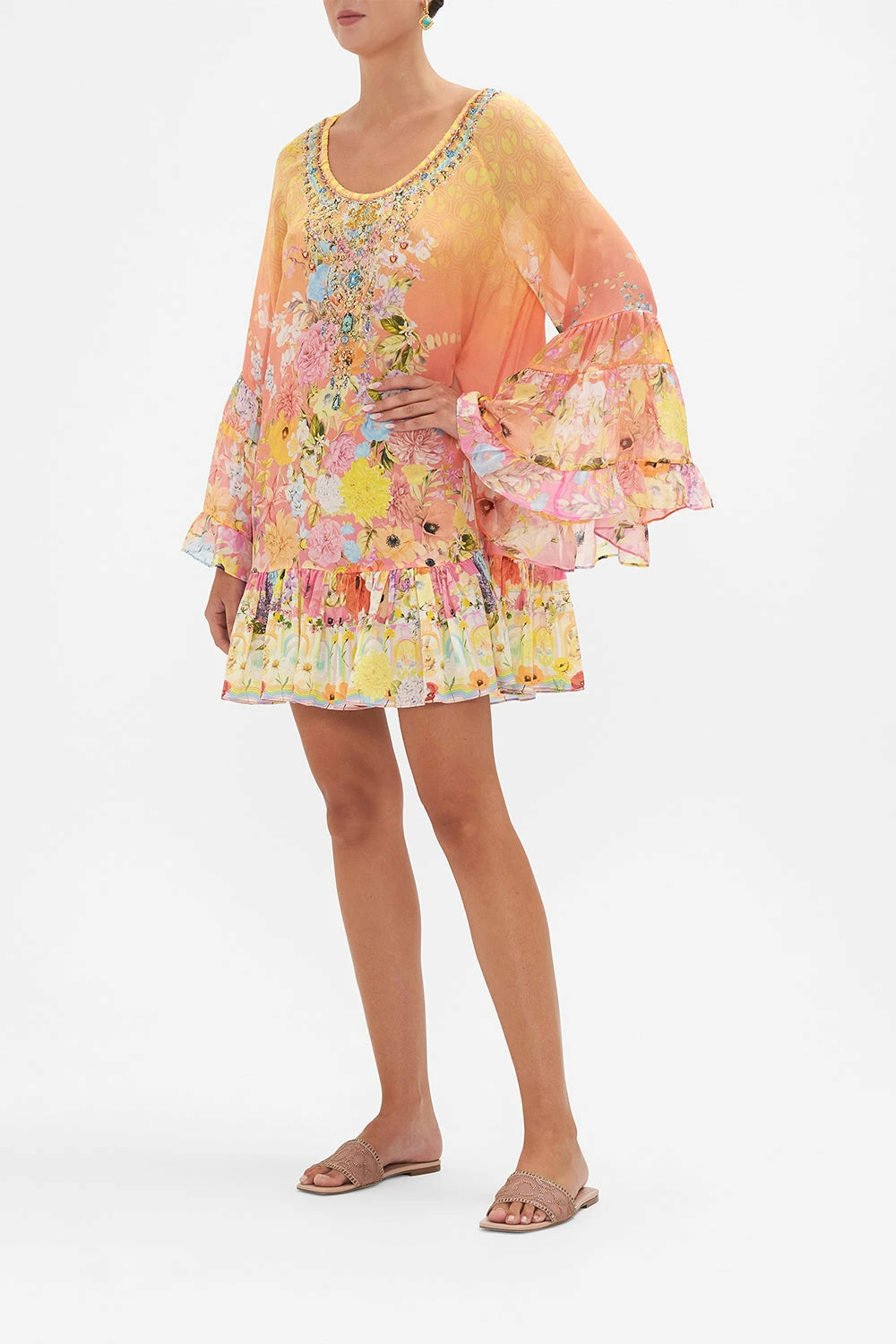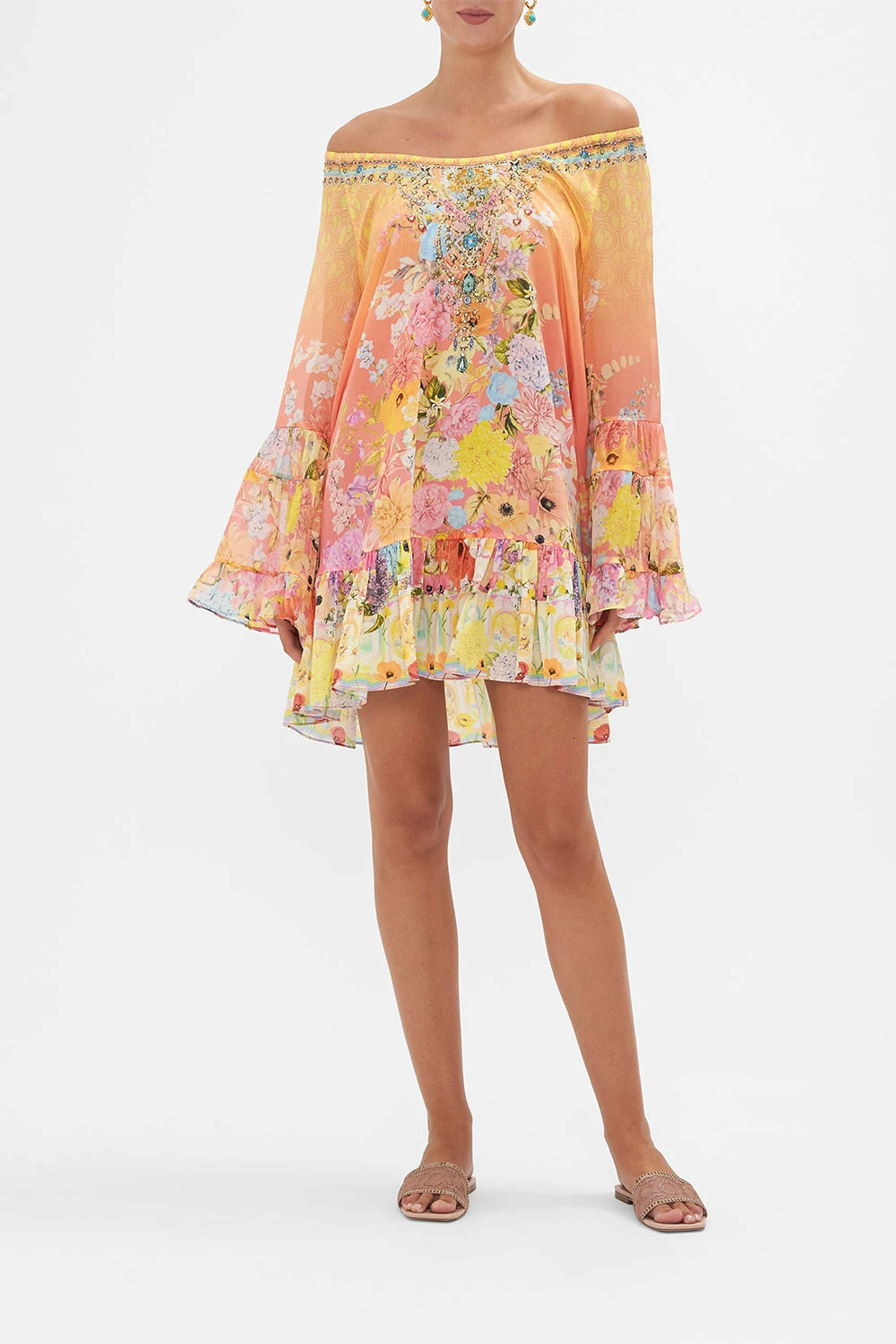 Finished with signature hand-placed CAMILLA crystals, this luxury dress homes an elasticated neckline that dips below the shoulder, voluminous frill sleeves that echo upon a relaxed mini silhouette and a decadent flare hemline.