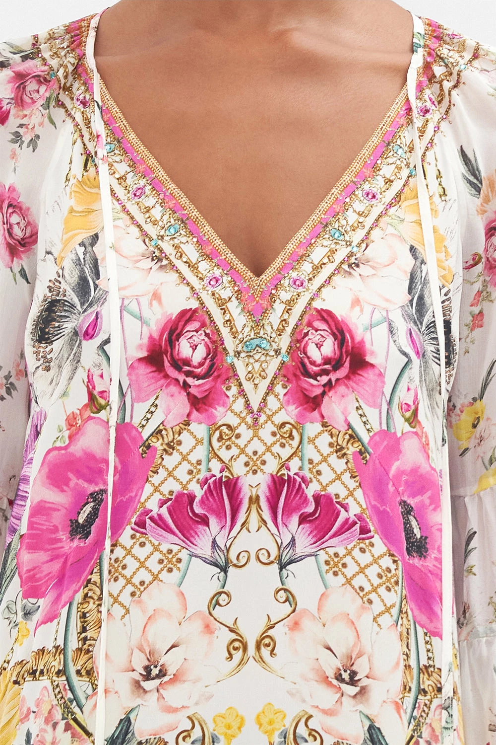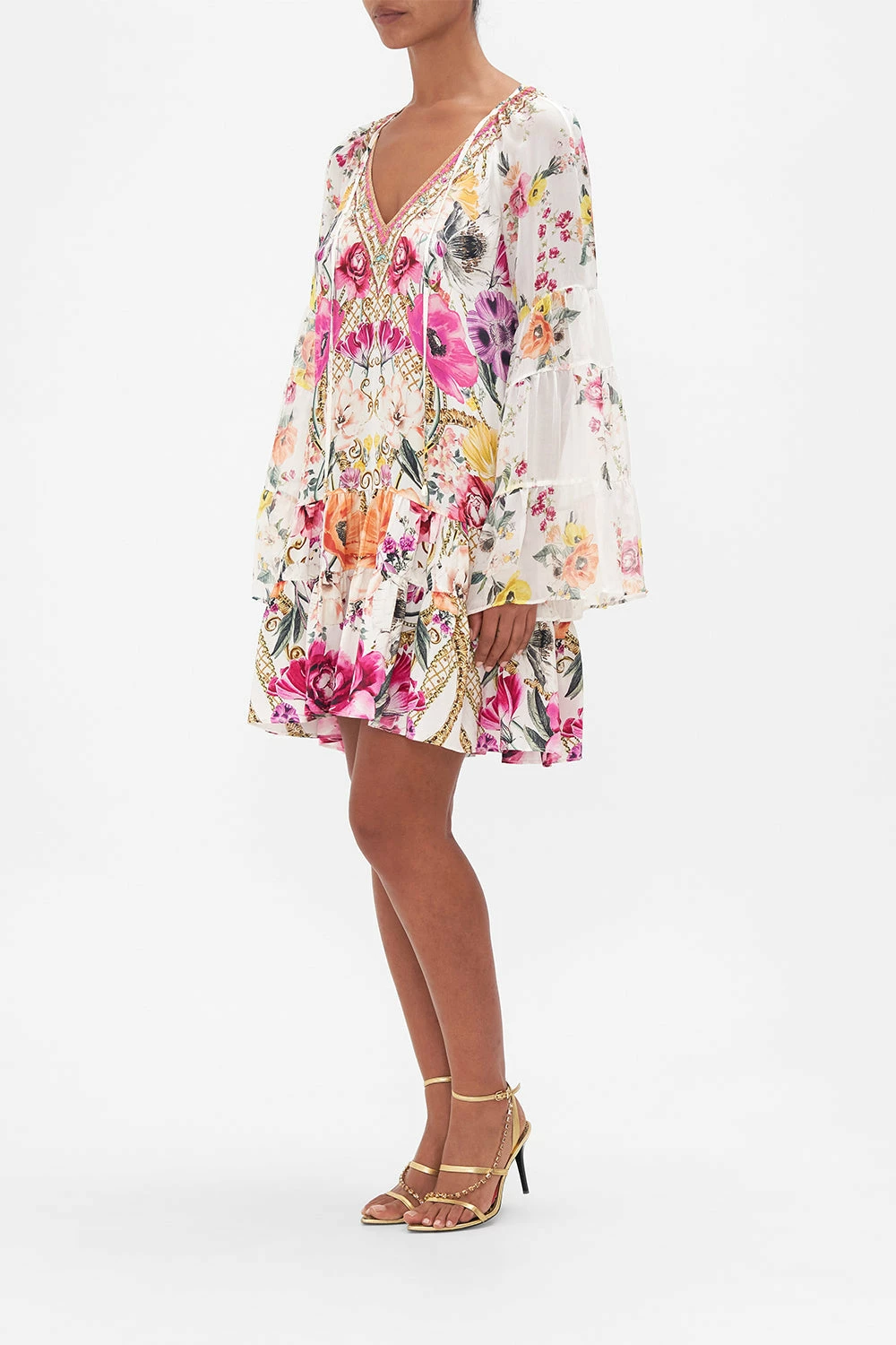 The Destiny Calling A Line Gathered Panel Dress is a sweet sonnet of bright feminine florals cascading across a gate of fine golden lattice and baroque flourishes that shine against a porcelain white backdrop. Adorned with hand-placed crystal embellishment, this luxury silk dress features wide statement sleeves, a relaxed drop waist that falls into flared mini hemline, a relaxed silhouette and dainty necktie details. Lovingly handcrafted and designed in Australia, explore more from The Moral Of The Story: Act II collection.