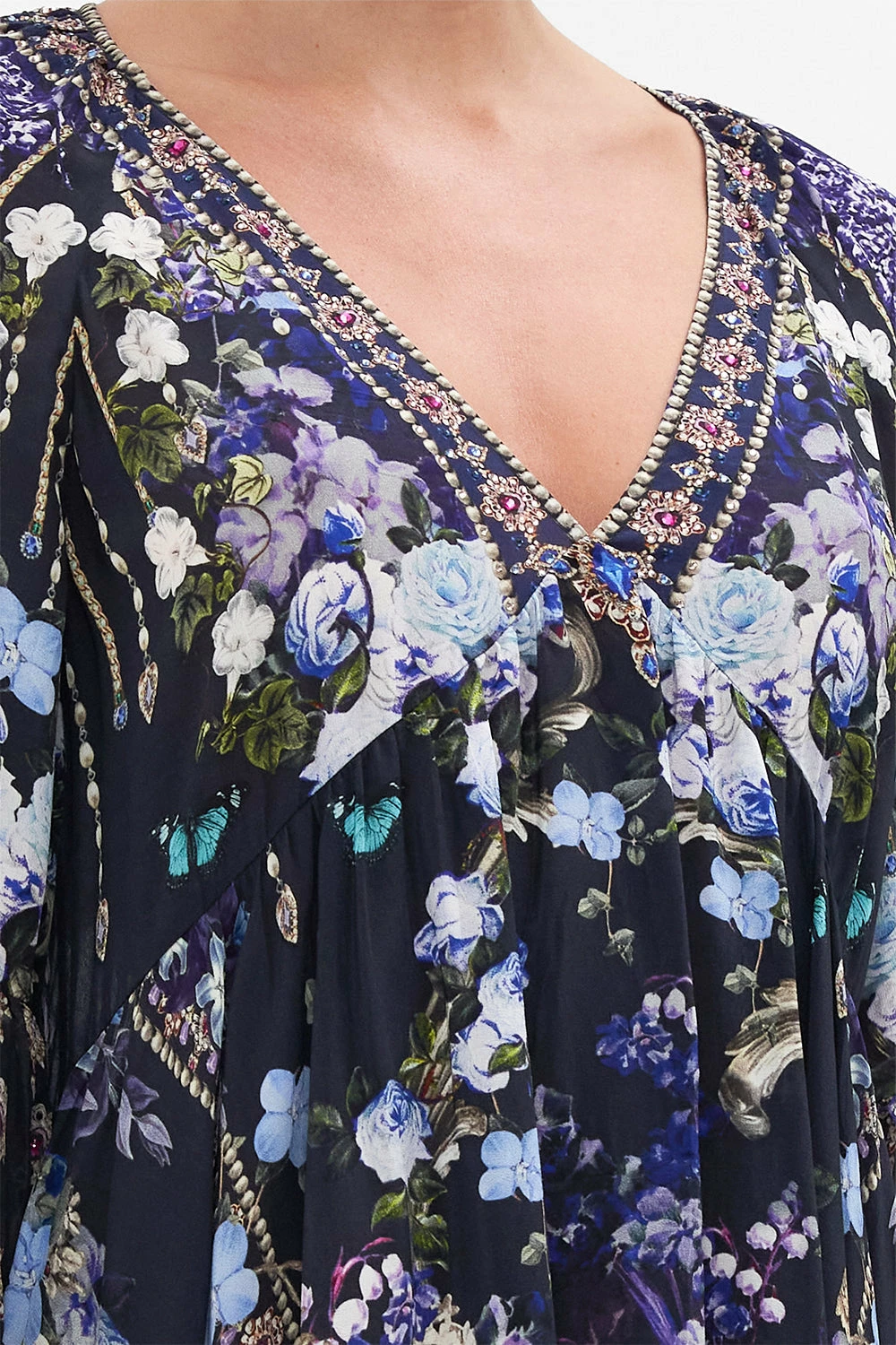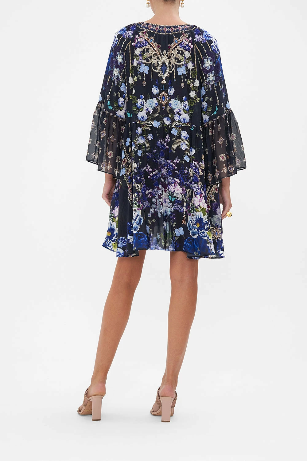 The Obsidian Bloom A-Line Ruffle Sleeve Dress greets the gaze with sapphire-kissed poppies, doves in flight amidst monarch butterflies and cascades of purple botanicals. Complete with hand-placed CAMILLA crystals, this luxury silk dress features a classic v neckline, statement ruffle sleeves that fall into wide cuffs, a relaxed silhouette that meets a mini hemline and pocket functionality.