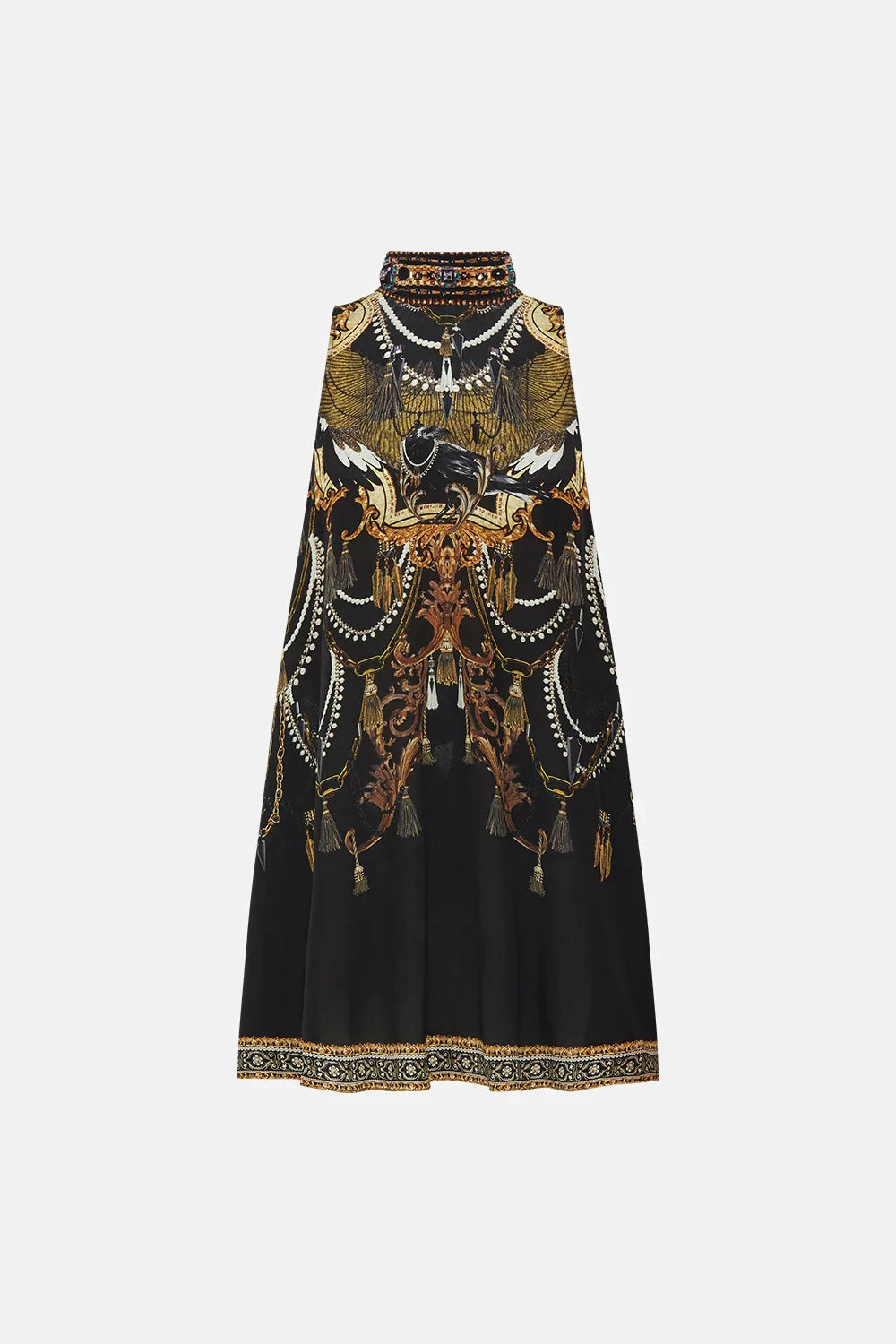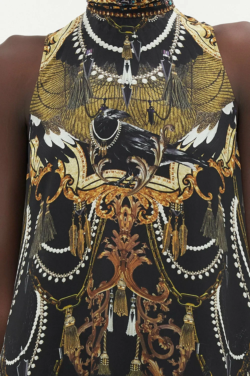 The Ravin Raven Back Neck Tie Short Dress reimagines sixties sensation with golden raven wingtips soaring amidst bronze baroque details, cascades of chain rivers and the delicate touch of tassel accents that hang throughout. Crafted from signature CAMILLA silk, this luxury shift dress is home to a high neckline scintillating with hand-embellished crystals, a relaxed fit that crops into a mini length, a contrast hem and concealed pockets that add the final touches of convenience.