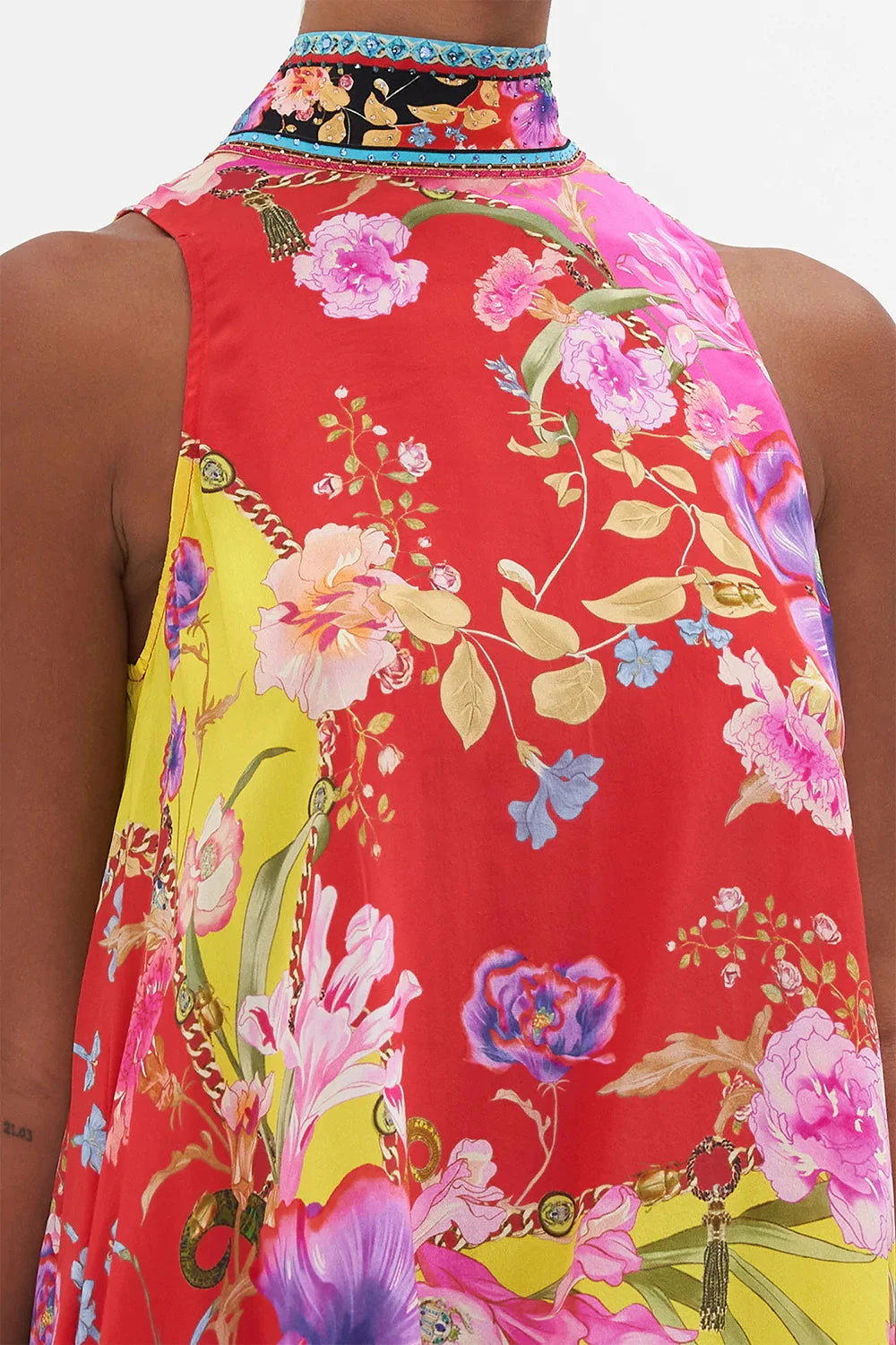 The Beetles Back Neck Tie Short Dress explores a scarlet red and magenta symphony defined by kaleidoscopic poppies, cascades of irises that float amidst beautiful beetle-backs and frilly carnations that tantalise in soft-spoken pinks. Crafted from signature CAMILLA silk, this luxury shift dress is home to a high neckline scintillating with hand-embellished crystals, a relaxed fit that crops into a mini length, a contrast hem and concealed pockets that add the final touches of convenience.
