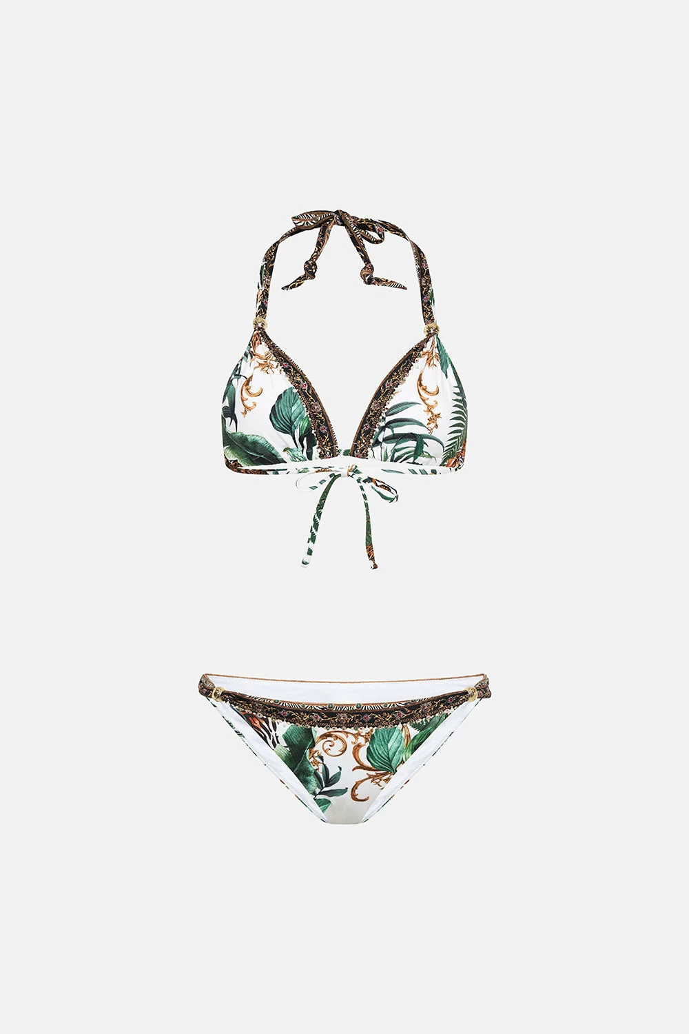 Taking a stride on the wild side, the Tiger Trap Ball Bikini is steeped in vivid ivory hues, cascades of forest ferns, gold baroque detailing and the electric pounce of the tiger. Crafted from ECONYL® regenerated nylon, this sustainable bikini features metallic hardware details, tie-up fastening, a hipster cut and hand-embellished crystal adornments.