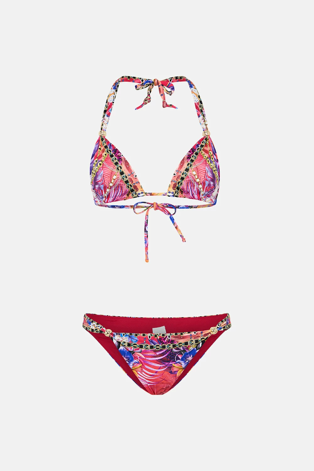 The Wild Loving Ball Bikini radiates the warm glow of a sunset paradise. Where wilderness reigns amongst vibrant violet florals nestling against bold magenta palms, laced with intricate gold chains, charms and hints of sparkling amethyst jewels. Crafted from ECONYL® regenerated nylon, this sustainable bikini is home to golden hardware at the décolletage that meets timeless tie-up fastening, a hipster cut and hand-embellished crystal adornments. Lovingly crafted and designed in Australia, explore more from The Moral Of The Story: Act II collection.