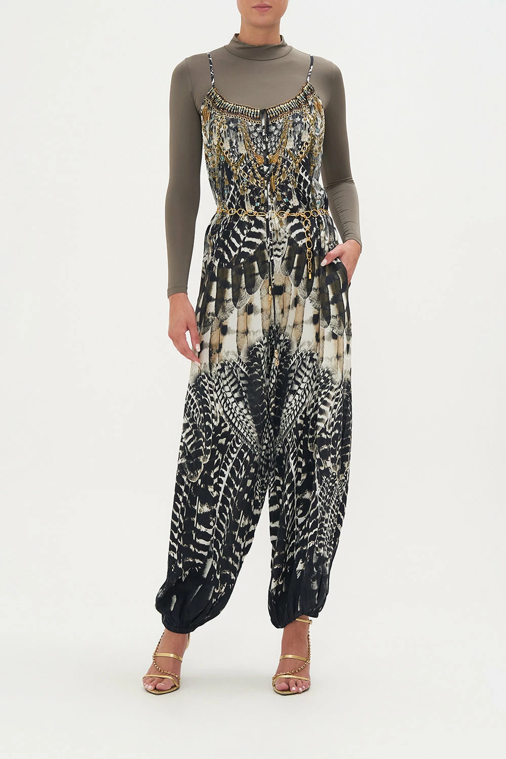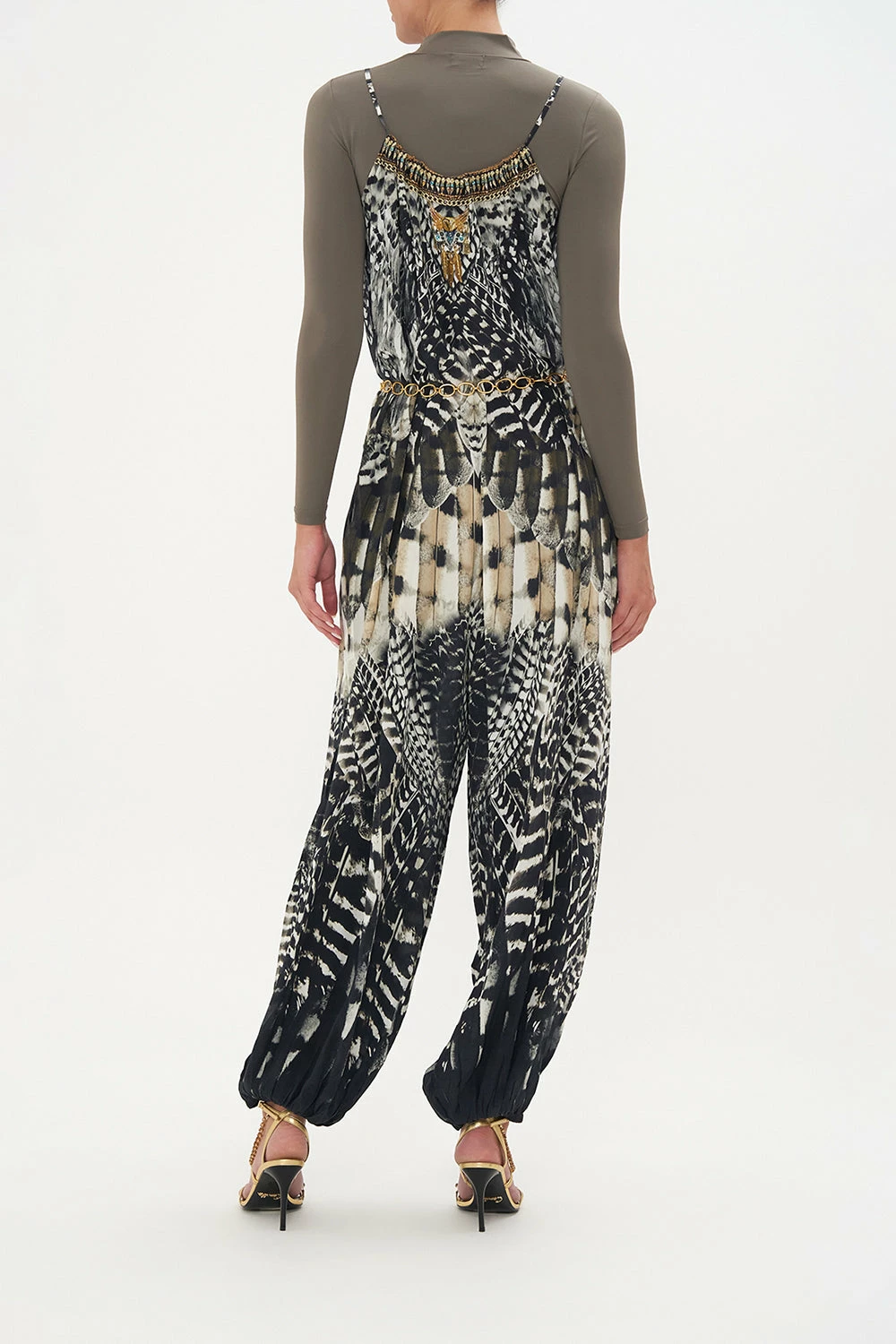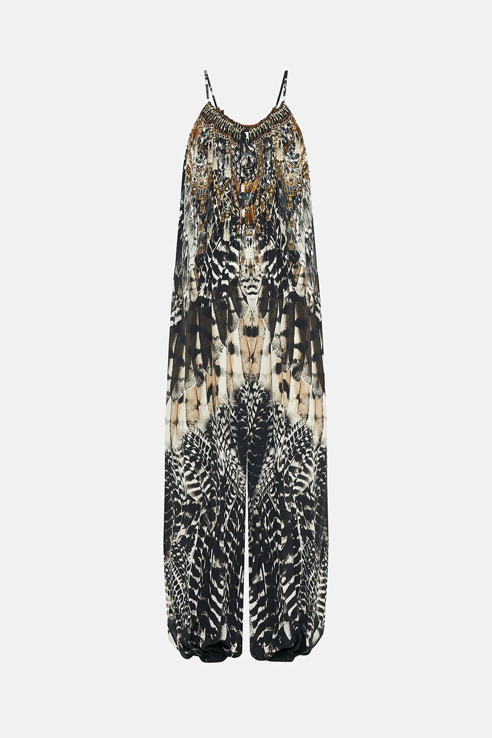 Nocturnal majesty fusing upon effortless dressing, the Night Owl Balloon Jumpsuit is enveloped in a deep midnight hue adorned with cascades of ivory featherings, moments of mocha and wispy white owl details. Crafted from signature CAMILLA silk, this luxury jumpsuit features a voluminous balloon pant, tie-up detailing at the scooped neckline, elasticated cuffs and relaxed silhouette throughout.