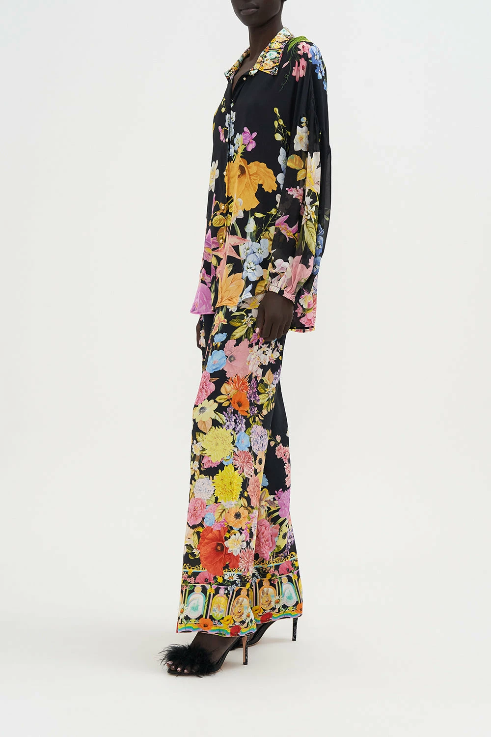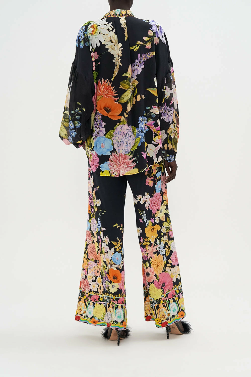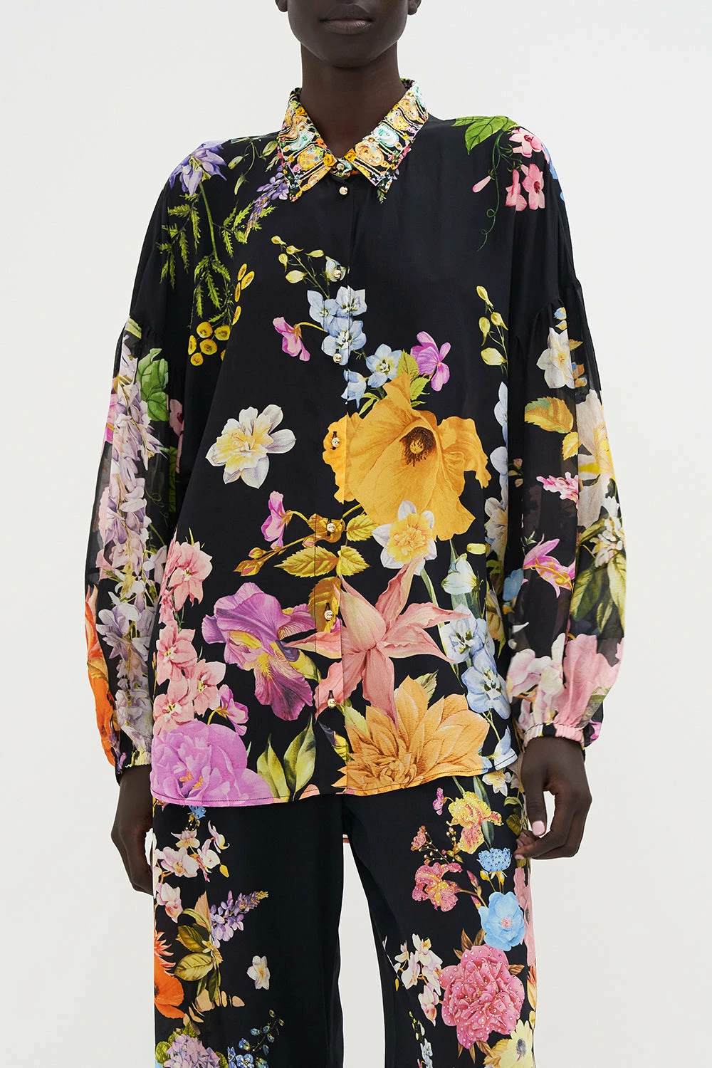 The Divine Divinity Balloon Sleeve Shirt Blouse steals the gaze with the poetic bloom of poppies dipped in crimson and daffodils, delicate daisies that dance amidst a sea of midnight hues. Crafted from signature CAMILLA silk, this luxury shirt plays host to voluminous blouson sleeves, a classic collar that falls into button fastening and a relaxed silhouette.