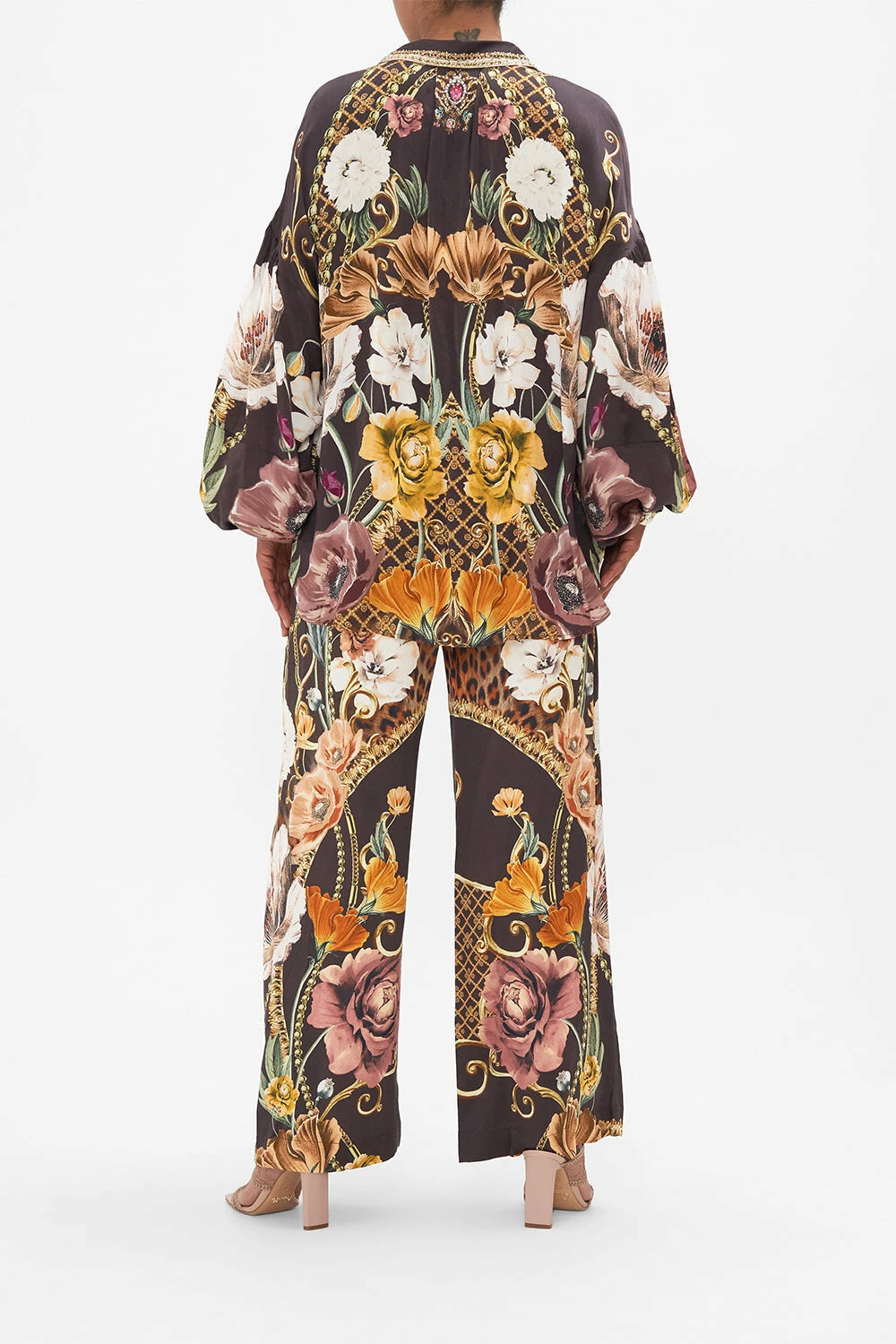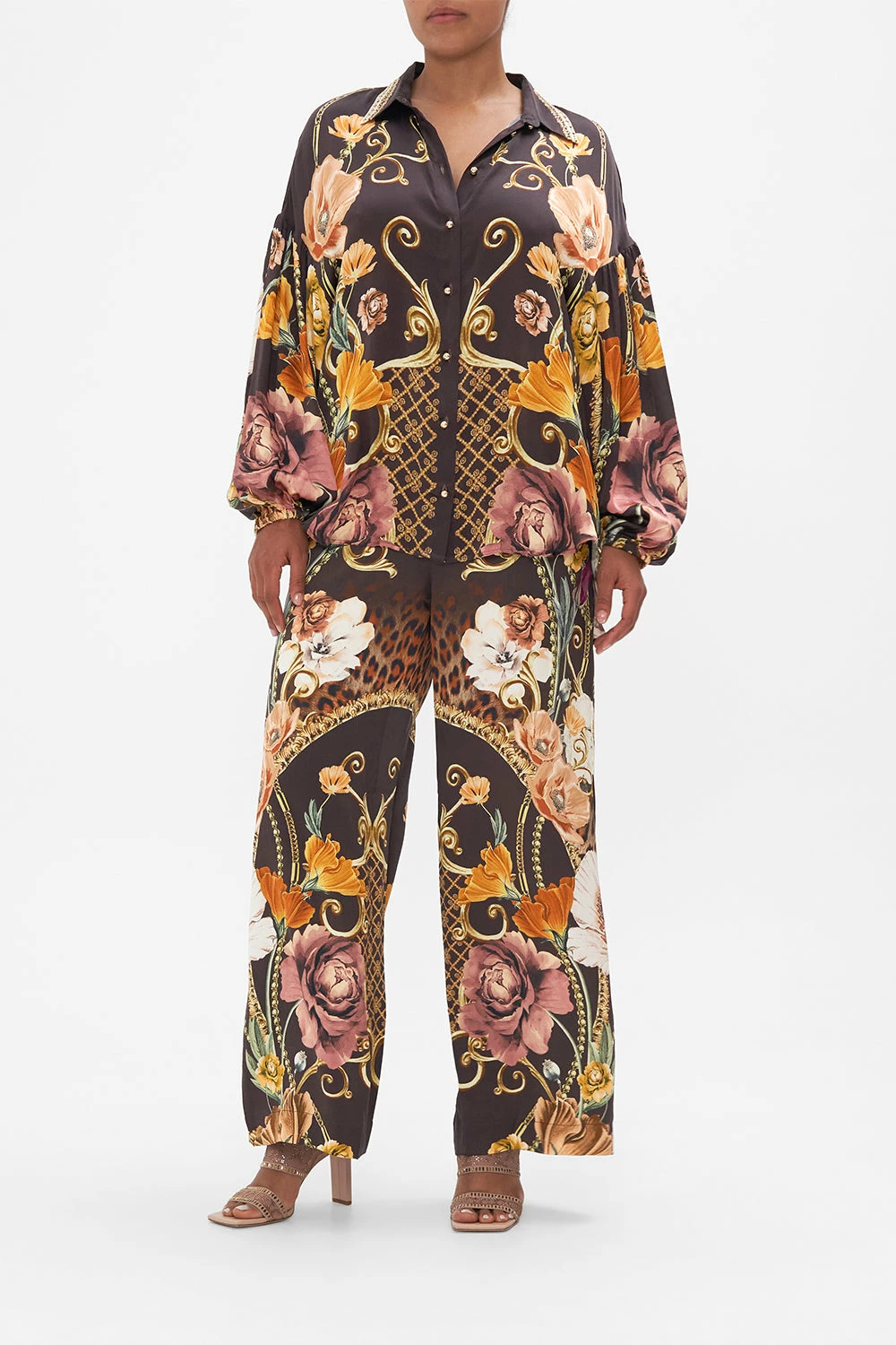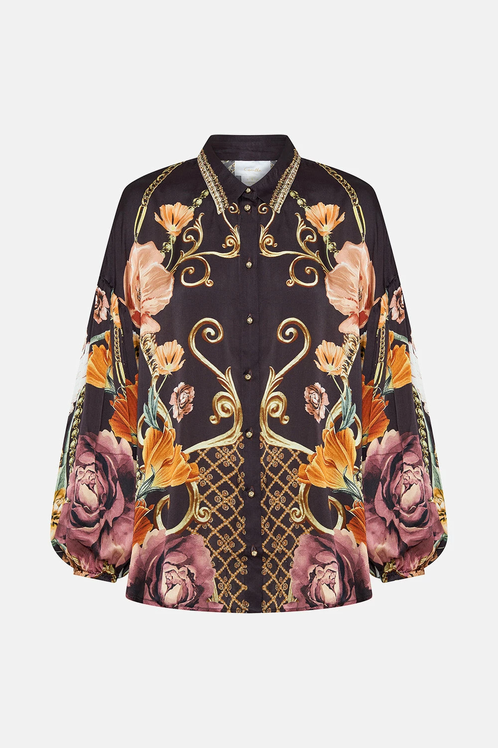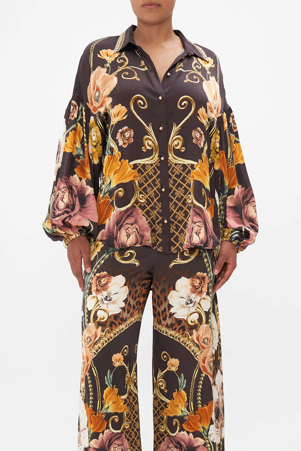 The Wave Your Wand Balloon Sleeve Shirt Blouse wanders through a flurry of wild leopard print and feminine florals. A magical world delicately framed in regal gold baroque details that glimmer against a decadently rich deep chocolate background. Crafted from signature CAMILLA silk, this luxury shirt plays host to dramatically voluminous blouson sleeves, a classic collar that flows into a front button enclosure and a relaxed fit silhouette. Lovingly handcrafted and designed in Australia, explore more from The Moral Of The Story: Act II collection.
