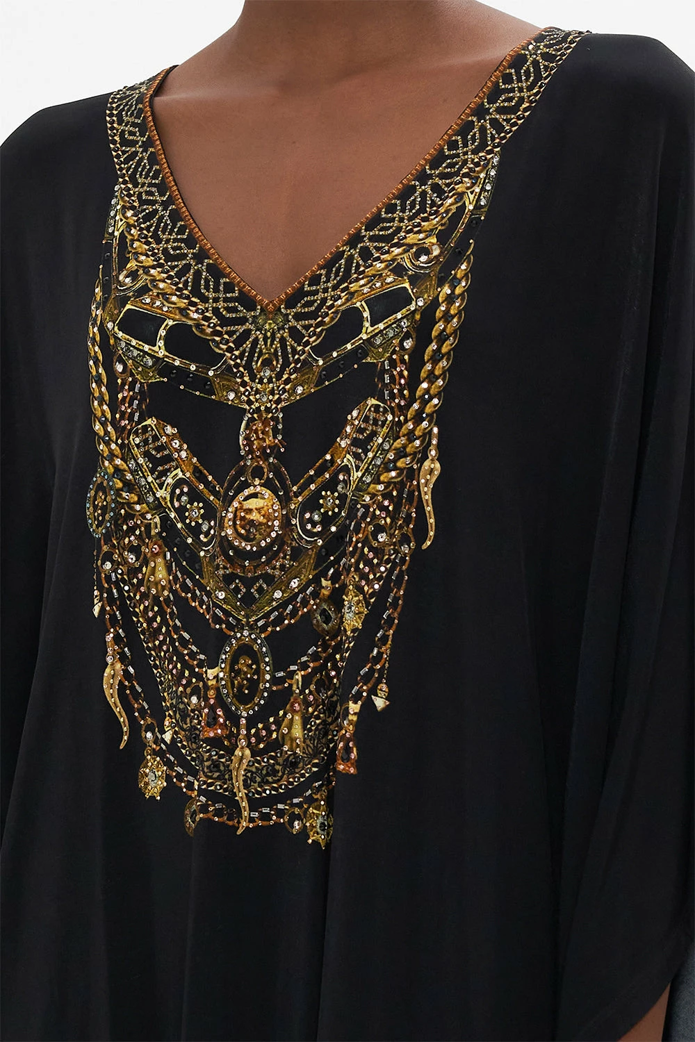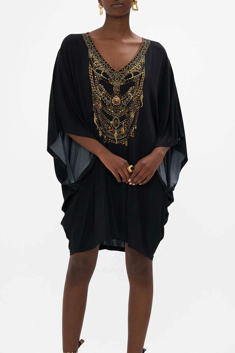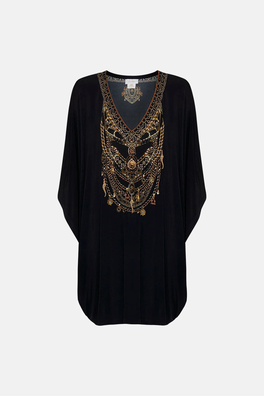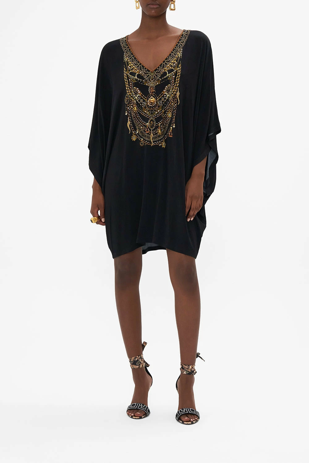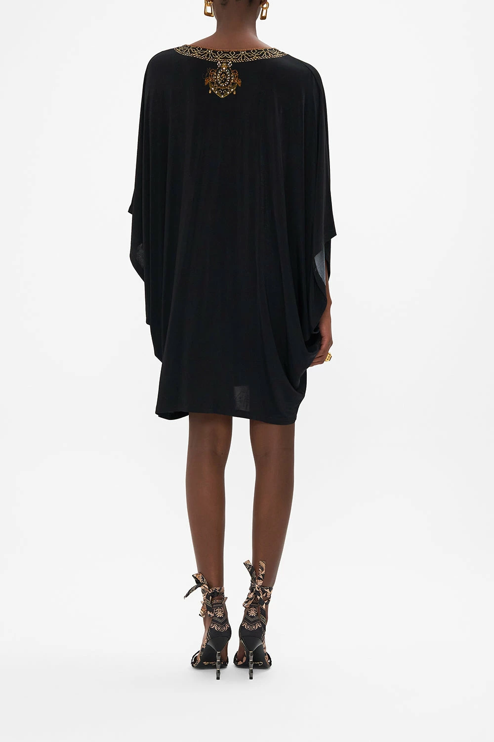 The Look Up Tesoro Bat Sleeve Dress embodies a striking bold graphic black and shimmering highlights. An elevated take on everyday comfort, this luxury mini dress plays host to a relaxed silhouette, cropped sleeves that dance at the elbows, a deep v neckline and side draped details. Wear as an effortlessly elegant dress of for chic casual styling pair with the Look Up Tesoro Jersey Drape Pant with Pockets. Lovingly handcrafted, designed in Australia. Explore more from the Amore Mio collection.