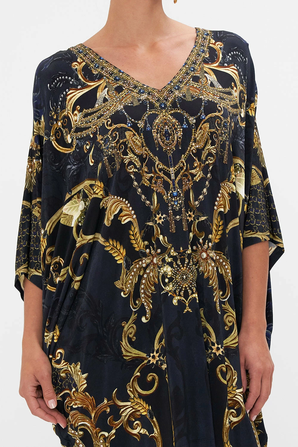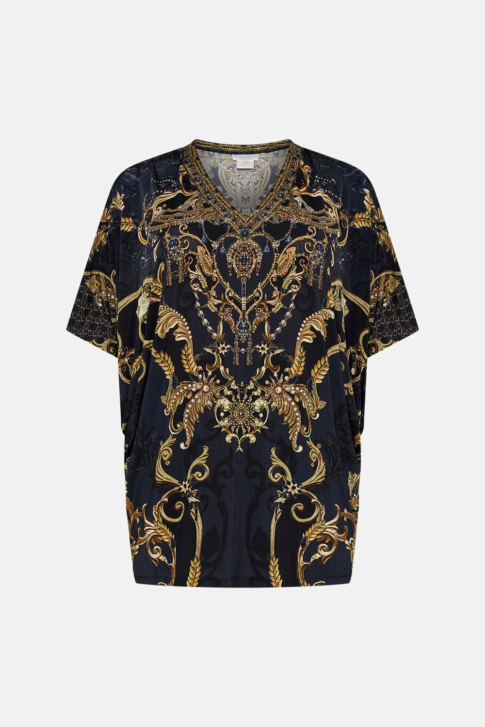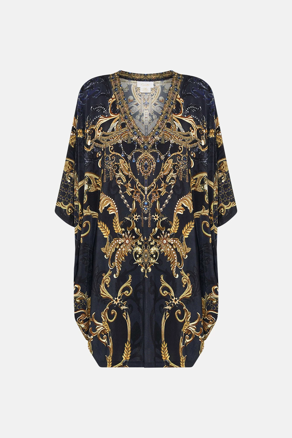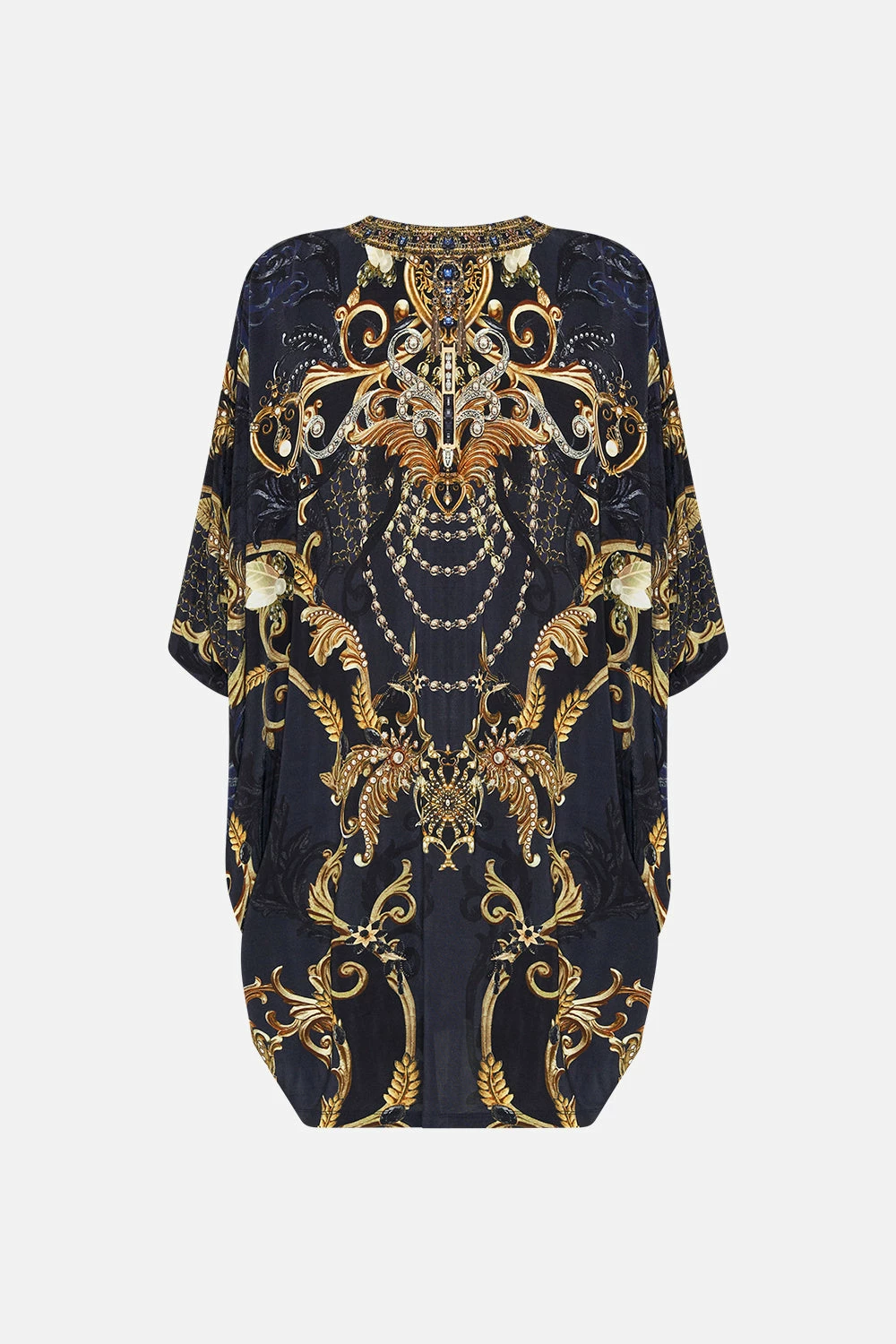 The Moonlight Melodies Bat Sleeve Dress dips into an arrangement of gold and deep ebony flourishes highlighted with strands of chains, pearls and diamond motifs. An elevated take on everyday comforts, this luxury mini dress plays host to a relaxed silhouette, cropped sleeves that dance at the elbows, a contrasting deep v neckline, side draped details and signature CAMILLA crystal embellishments. Lovingly handcrafted and designed in Australia, explore more from The Moral Of The Story: Act II collection.