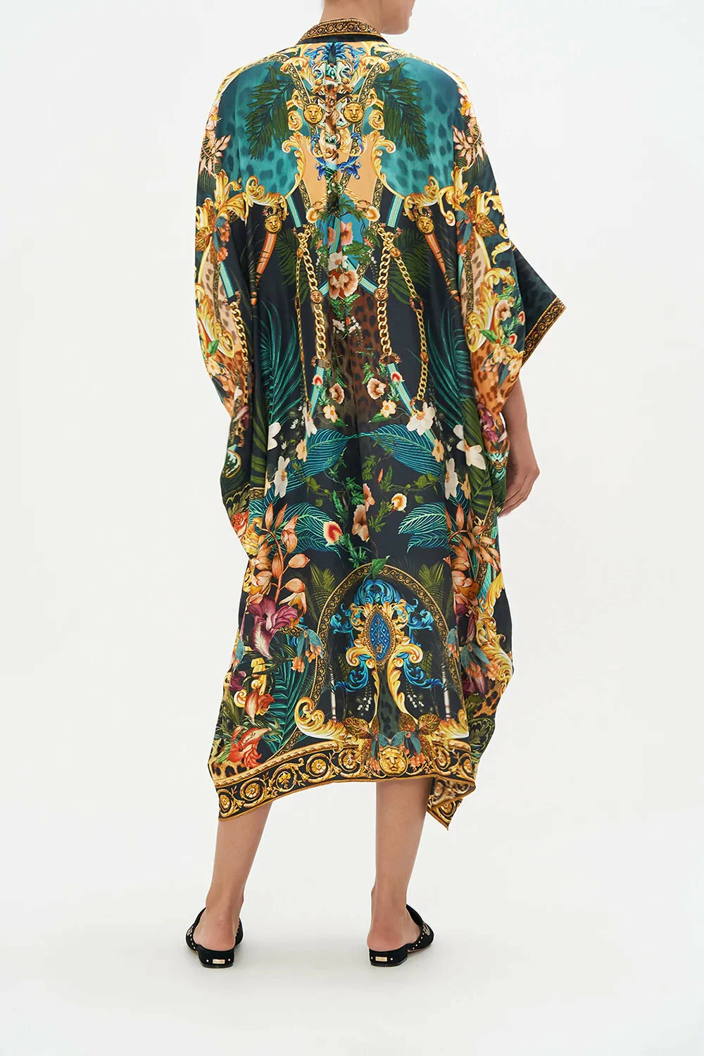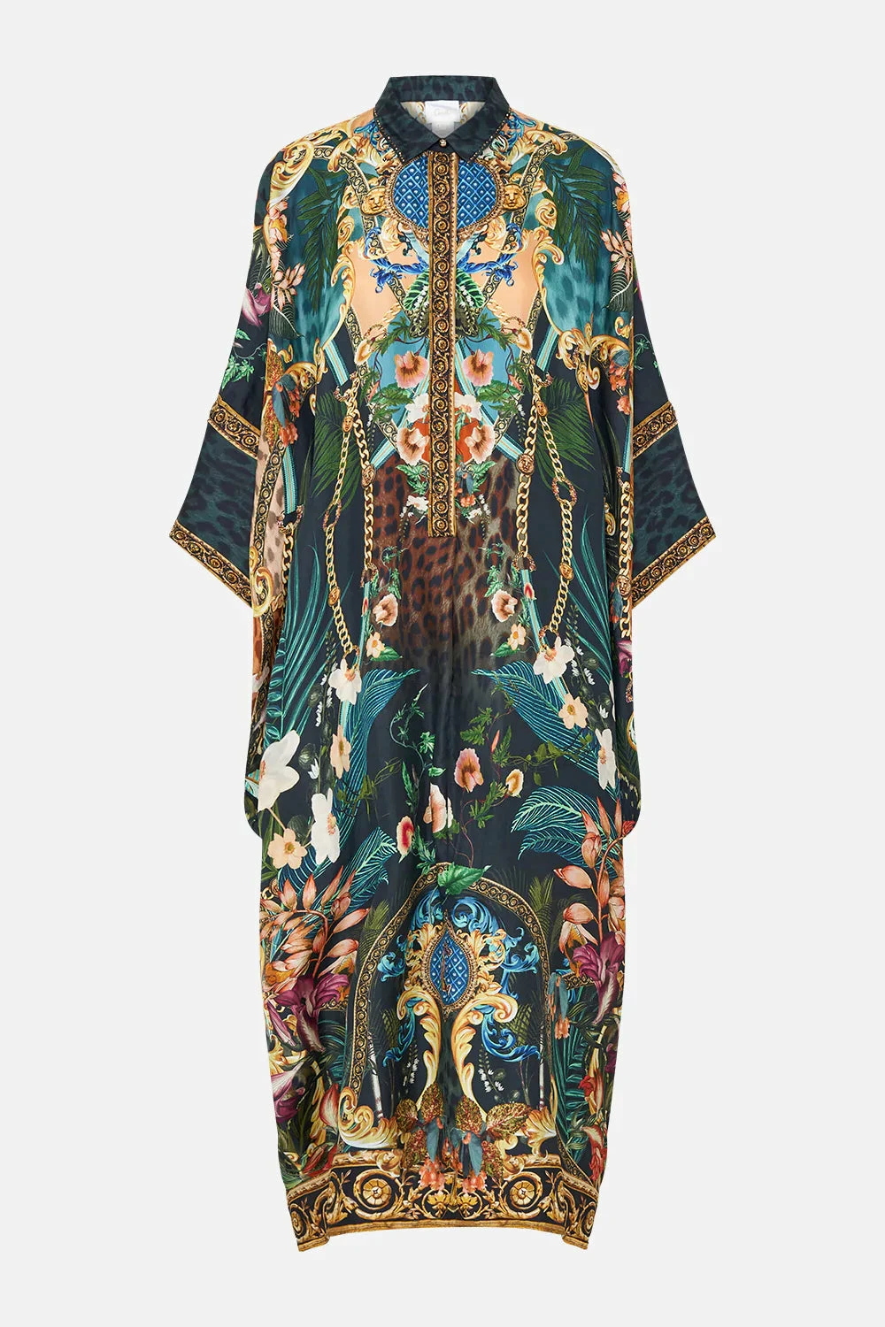 The Fearless Felis Batwing Kaftan steals our gaze with a sea of rich midnight hues enveloped by gold chain details, cascades of forest ferns and soft botanicals dipped in honey hues that bloom from emerald vines. Complete with hand-embellished CAMILLA crystals, this luxury silk kaftan features statement raglan sleeves, an effortlessly relaxed silhouette, a structured collar and wide statement cuffs.