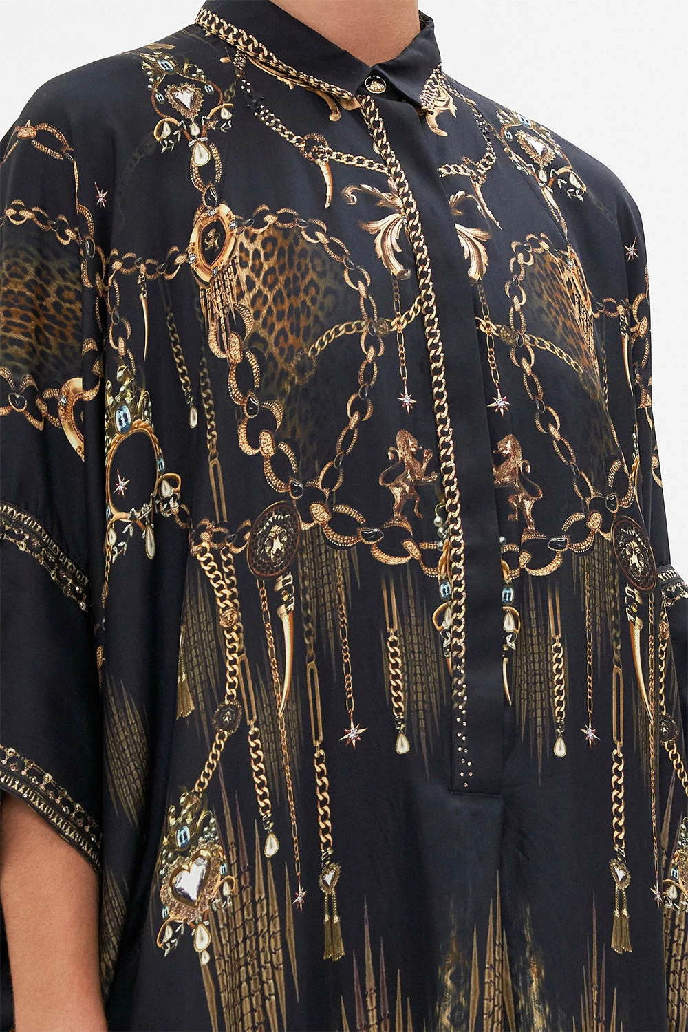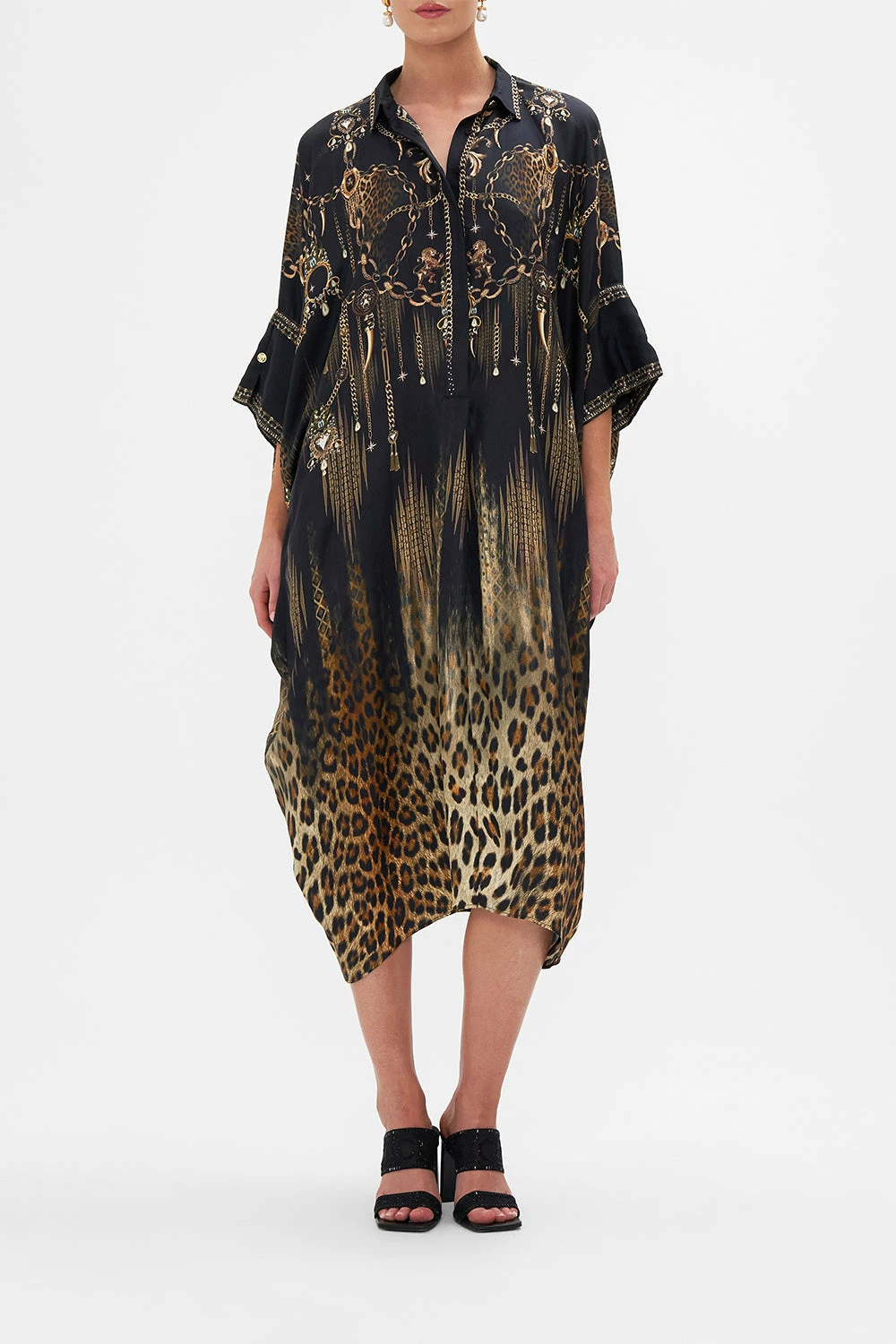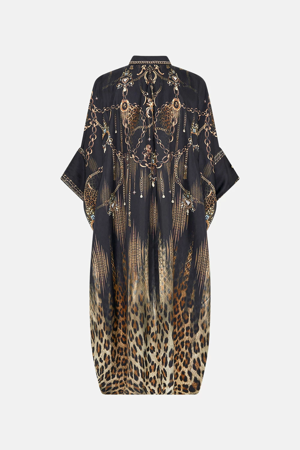 The Jungle Dreaming Batwing Kaftan is a tantalising vision of wild animal and tribal inspired geo patterns. A melding arrangement of glimmering chains, charms and topaz highlights. Complete with hand-embellished CAMILLA crystals, this luxury silk kaftan features statement raglan sleeves, an effortlessly relaxed silhouette, a structured collar and wide statement cuffs. Lovingly handcrafted and designed in Australia, explore more from The Moral Of The Story: Act II collection.