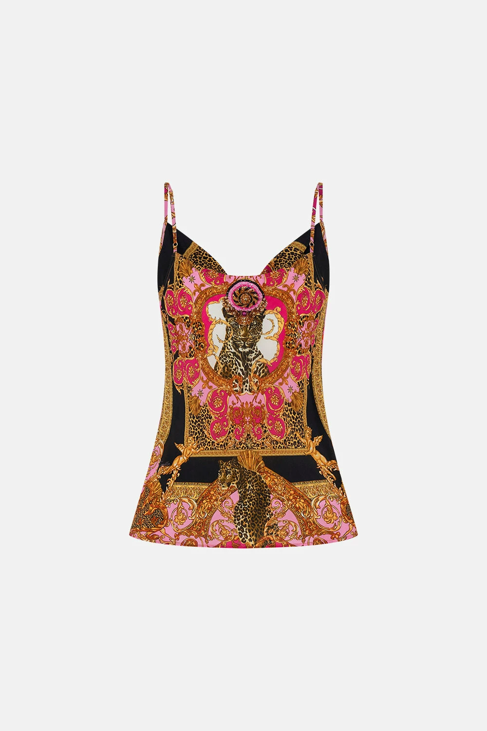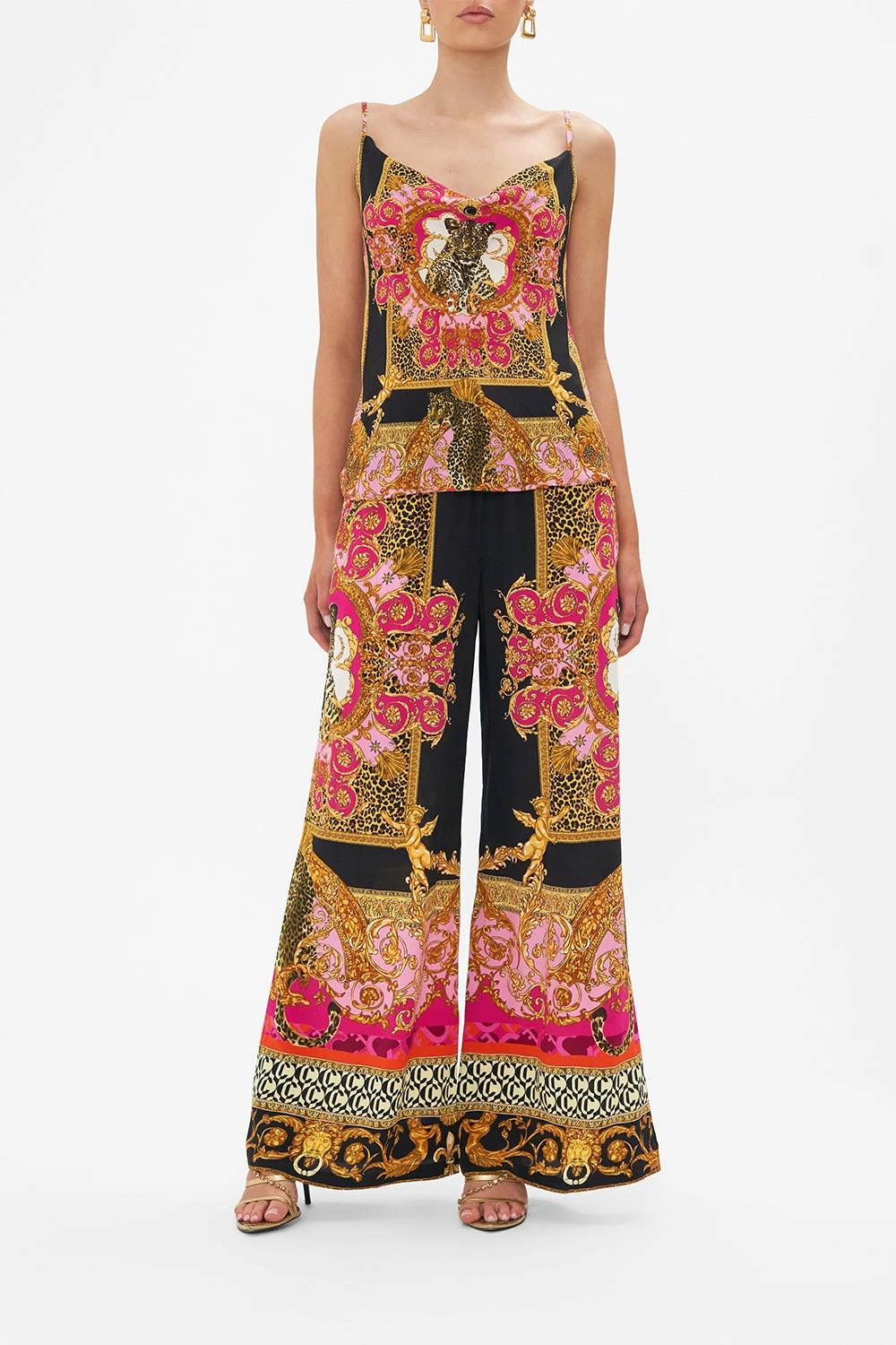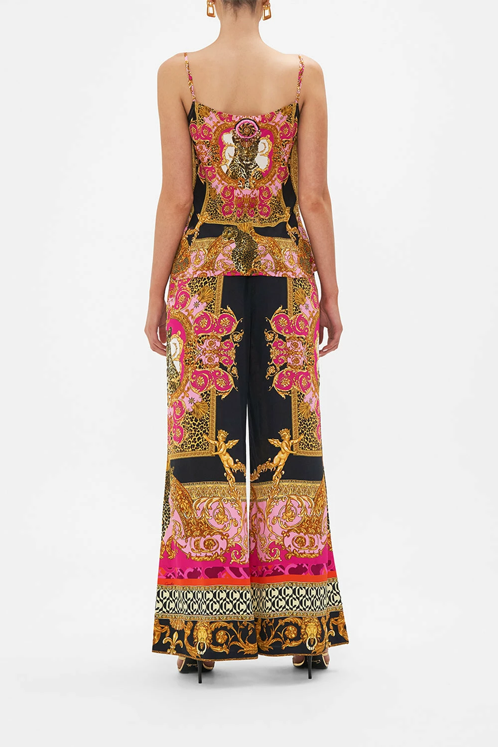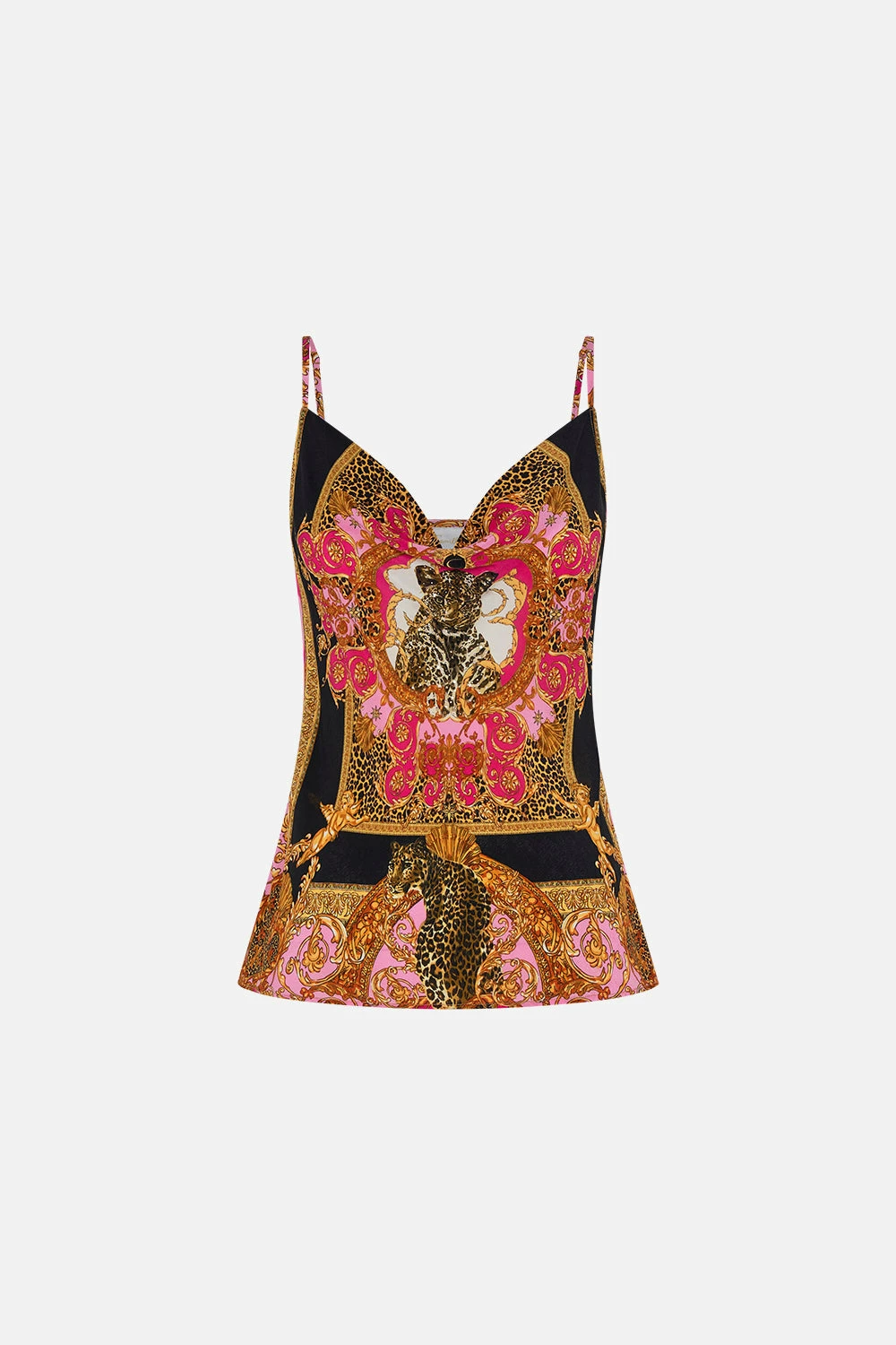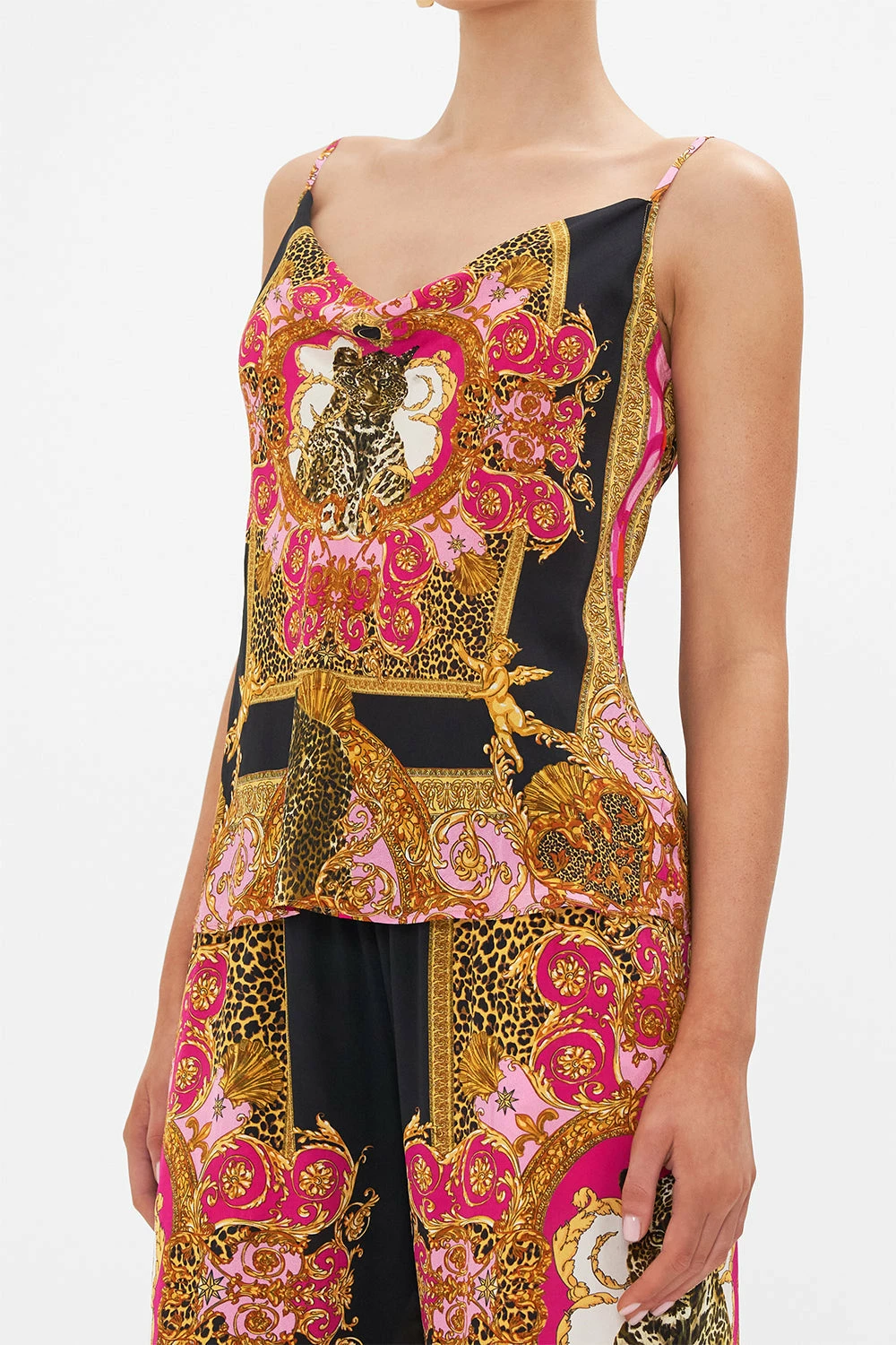 The Ciao Palazzo Bias Cami captures beautiful border prints entwined with bright feline moments reminiscent of vintage Italian scarf motifs. Adorning CAMILLA crystals, this luxury silk camisole plays host to a softly draped cowl neck, a relaxed bodice that leads into a flared hemline and customisable rouleau straps. Wear with matching Ciao Palazzo Lounge Pant for stunning head-to-toe print perfection. Lovingly handcrafted, designed in Australia. Explore more from the Amore Mio collection.