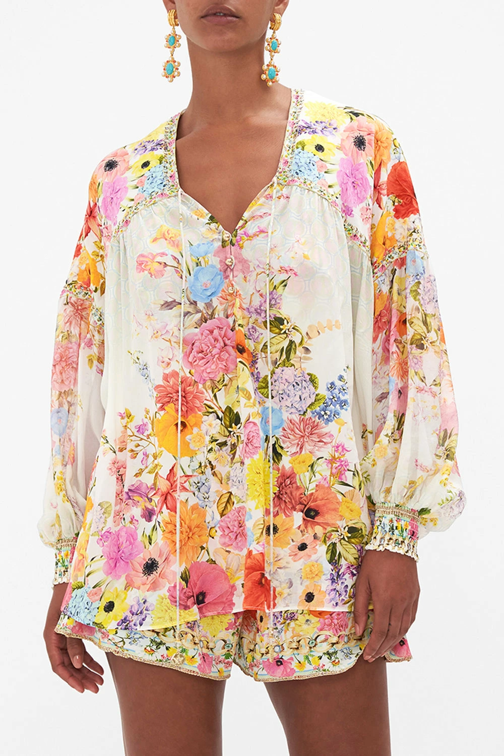 The Sunlight Symphony Blouson Blouse With Neck Tie captivates the eye with a soft pink hue finished with poppies wrapped in gentle blues, carnations in blushing tones and the delicate cascade of leafy vines. Adorning hand-embellished CAMILLA crystals, this luxury blouse features a statement blouson sleeve, dainty neck-tie details, shirred cuffs and gathered accents that define the bodice before meeting a delicately flared hemline.