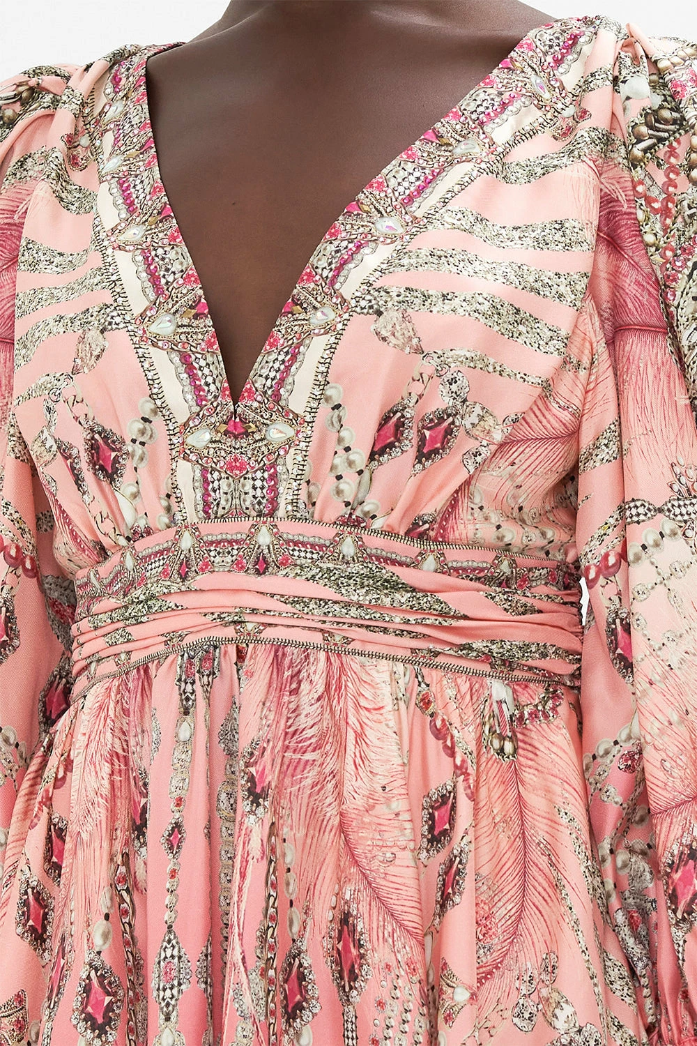 Complete with hand-placed CAMILLA crystals, this luxury silk dress features a deep v neckline, voluminous blouson sleeves, a relaxed mini silhouette that falls into a decadent flare hemline and a fitted waist to cinch and shape.