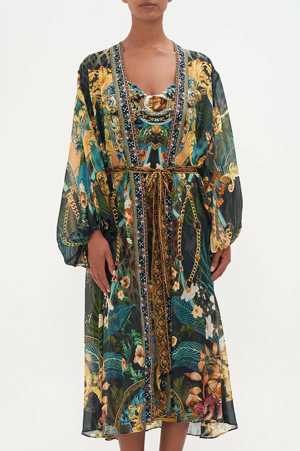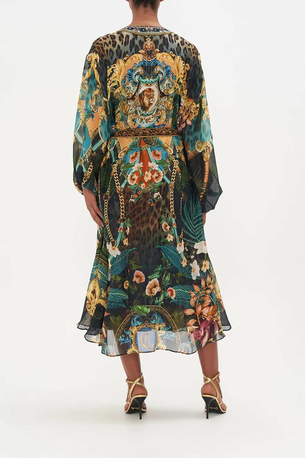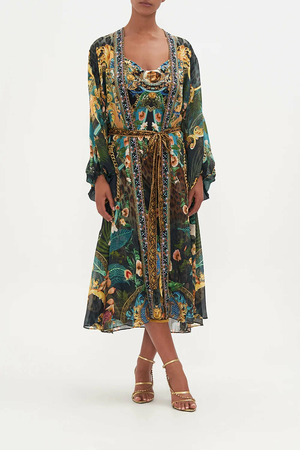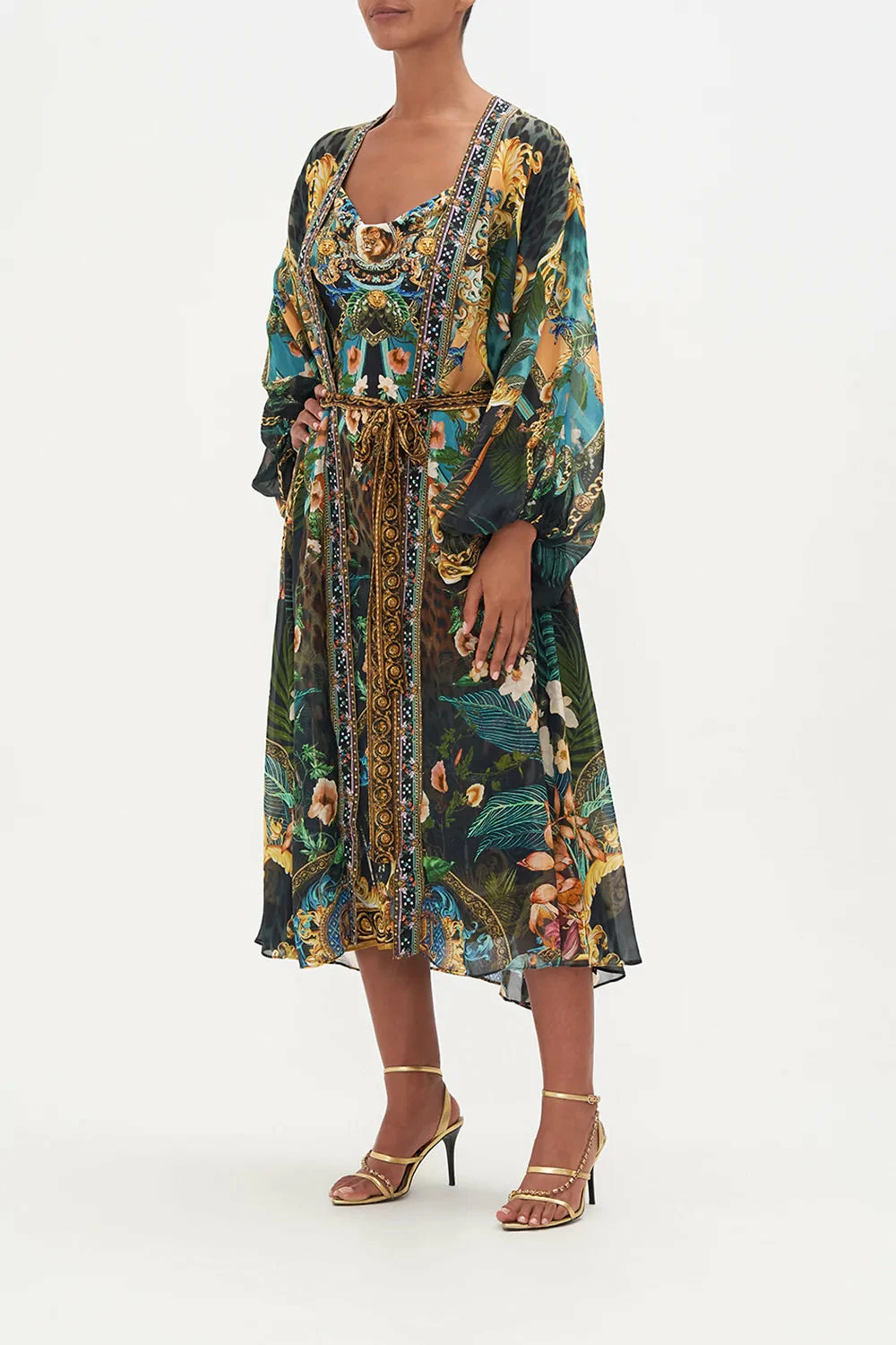The Fearless Felis Blouson Sleeve Layer is enwrapped in a sea of sheer midnight hues enveloped by gold baroque details, cascades of forest ferns and soft botanicals dipped in honey hues that bloom from emerald vines. Complete with hand-embellished CAMILLA crystals, this luxury silk layer features statement blouson sleeves that cascade at the wrist, contrasting neck bands and a relaxed maxi silhouette.