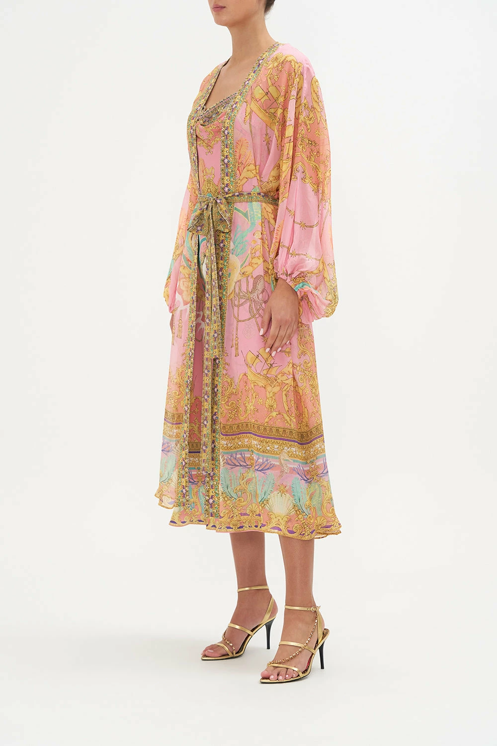 The transeasonal layer oozing extravagant elegance, our Mermaid Motel Blouson Sleeve Layer is enwrapped in a delicate bubblegum pink adorning mermaid portraits, golden rope cascades, pops of celestial blues and treasures of the sea. Complete with hand-embellished CAMILLA crystals, this luxury silk layer features statement blouson sleeves, contrasting neck bands and a relaxed maxi silhouette.