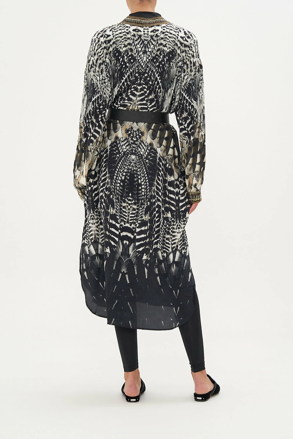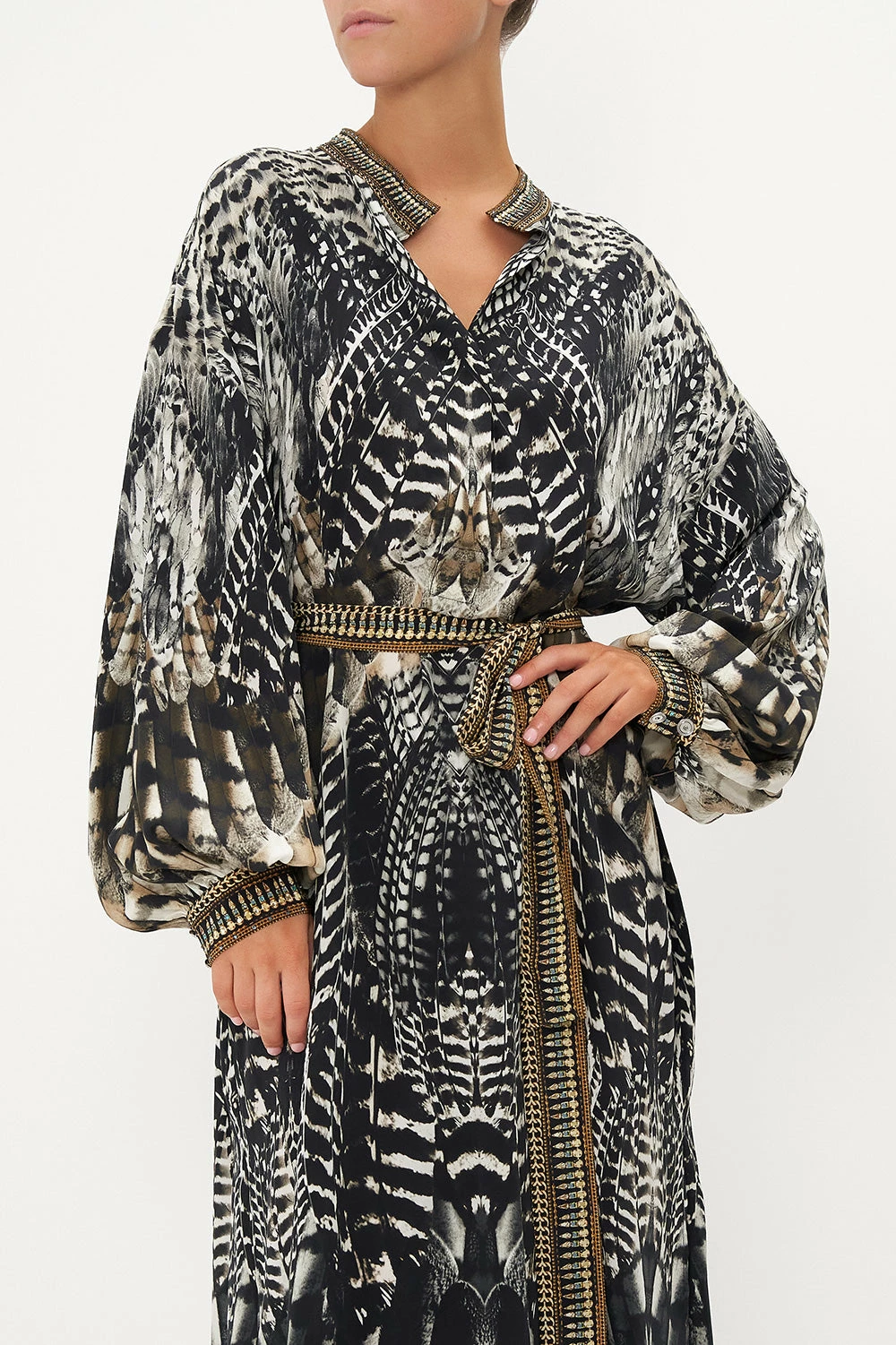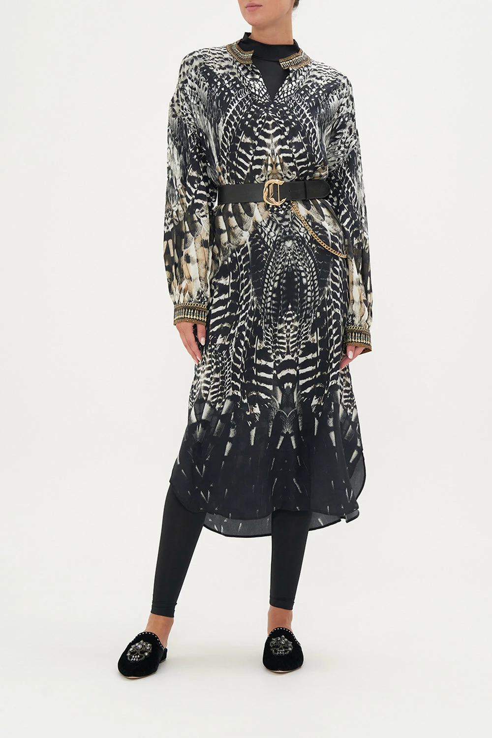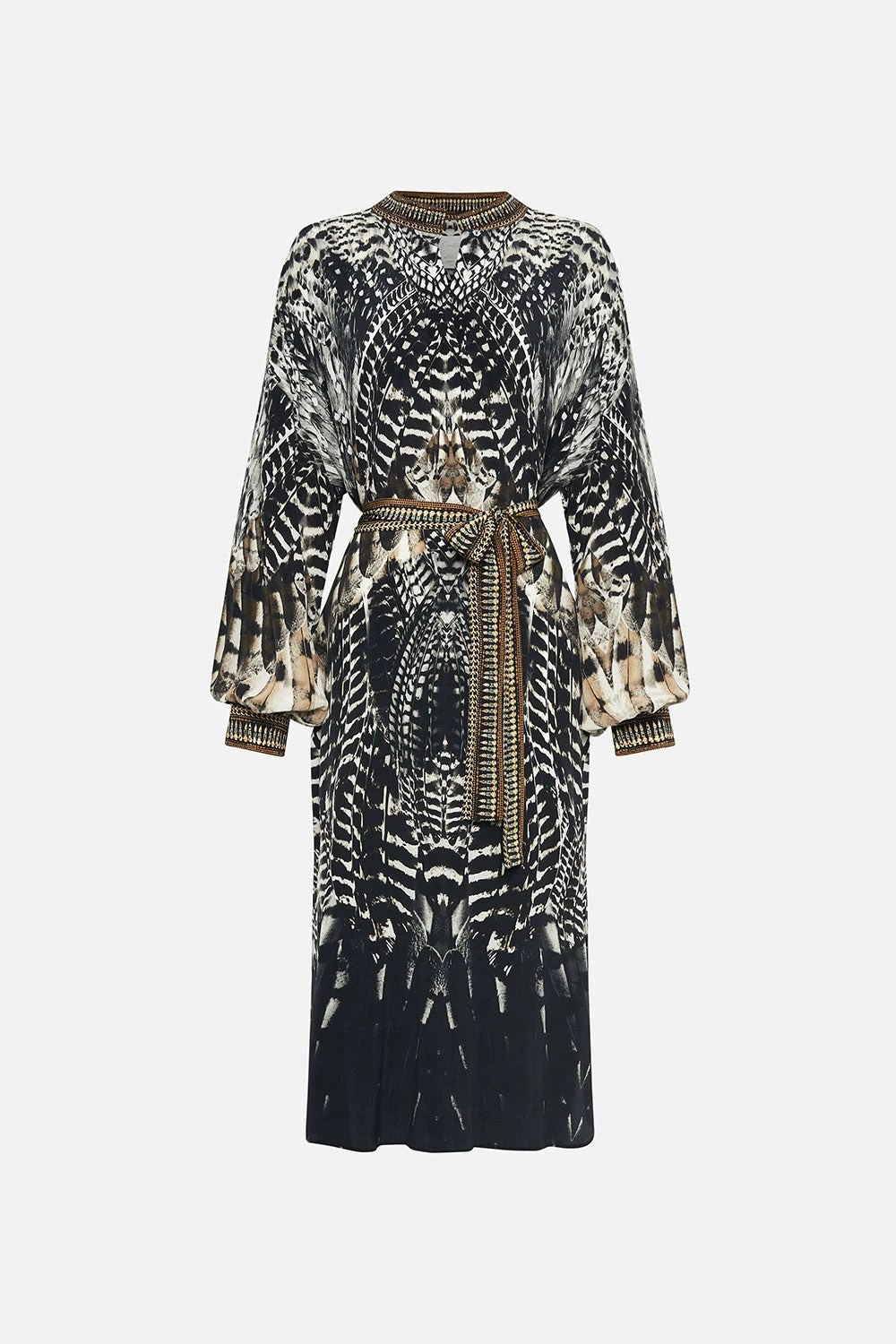 Whisking us into nocturnal majesty amidst the canopies, our Night Owl Blouson Sleeve Placket Dress paves the way for a deep midnight hue adorned with cascades of ivory featherings, moments of mocha and wispy white owl details. Finished with hand-embellished CAMILLA crystals, this luxury silk dress features a full blouson sleeve that dances at the wrist, a high-low mini shaped hemline, placket button fastening and a relaxed silhouette.