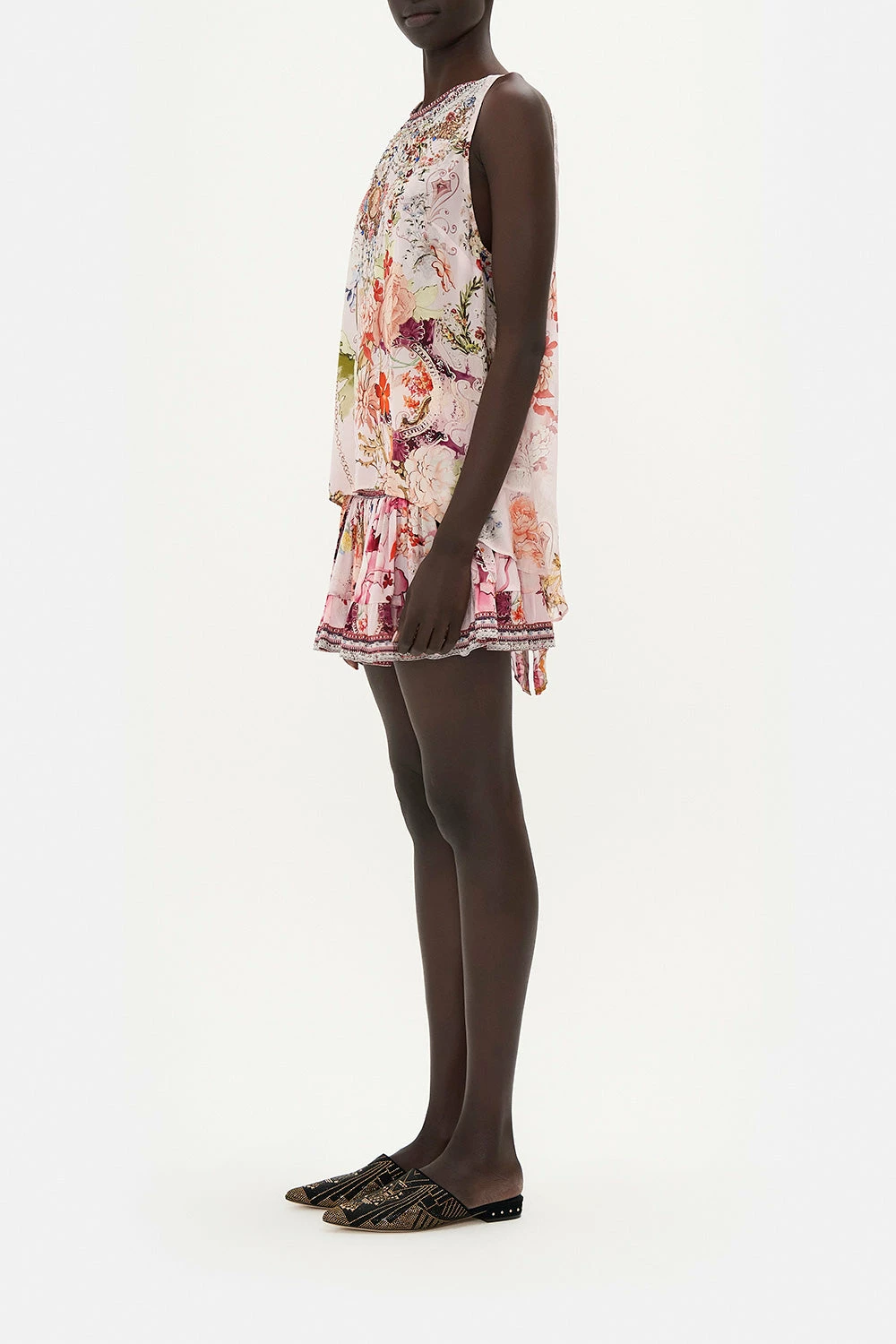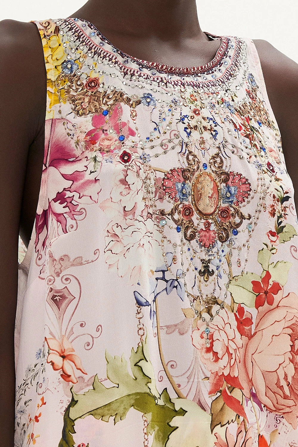 A bouquet of springtime botanicals, the St Germains Girl Button Back Top enwraps our gaze in a light mauve adorning the delicate bloom of blush peonies, muted wreaths and ornate swirls that weave their way throughout. Crafted with hand-embellished crystal adornments, this luxury silk blouse features button fastening upon the back, a curved high-low hemline made perfect for French tucks and a relaxed sleeveless silhouette. Elevate your everyday by styling with light denim and a sneaker.