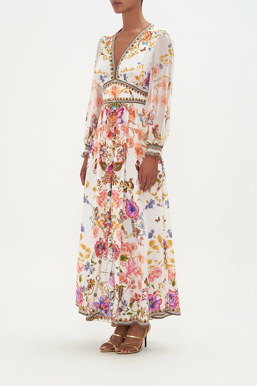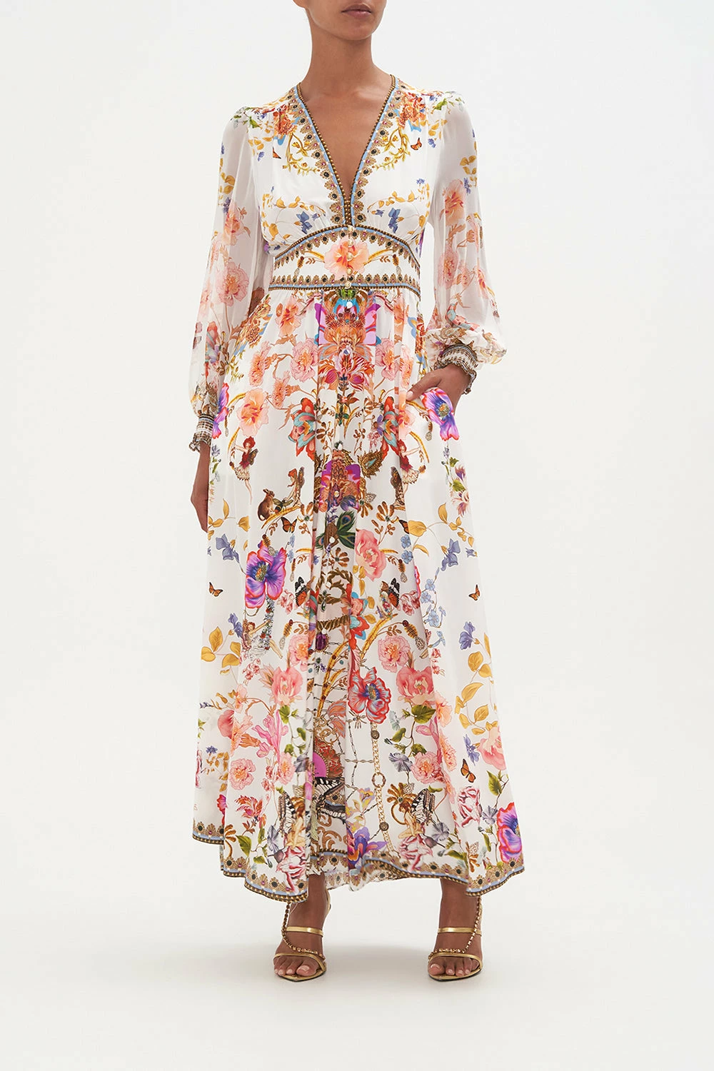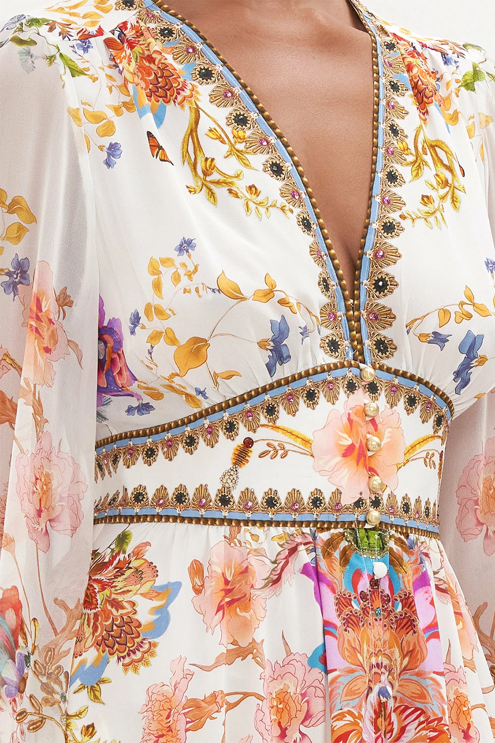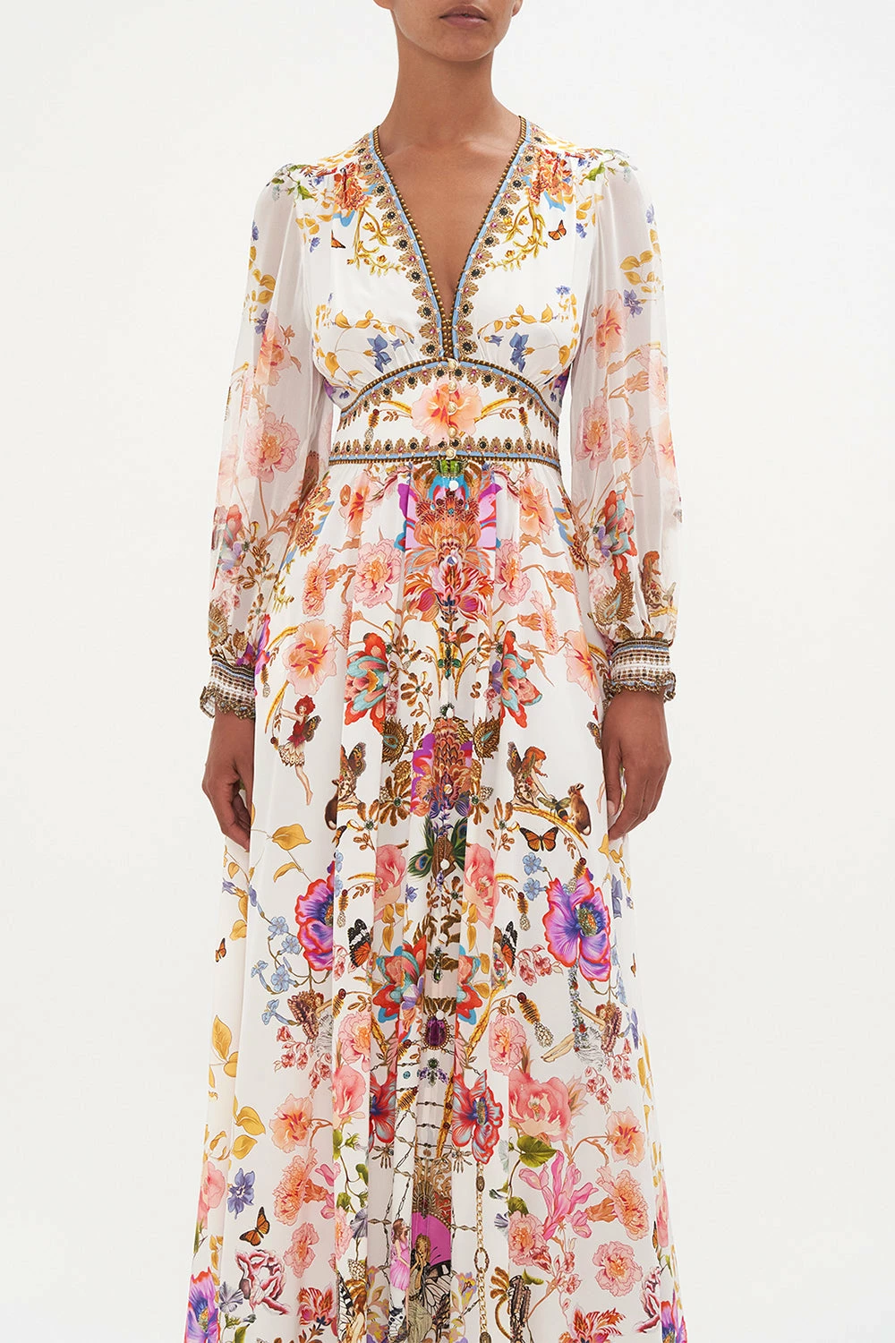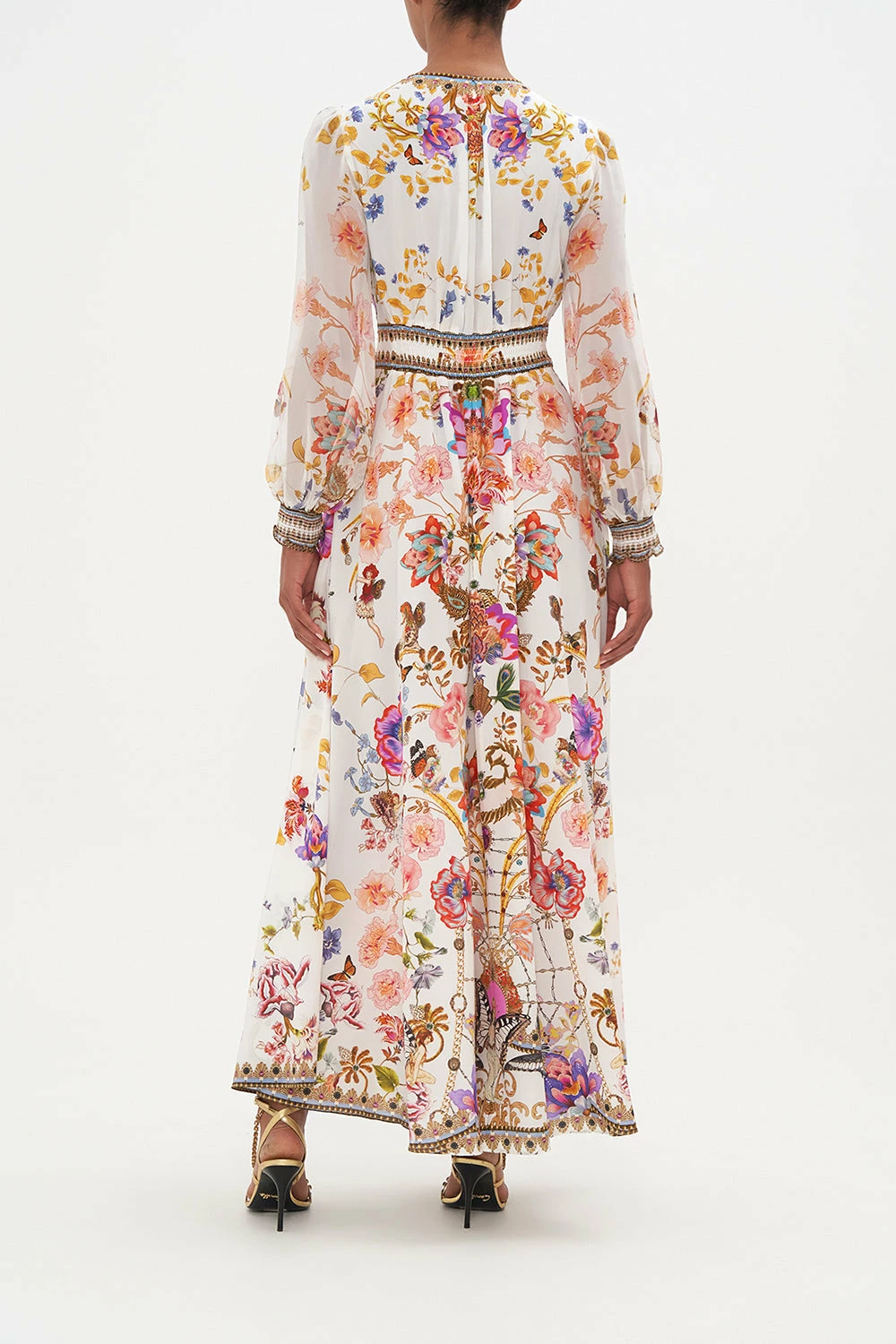 The Spider Girl Button Dress With Shaped Waistband is enveloped in a sea of white hues complete with blooming blush botanicals, intricate webs dipped in golden hues and dainty fairies that dance amidst butterflies and gentle spirits. Crafted from signature CAMILLA silk, this luxury evening dress features a shaped waistband adorned by button details, hand-embellished crystals, a delicate blouson sleeve and a relaxed maxi silhouette that dances just above the ankle.