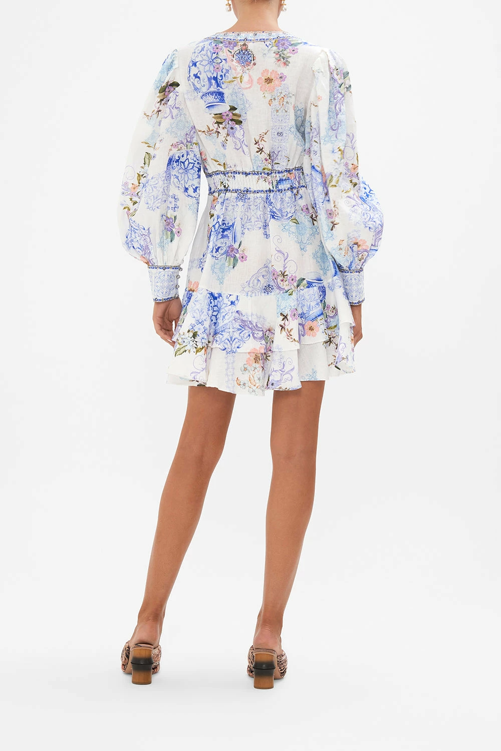The Paint Me Positano Button Front Frill Dress explores the magical pathways of intricate Italian tile mosaics entwined with delicate pastel florals. Complete with crystal embellishment, this luxury linen CAMILLA mini dress is home to voluminous blouson sleeves, an elegant low cut v neckline that meets delicate button detailing down the centre. The fitted waistband to cinch in the waist falls into a relaxed two-tier skirt that adds a moment of poetic billow. Lovingly handcrafted, designed in Australia. Explore more from the Amore Mio collection.