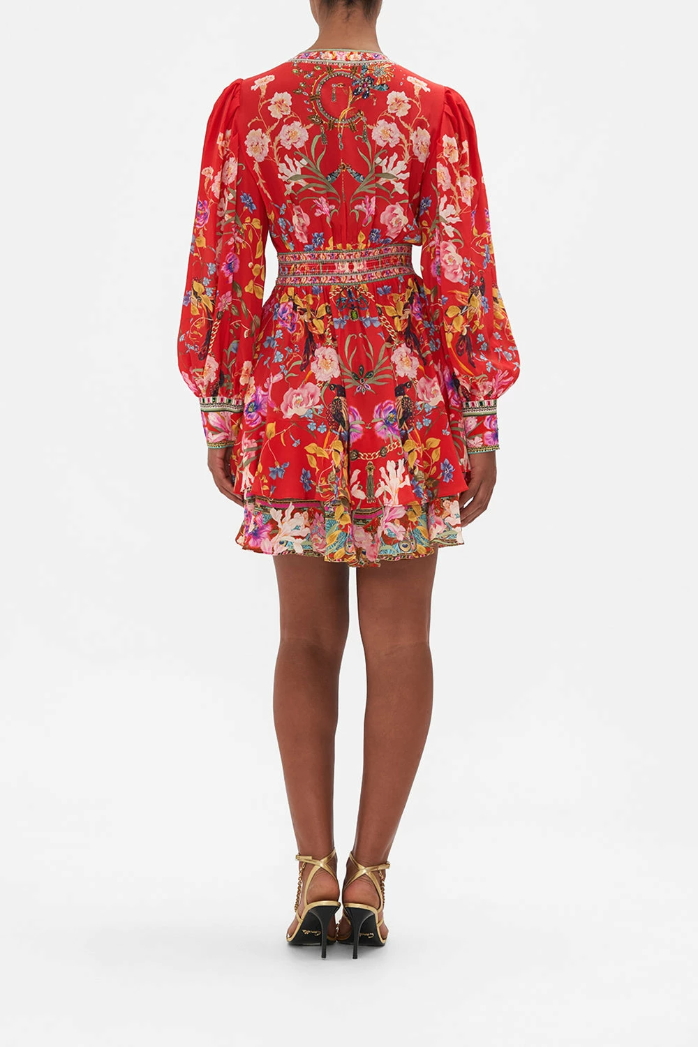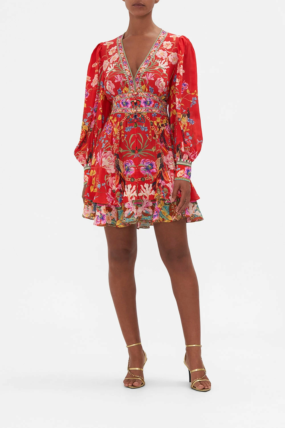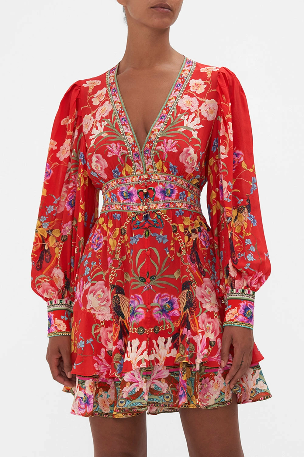 The Ruffle Some Feathers Button Front Frill Dress encases our imagination in vermillion red hues defined by the cascading feathers of peacock majesty, rivers of golden vines that float amidst chain detailing and frilly carnations that tantalise in soft-spoken pinks. Complete with hand-placed crystal embellishment, this luxury silk dress is home to voluminous blouson sleeves made to make a statement, delicate button detailing down the centre, a cinched waistband and a relaxed two-tier hemline that adds a moment of poetic billow.