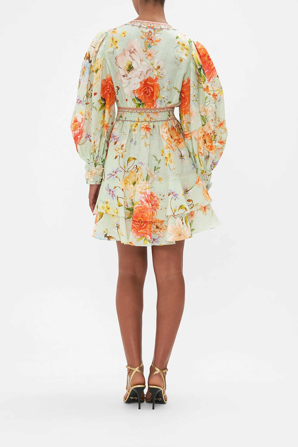 The Talk The Walk Button Front Frill Dress is a sensual immersion of fragrant blooms. Subtle glimmers of hidden jewels and gold flourishes dancing amongst a soft mint ambiance. Complete with hand-placed crystal embellishment, this luxury silk dress is home to voluminous blouson sleeves designed to make a statement, an elegant low cut v neckline meets delicate button detailing down the centre, a fitted waistband to cinch in the waist falls into a relaxed two-tier skirt that adds a moment of poetic billow. Lovingly handcrafted and designed in Australia, explore more from The Moral Of The Story: Act II collection.