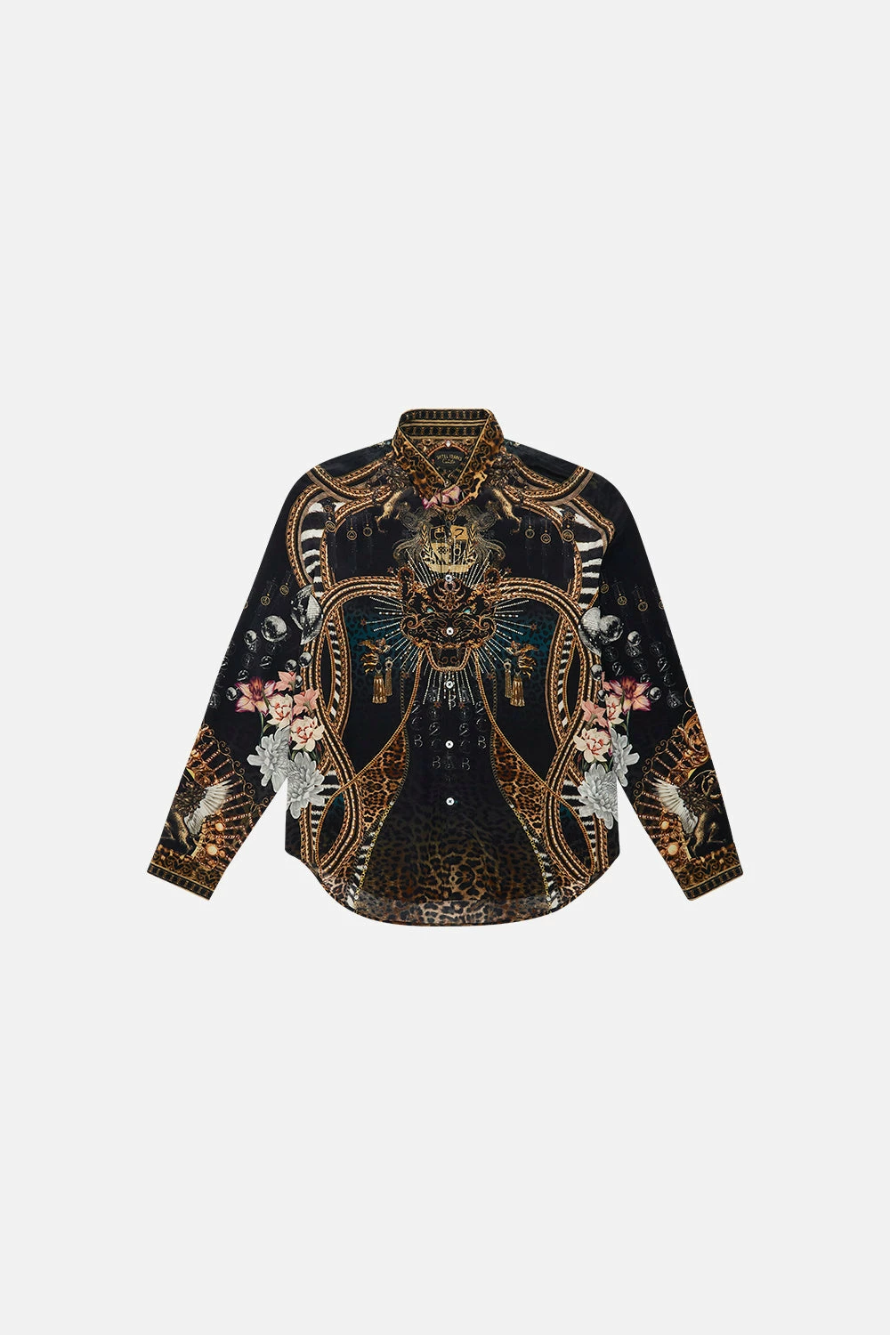 Exclusive to our CAMILLA x Robbie Williams collection, the Rockstar Royalty Collared Long Sleeve Shirt meets midnight hues encased in splashes of classic leopard print, bouquets of soft-spoken botanicals and ornate gold architecture that dances amidst disco dreams. This luxury silk shirt features a relaxed silhouette, button closure, classic structured collar and contrast borders at the cuffs.