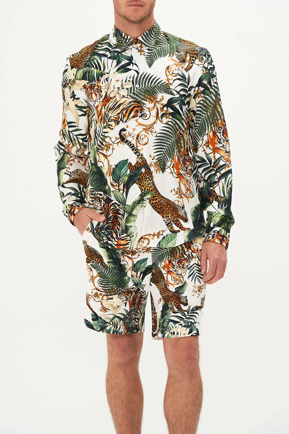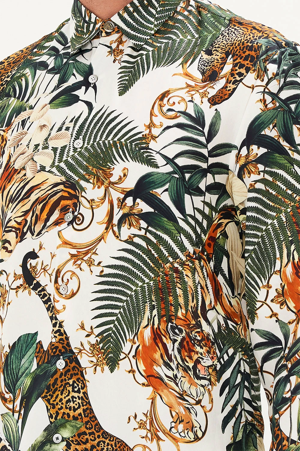 Enwrapping your everyday essentials in the untamed essence of animalia, our Tiger Trap Collared Long Sleeve Shirt embodies vivid ivory hues, cascades of forest ferns, gold baroque detailing and the electric pounce of the tiger. Crafted from decadent silk, this luxury men’s shirt features a relaxed silhouette, a classic structured collar, button details and metallic hardware.