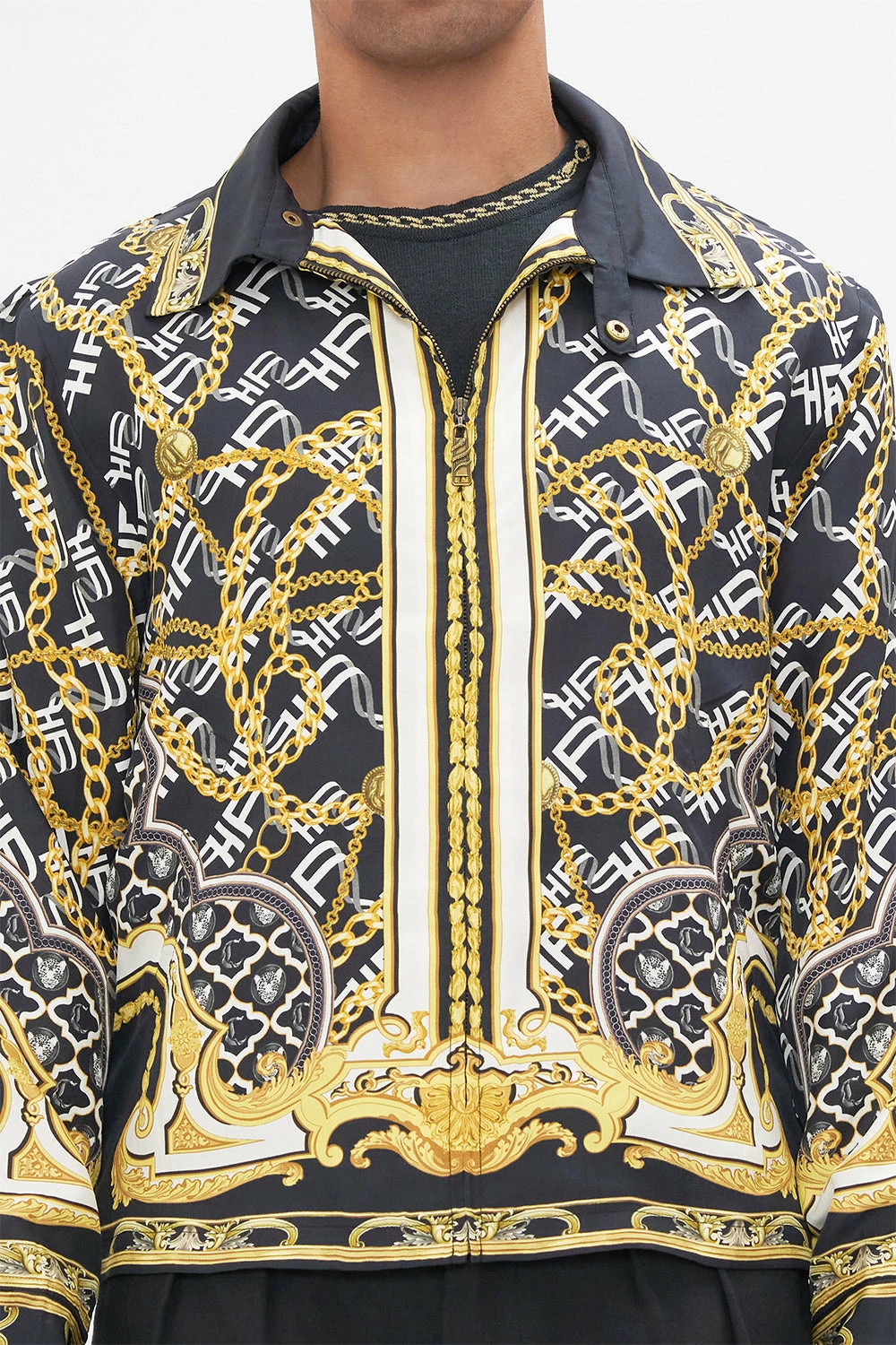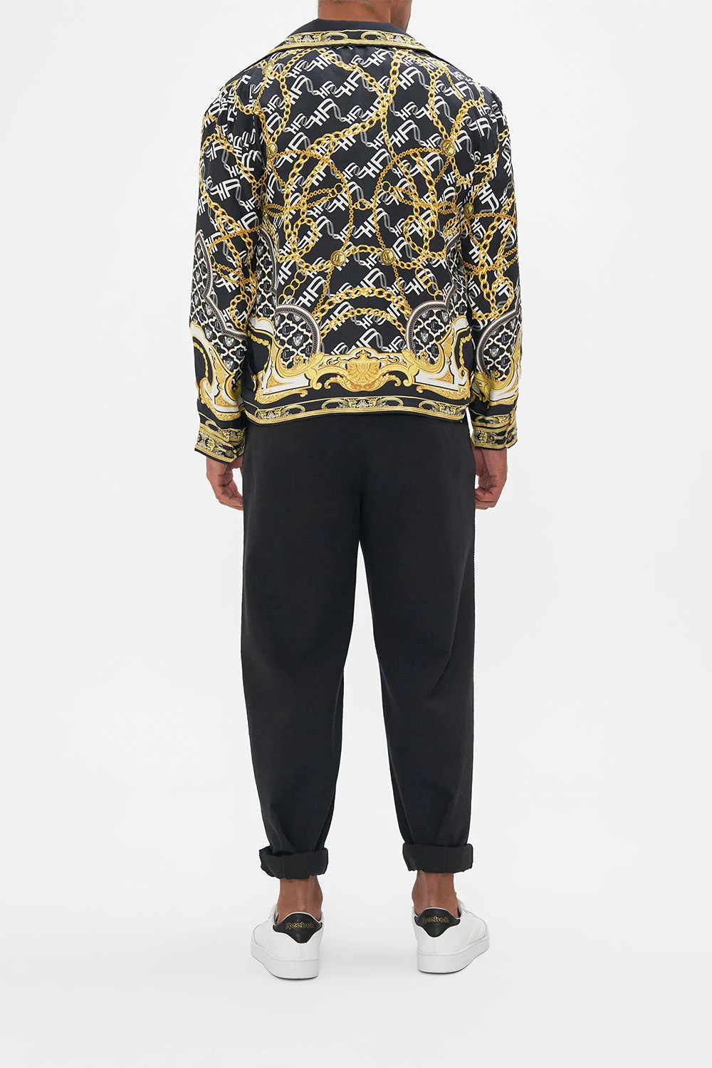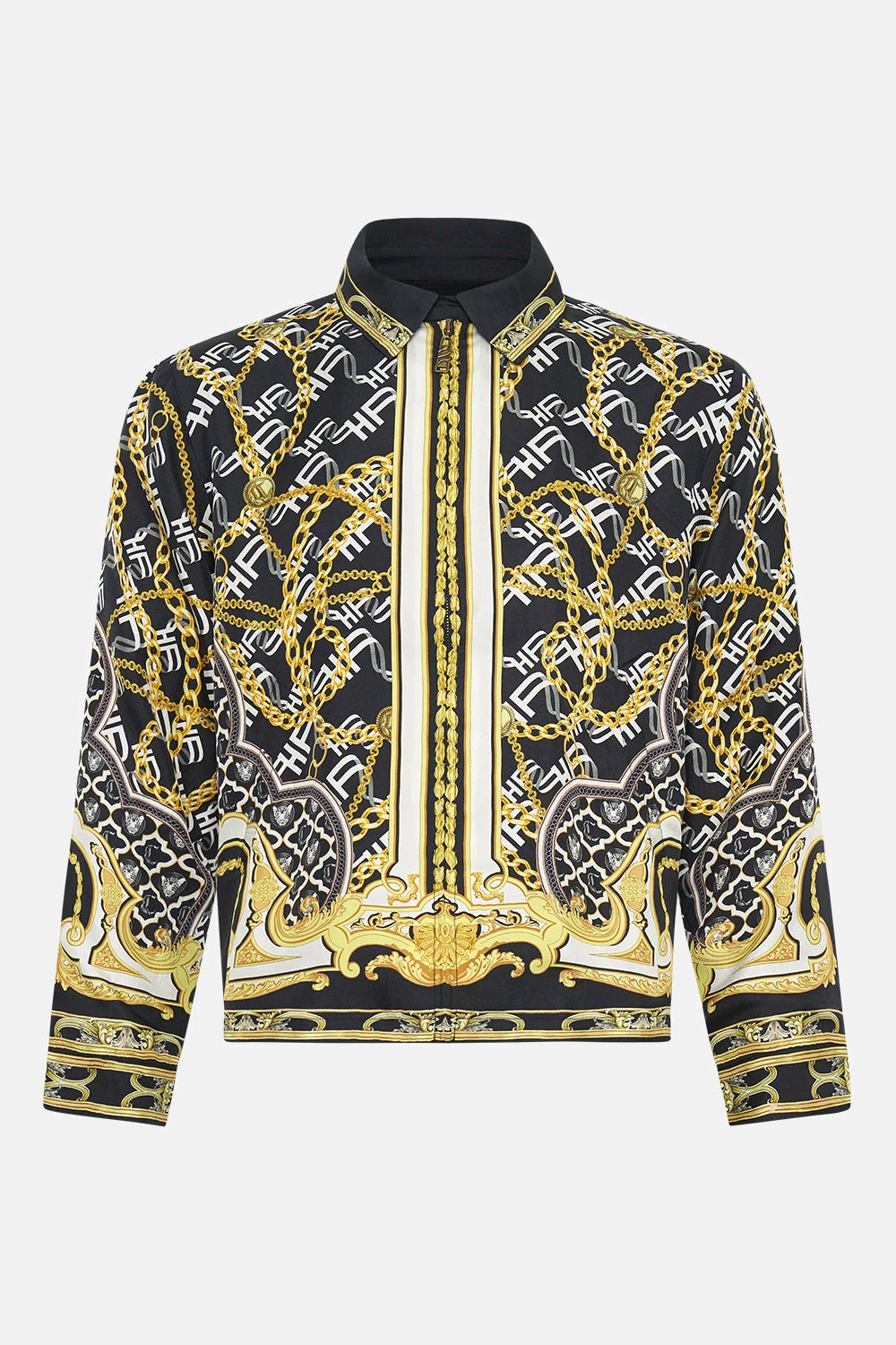 The Tether Me Not Cropped Zip Through Jacket is an immersion into an opulent world of sleek palatial curves, offset with sharp monogram mosaic patterns. Gilded baroque adornments and chains glimmer against graphically bold onyx and ivory contrasts. Crafted for effortless trans-seasonality, this luxury silk jacket features adjustable side tabs on hem, zip fastening enclosure, pocket functionality, soft tailored collar and a casually relaxed fit silhouette. Lovingly handcrafted, designed in Australia, explore more from The Moral Of The Story: Act II collection.