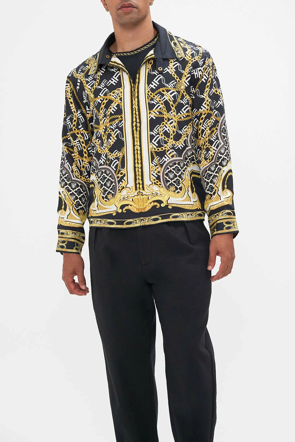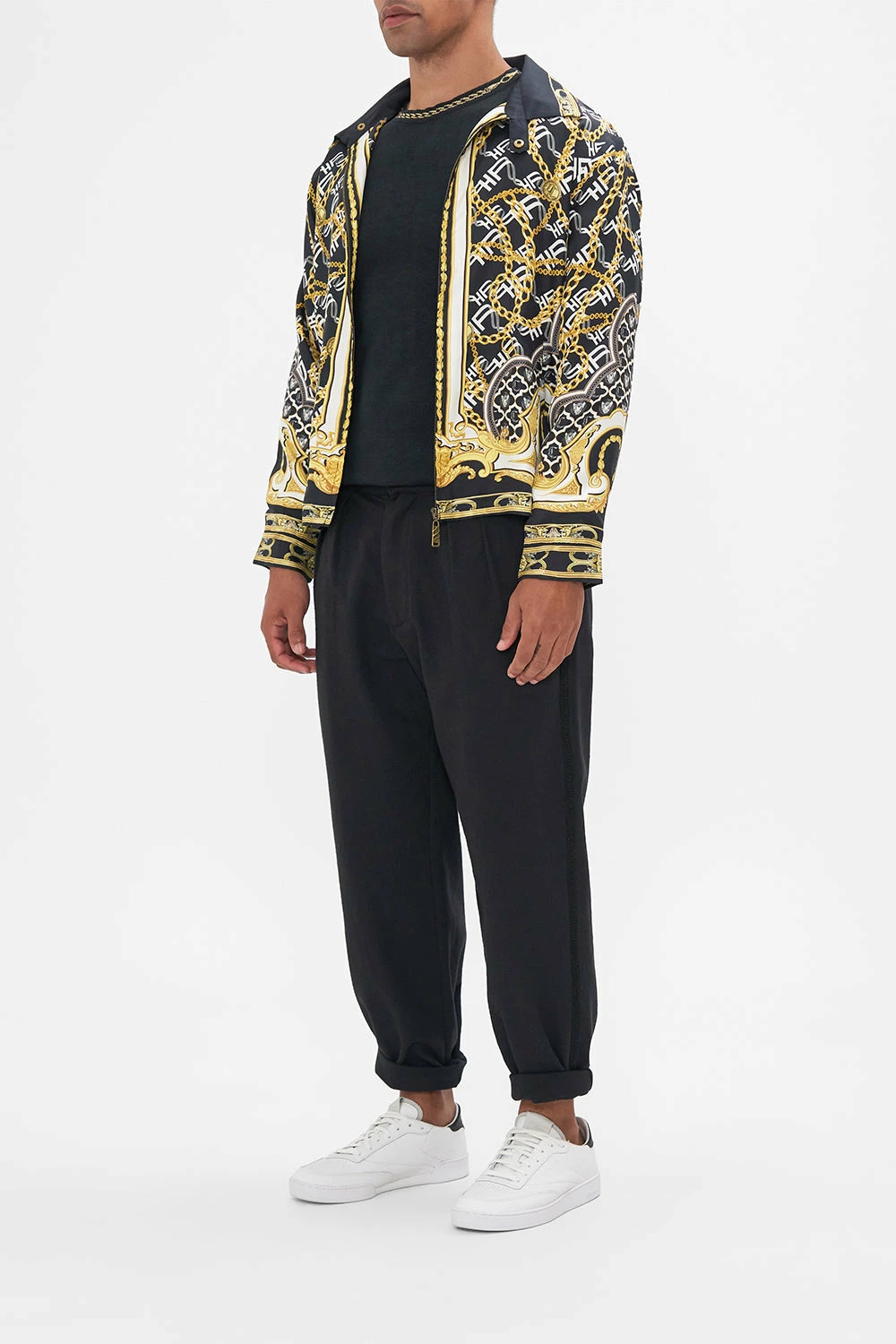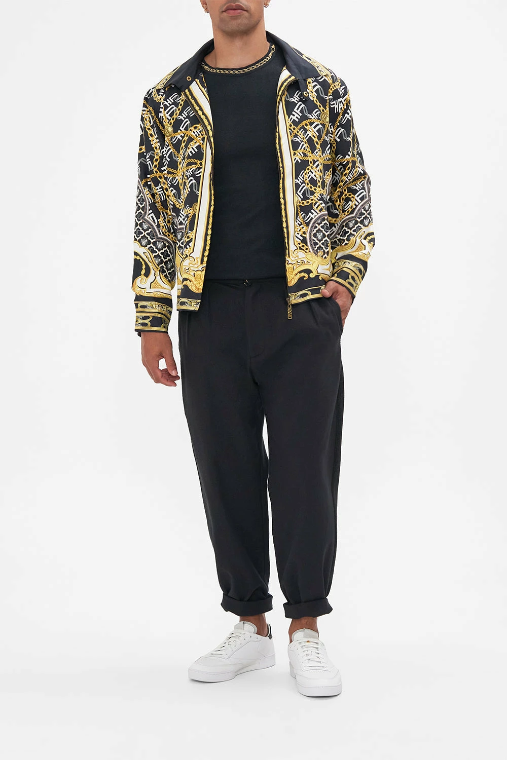 The Tether Me Not Cropped Zip Through Jacket is an immersion into an opulent world of sleek palatial curves, offset with sharp monogram mosaic patterns. Gilded baroque adornments and chains glimmer against graphically bold onyx and ivory contrasts. Crafted for effortless trans-seasonality, this luxury silk jacket features adjustable side tabs on hem, zip fastening enclosure, pocket functionality, soft tailored collar and a casually relaxed fit silhouette. Lovingly handcrafted, designed in Australia, explore more from The Moral Of The Story: Act II collection.