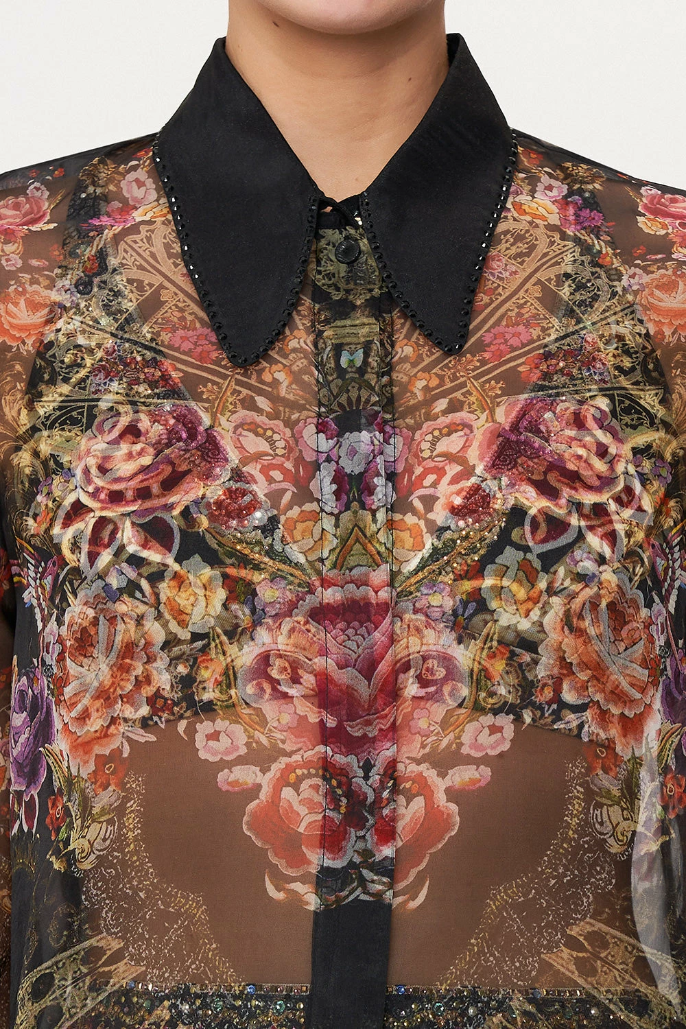 The classic shirt reimagined with Spanish bohemia, the Dance With Duende Curved Collar Blouse is enwrapped in midnight hues, opulent gold fans, bouquets of botanicals and golden cascades. Adorning hand-embellished CAMILLA crystals, this luxury silk shirt features a delicate blouson sleeve, gold button hardware, a structured collar and a relaxed silhouette.