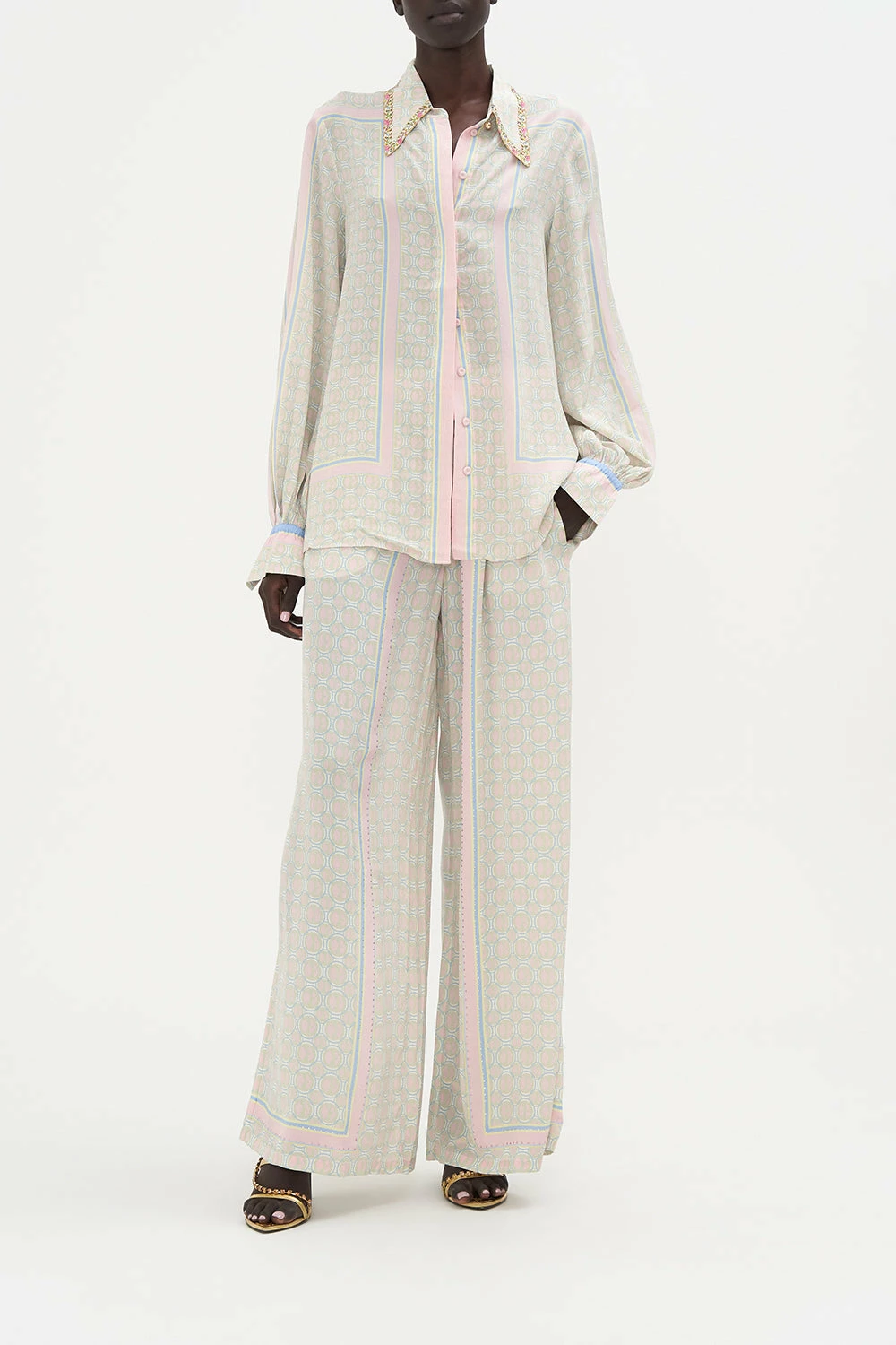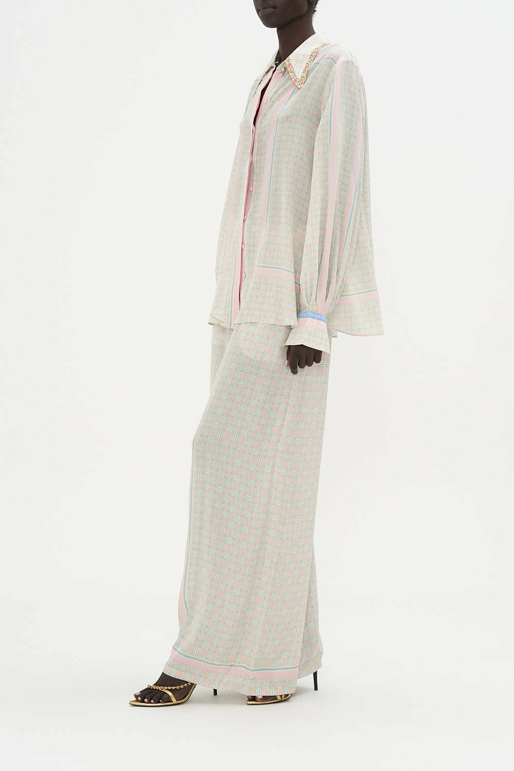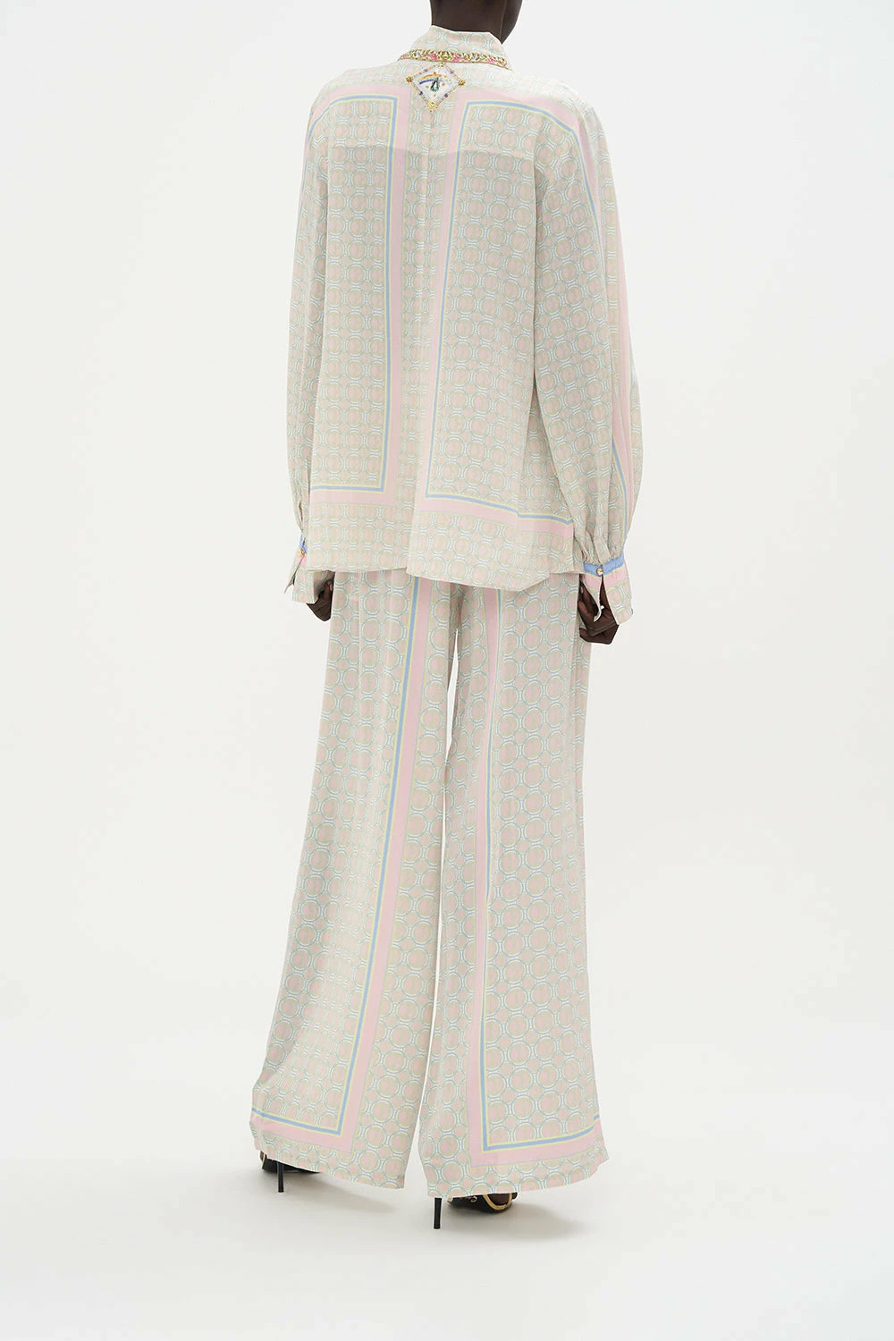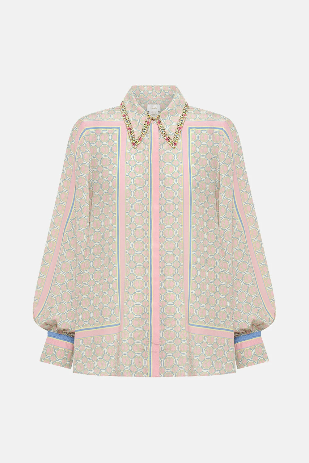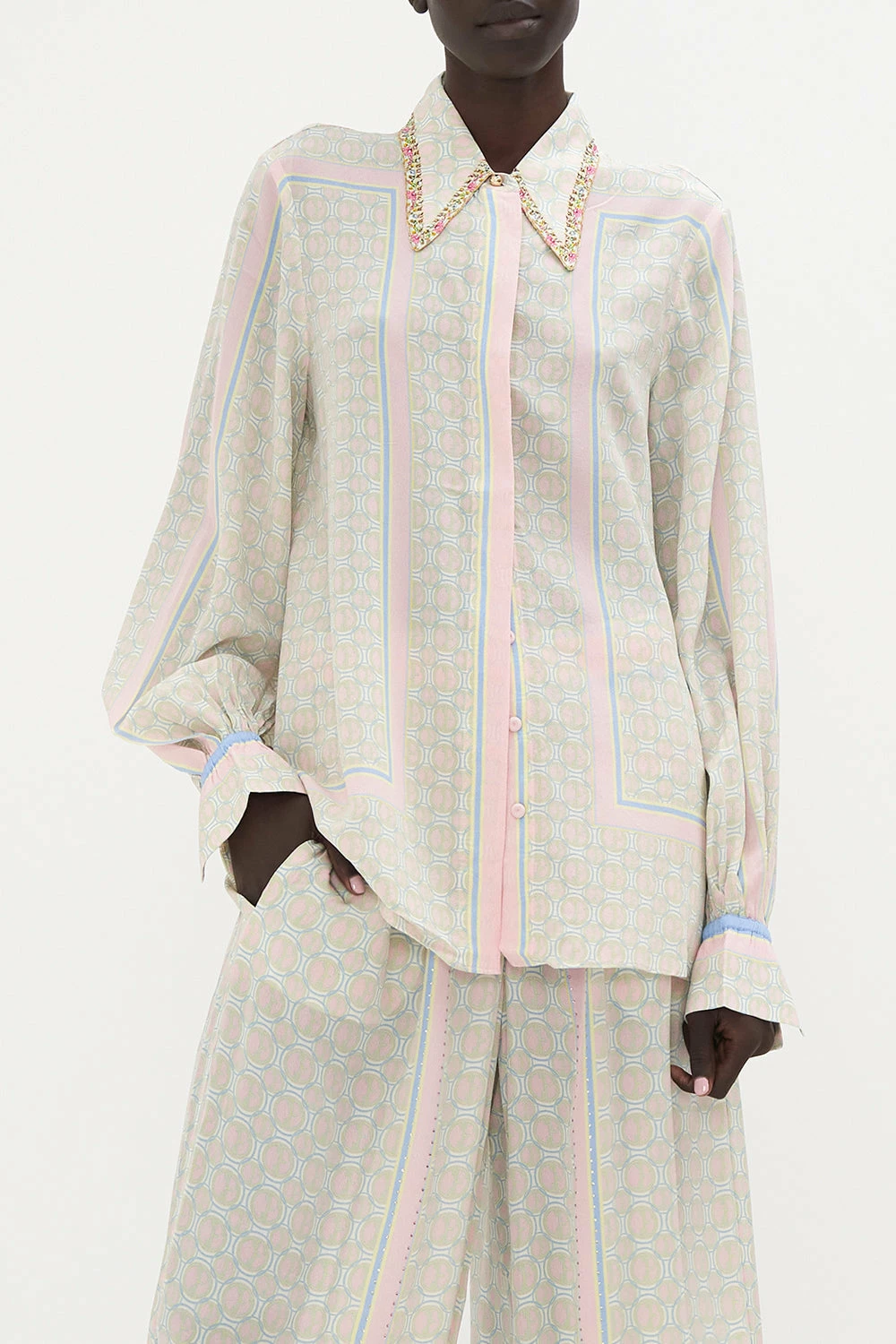 The Sunlight Symphony Curved Collar Blouse captivates the eye with geometric print adorning shades of gentle pinks, sky blues and washes of soft ivory. Adorning hand-embellished CAMILLA crystals, this luxury silk shirt is finished with a delicate blouson sleeve falling into a wide split cuff, button front enclosure, a structured embellished collar and a relaxed fitting silhouette.