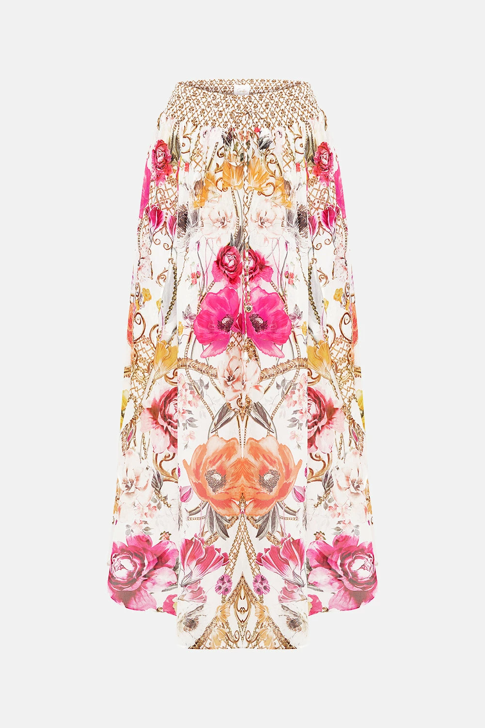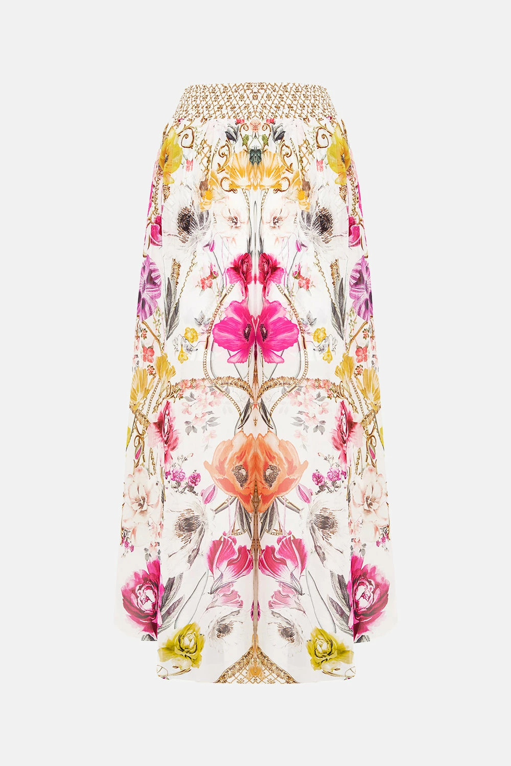 The Destiny Calling Curved Hem Pant is a sweet sonnet of bright feminine florals cascading across a gate of fine golden lattice and baroque flourishes. Complete with hand-embellished CAMILLA crystals, these luxury silk pants feature an elasticated high-rise waist with drawstring accents, gold hardware detailing, a softly shaped hemline that dips into a soft billow and an effortlessly relaxed silhouette. Lovingly handcrafted and designed in Australia, explore more from The Moral Of The Story: Act II collection.