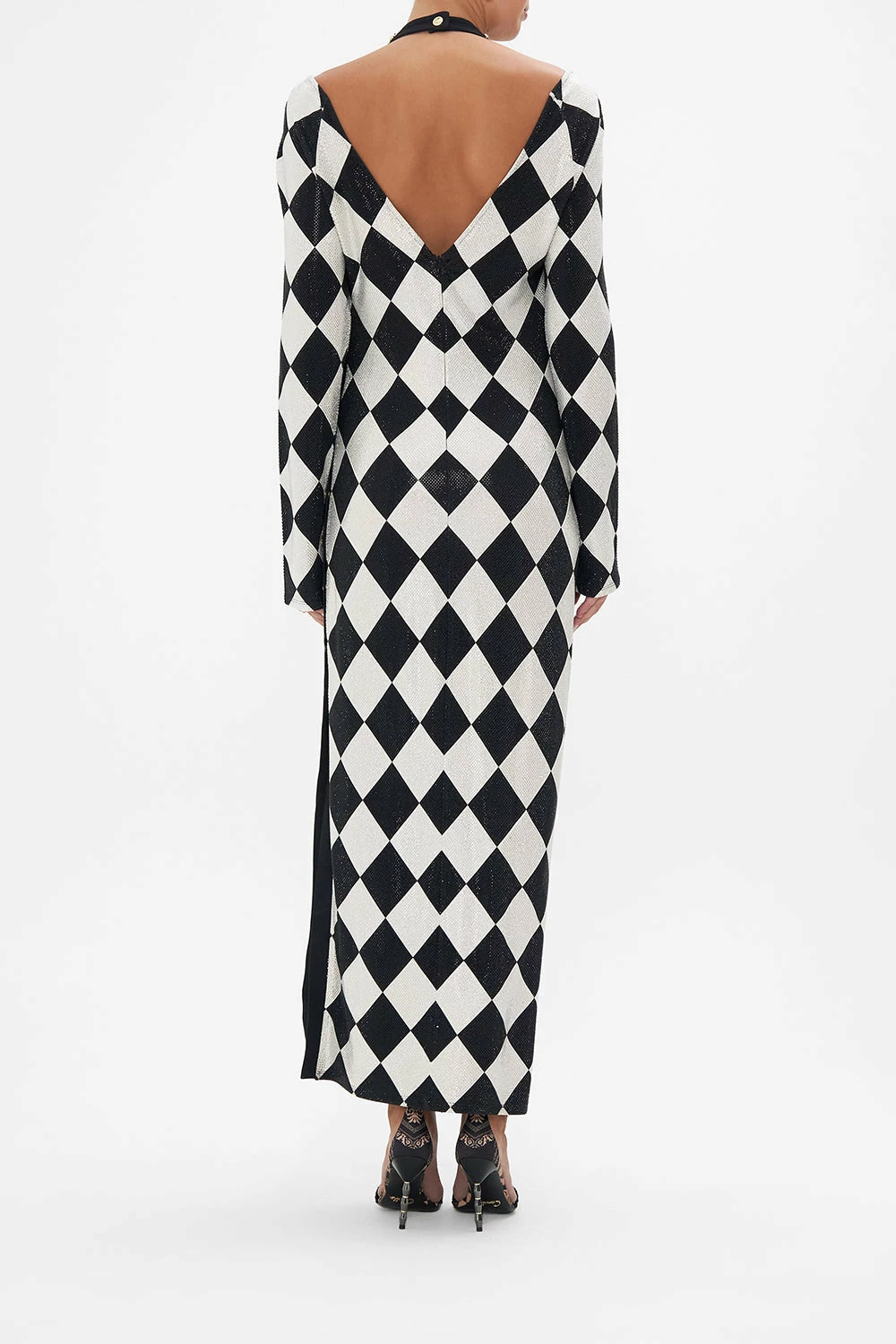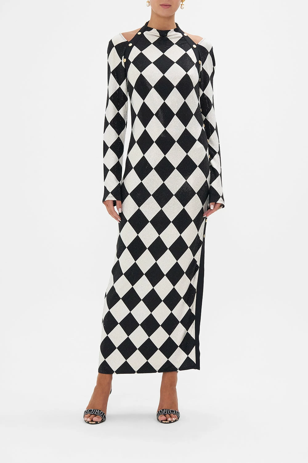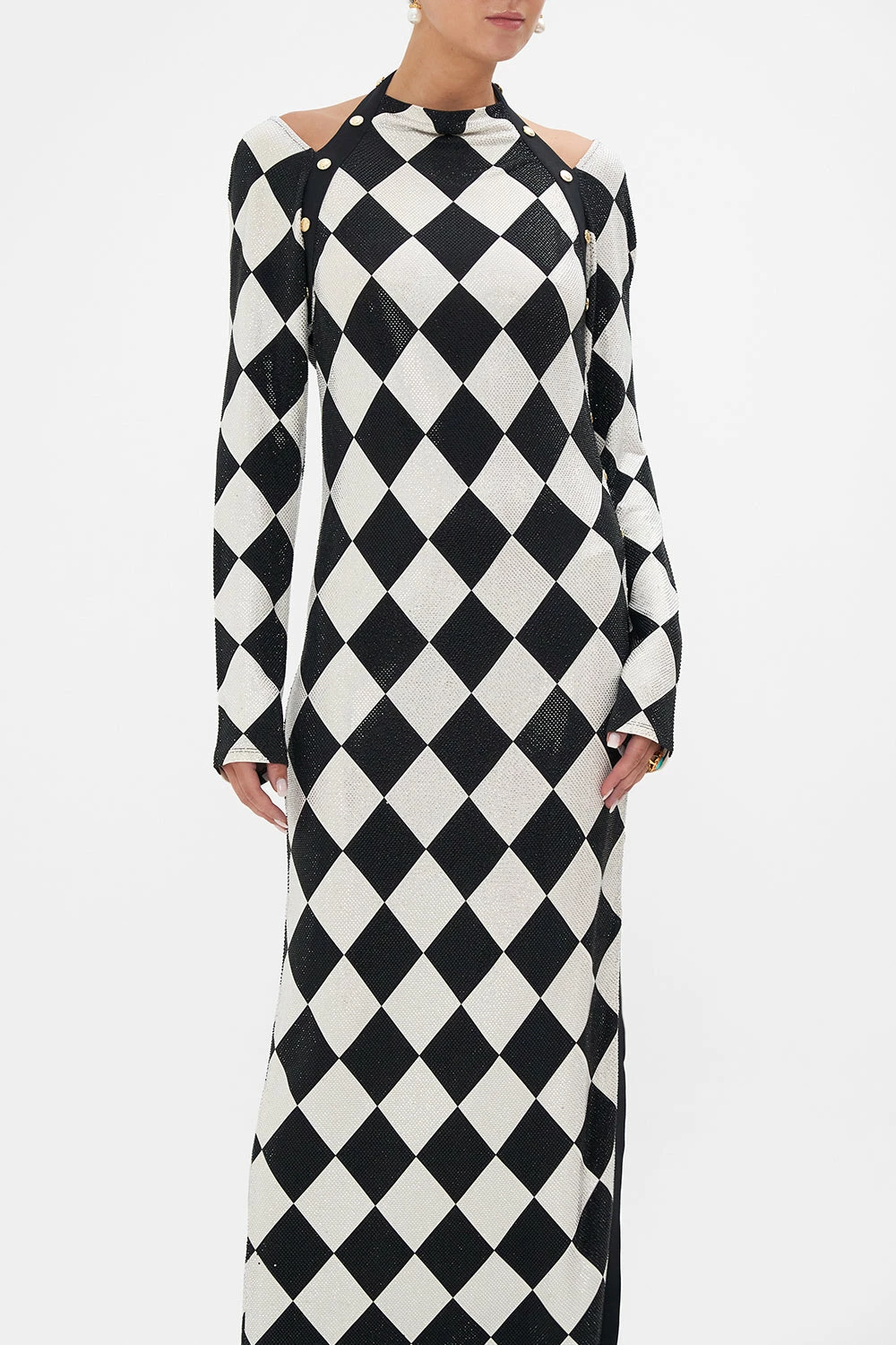 The Duomo Dynasty Cut Out Shoulder Jersey Dress pays homage to the opulent palatial interiors of the past. A striking mosaic of ivory and onyx highlights the glimmering gold charms and royal crests imbued in myth and magic. A sleek silhouette that epitomises elegance, this luxury jersey dress features a fitted maxi silhouette, snap button details, tantalising shoulder cut-outs, a deep v backline and CAMILLA crystals throughout. A bold statement party dress to keep you looking stunningly stylish at any soiree. Lovingly handcrafted, designed in Australia. Explore more from the Amore Mio collection.