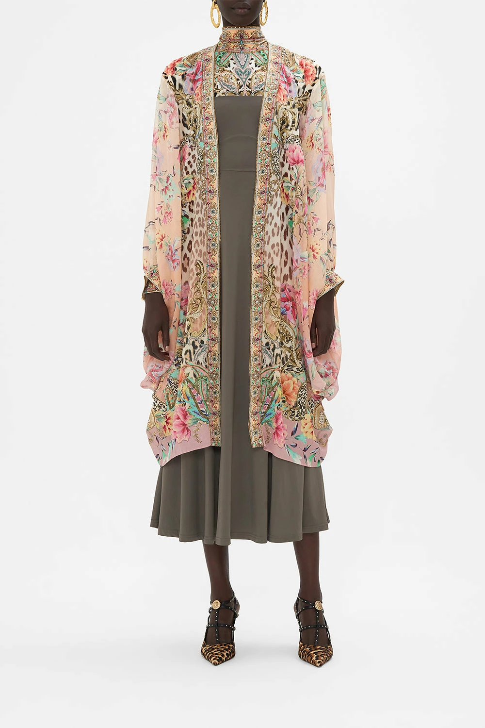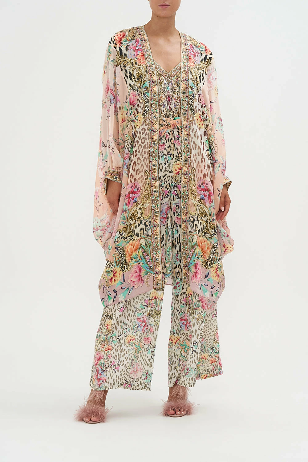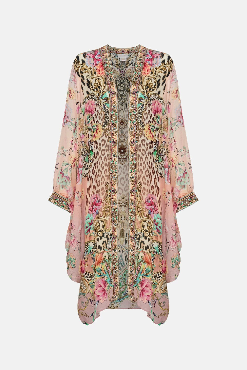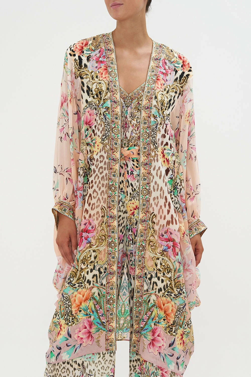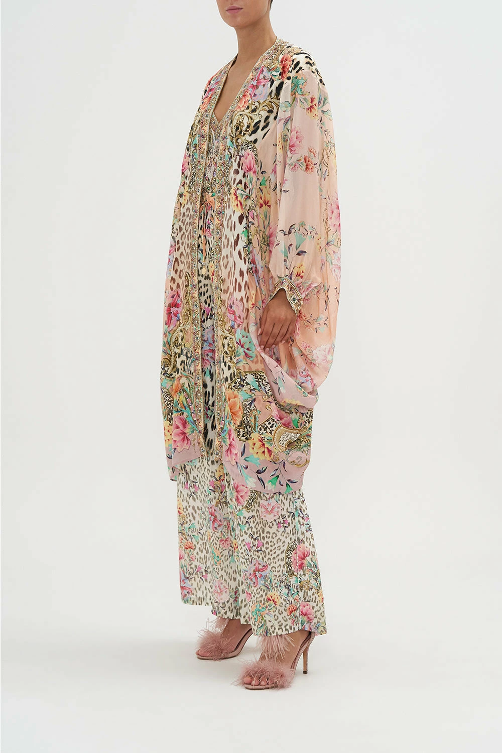 The Queen Atlantis Dramatic Sleeve Cocoon Layer brings back a classic with timeless leopard print finished with petals dipped in blush hues, roped accents and gold baroque detailing. Crafted from the softness of silk, this luxury layer is home to statement sleeves that cocoon down to the wrist, a relaxed oversized silhouette that drapes into a midi length and hand-embellished crystals that adorn contrasting neckbands.