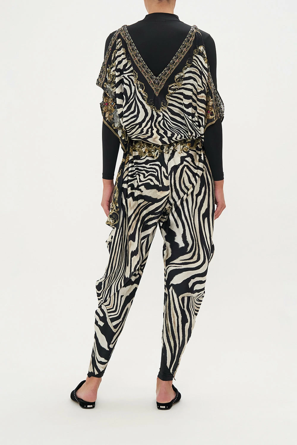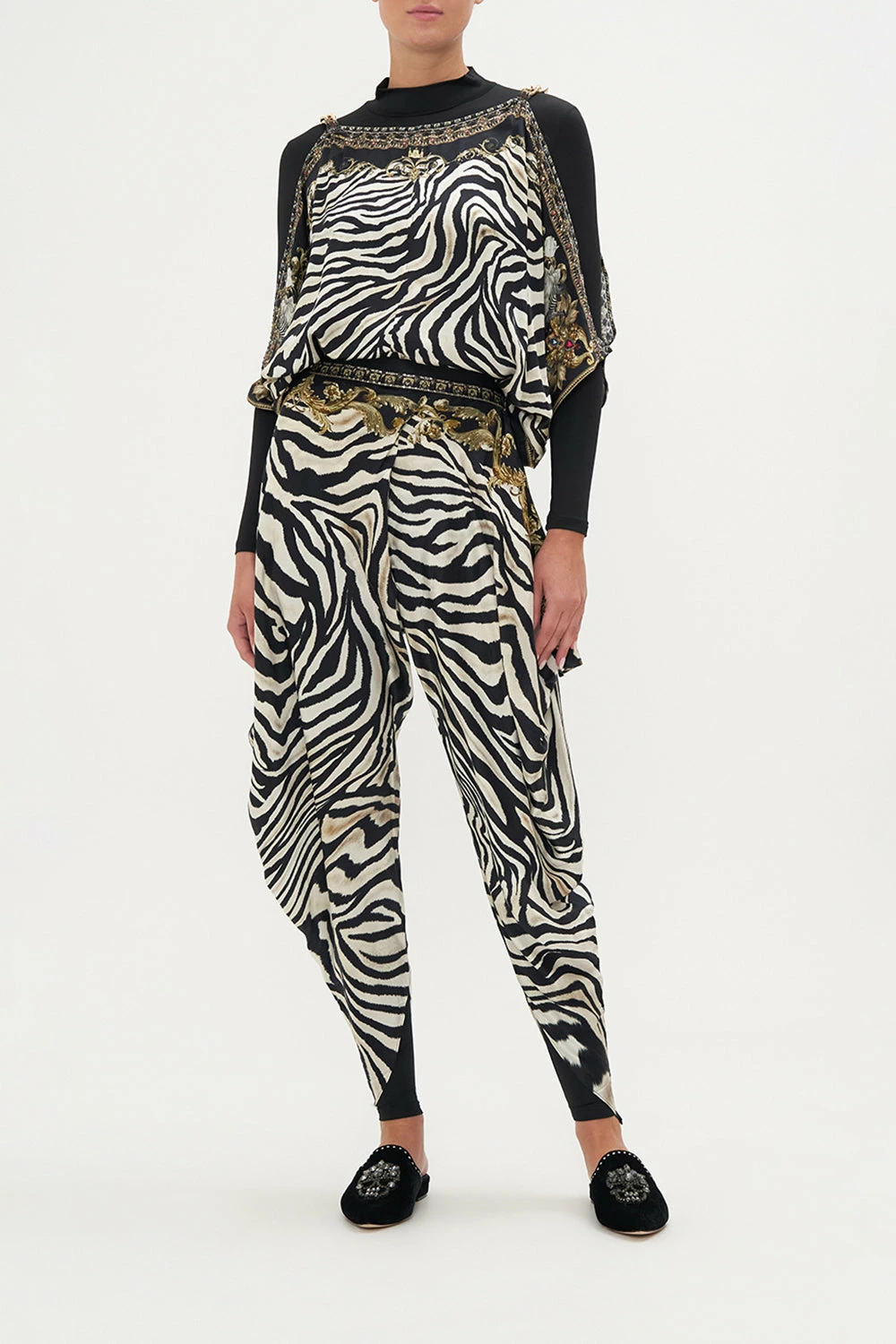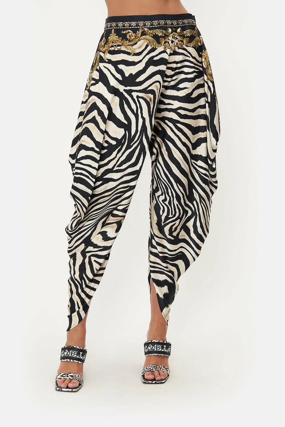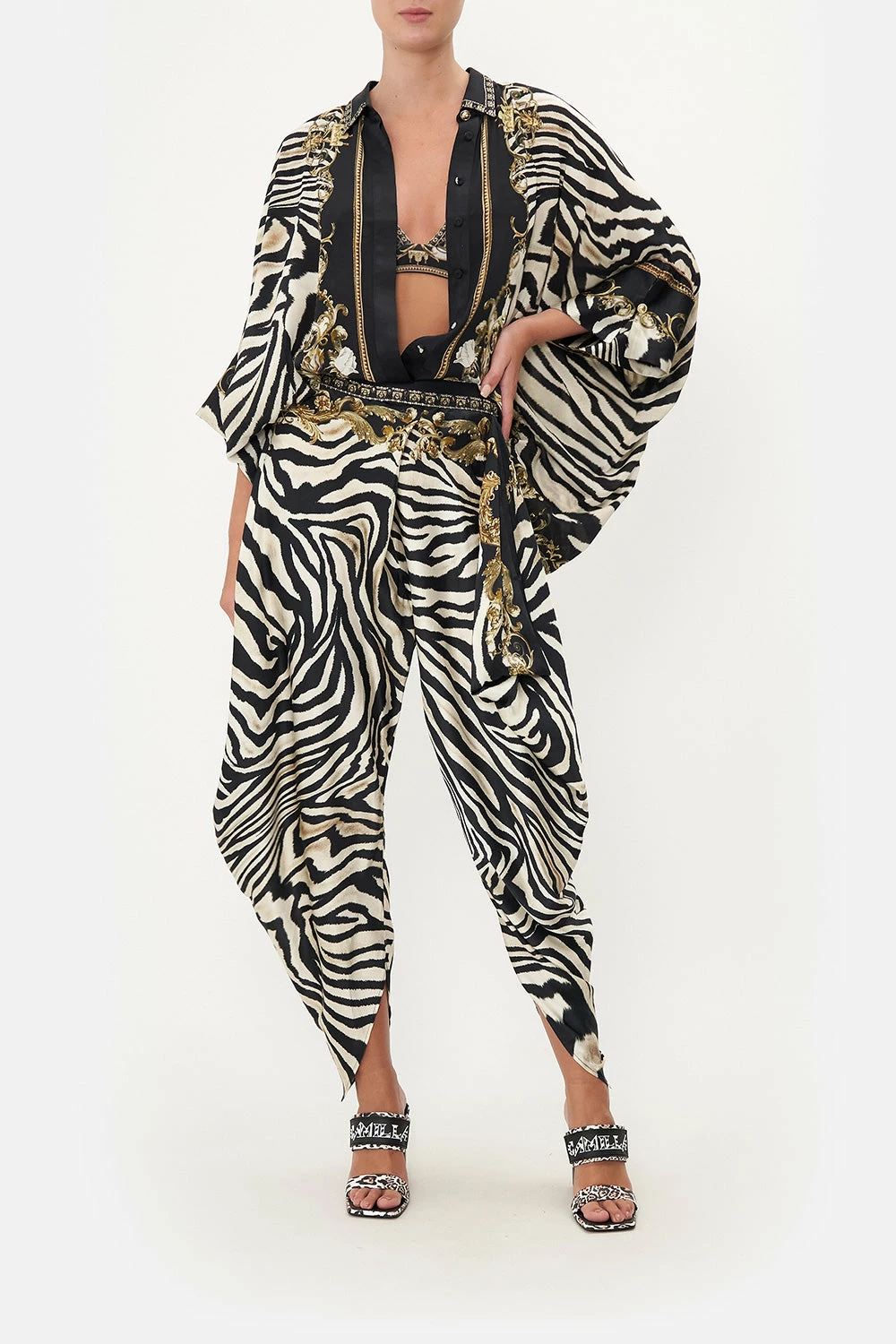 Silk cascading in effortless rivers of wild animalia, our Earn Your Stripes Draped Side Pant greets the gaze with monochromatic animal print enveloped by gold baroque detailing, ornate panel accents and striking zebra swirls. Crafted with hand-embellished CAMILLA crystals, these luxury pants play host to a semi-elasticated waist for your most perfect fit, pocket functionality, draping upon the leg and a relaxed silhouette that meets an asymmetrical accent.