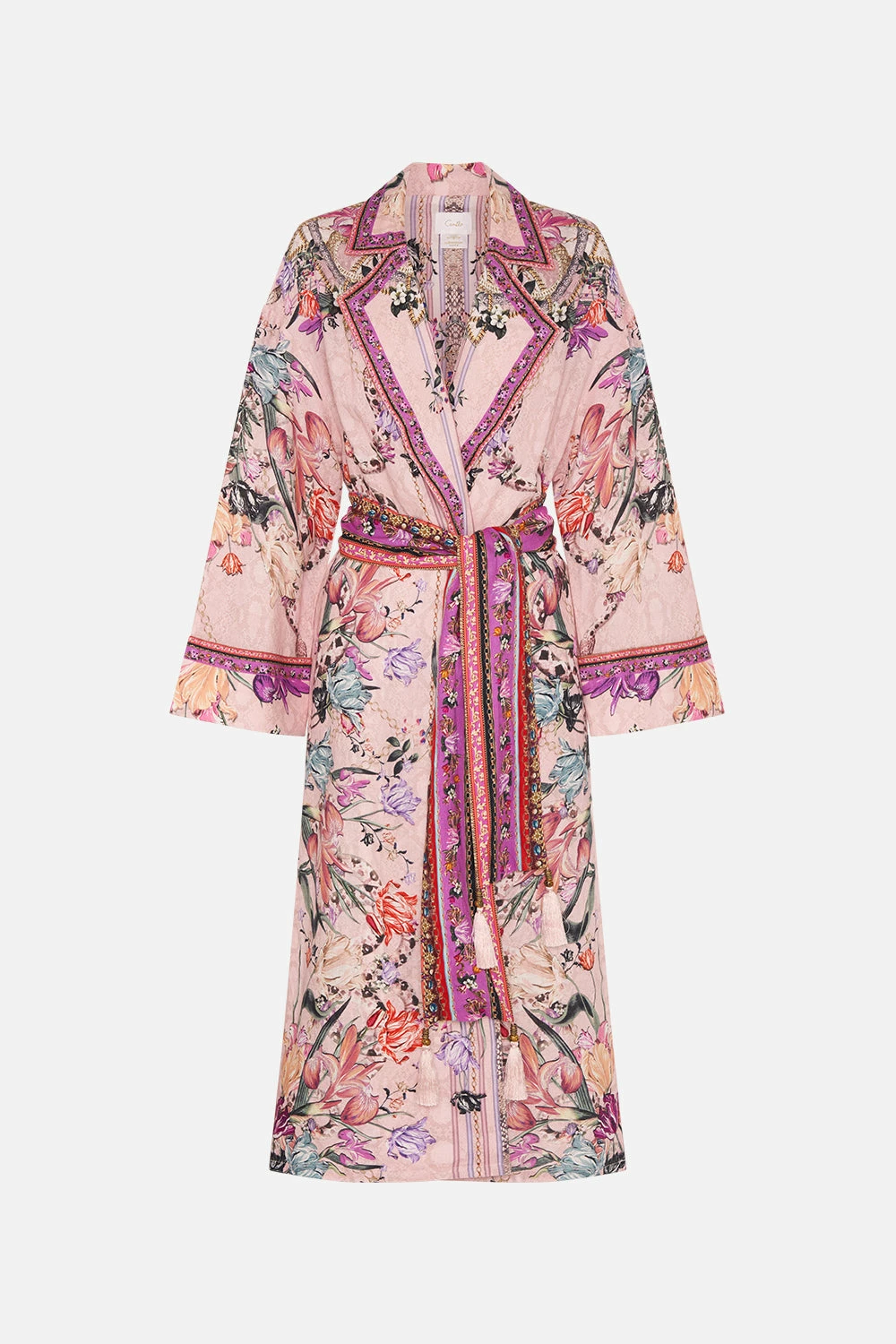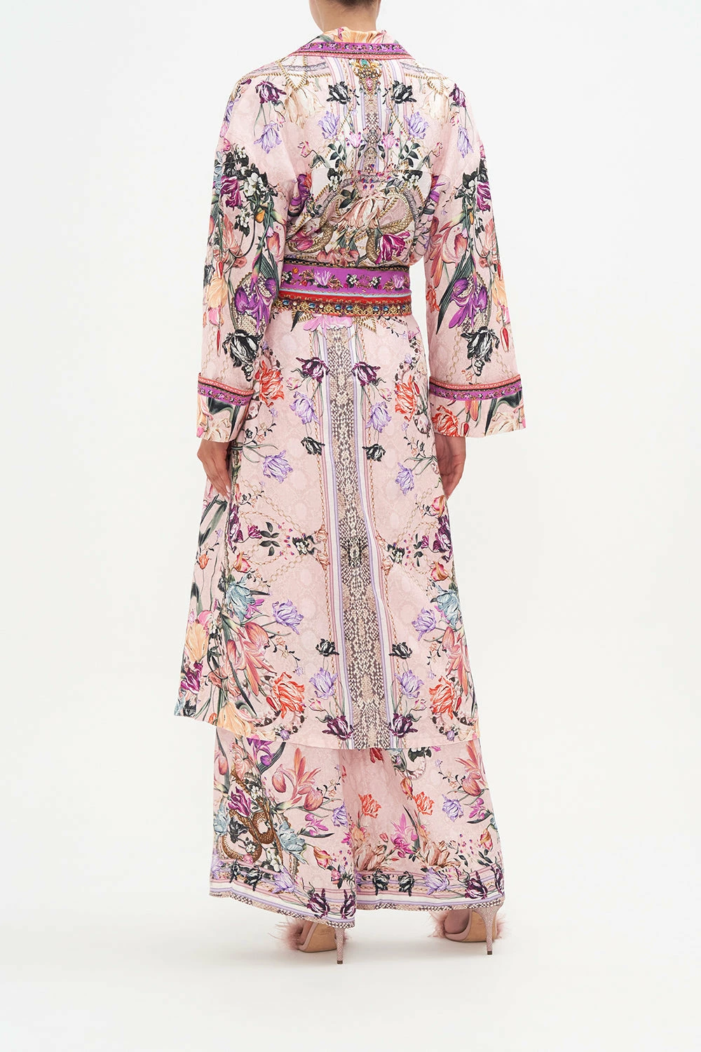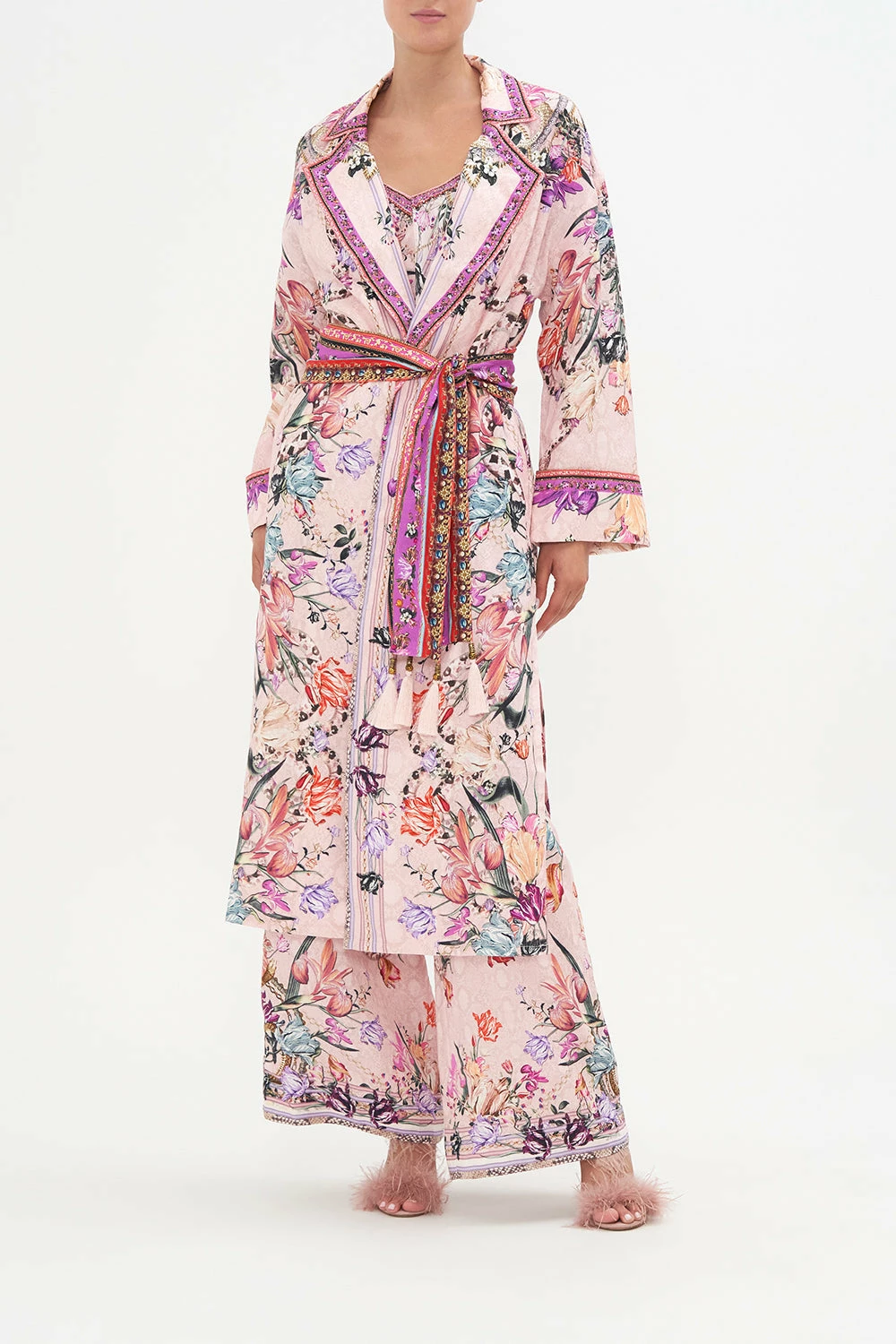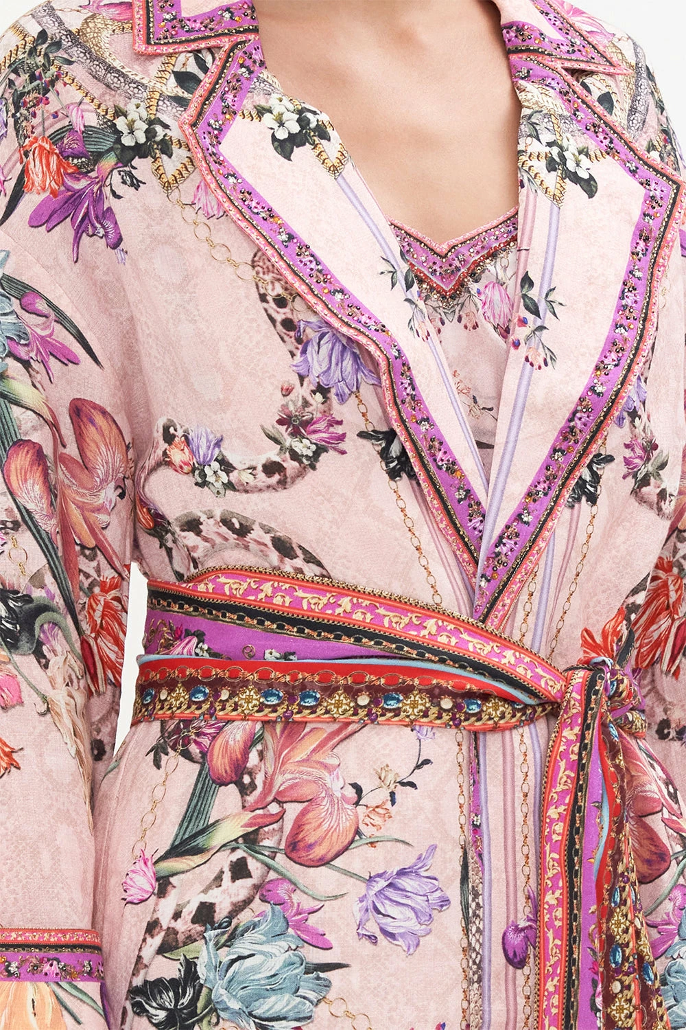 Modern layers introduced to the sweetness of flora, the Mad As A Snake Duster Coat is encapsulated by a soft dusty pink defined with cascades of striking snakes, botanicals in shades of sunset and gold chain details. Crafted from exquisitely breathable linen, this luxury duster coat features a relaxed maxi silhouette, a cinching waist-tie, drop shoulder details and hand-embellished CAMILLA crystals.