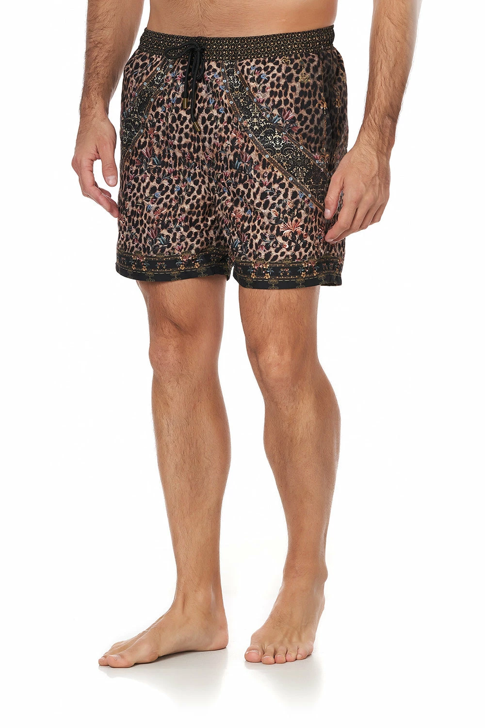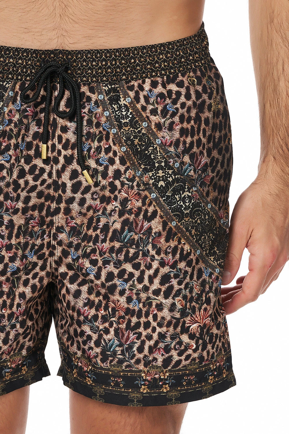 Transform the ordinary with the Abingdon Palace Elastic Waist Boardshort with decadent leopard print rosettes and filigree detailing, inspired by the iconic Biba Boutique. Expertly crafted from a sun safe fabric these printed men’s swim shorts are styled with side pockets, Velcro back pocket and contrast drawstring waist. A bold swim short for the print-loving gentleman, pair with a classic white tee for a fun beach look.