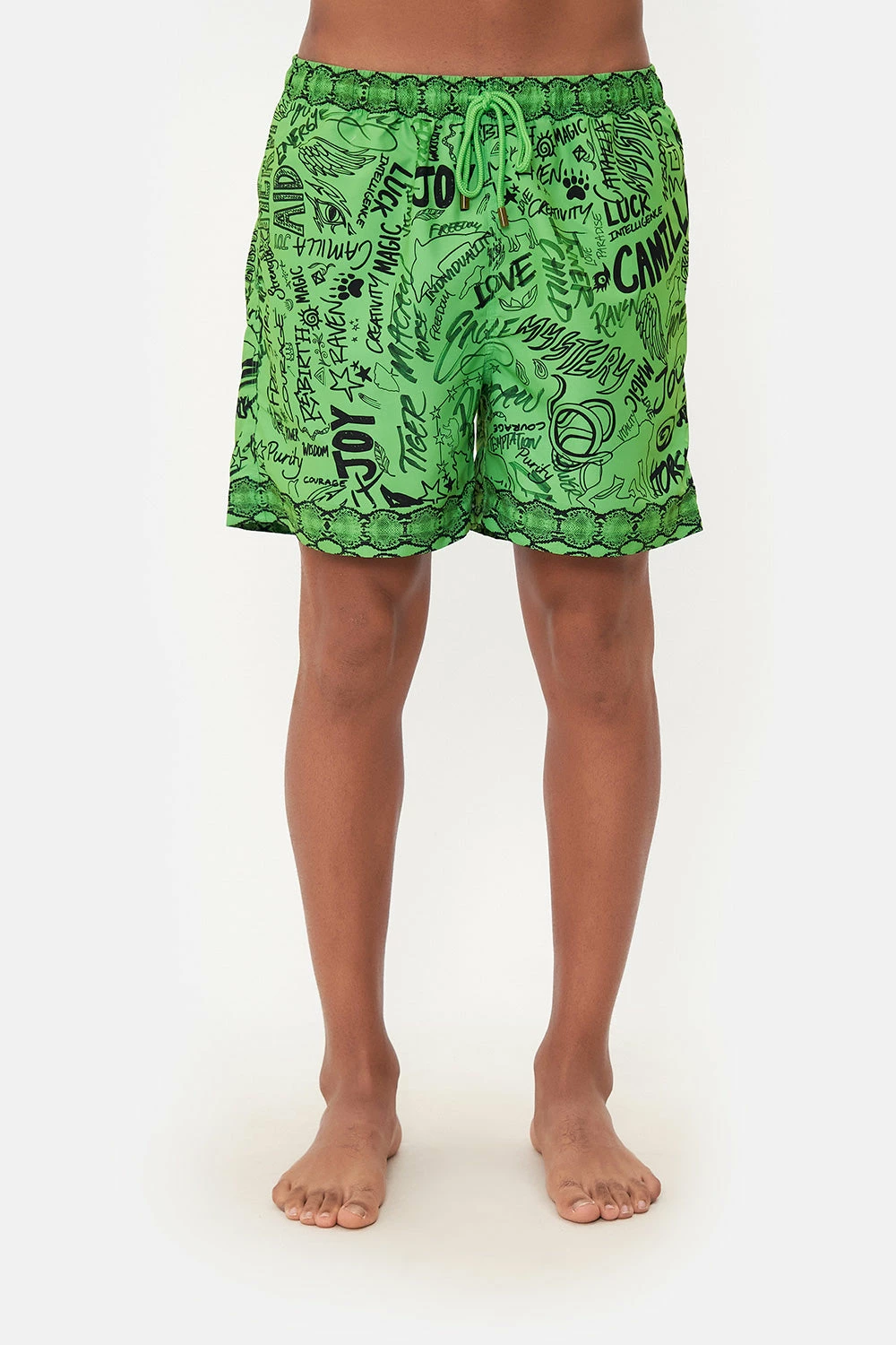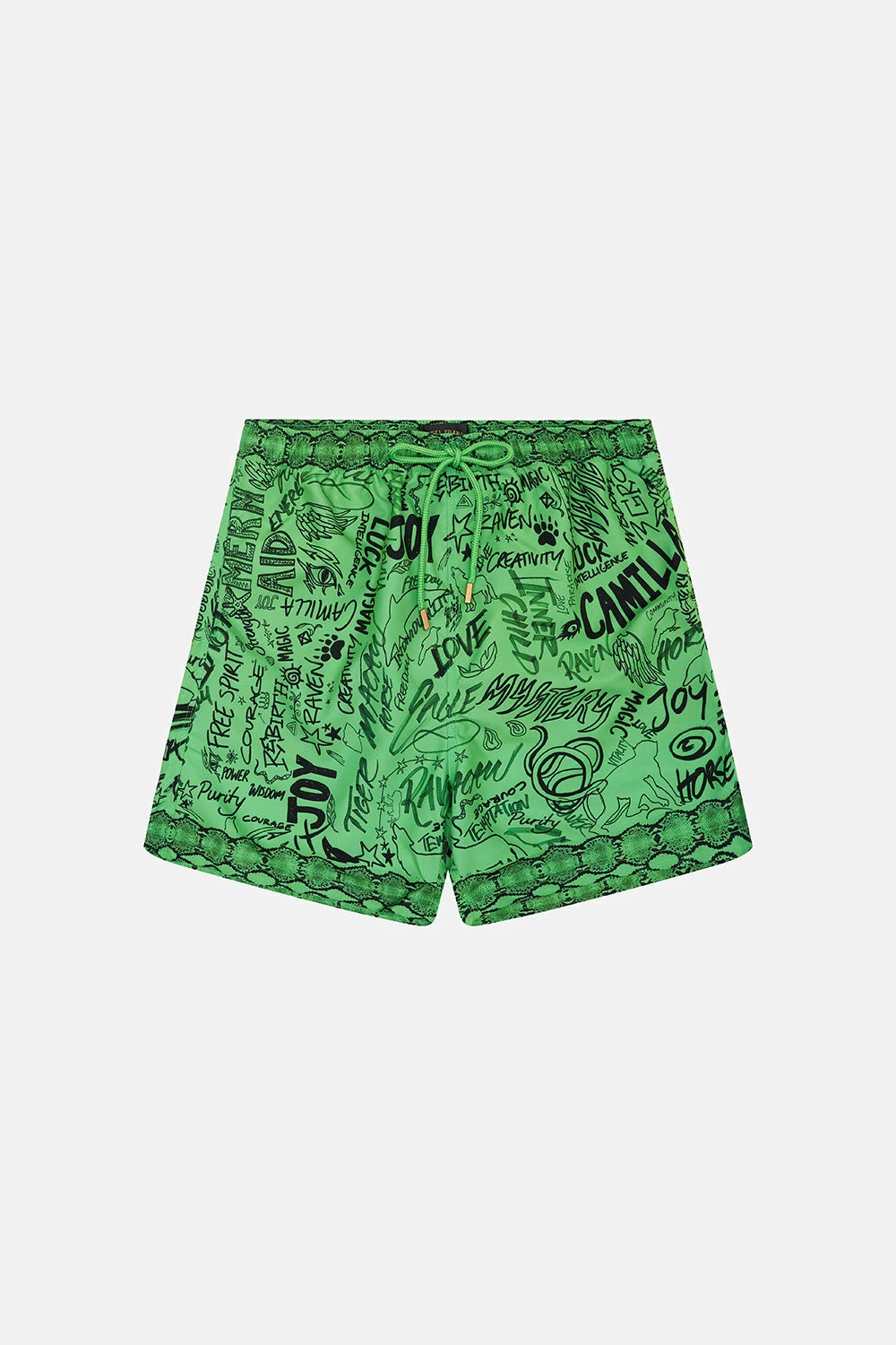 The Anti Authority Animal Authorities Elastic Waist Boardshort reimagines menswear with an electric green graffiti print complete with swirls of black star detailing, slogan splashes and fiery hand-illustrations. Crafted from recycled polyester retrieved from our seas, this luxury boardshort sports an elasticated drawstring waist for your most perfect fit, pocket details with a velcro fastening and a relaxed mid-length silhouette.