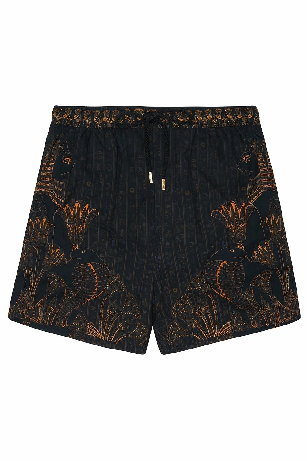 A bold swim short for the print-loving gentleman, the Cobra King Men’s Boardshorts embodies a scene from ancient Egypt. Crafted in a hypnotic black-based print enriched with gold line work, these relaxed fit swim shorts feature a comfortable elastic waist with drawstring and toggle ends, front pockets with mesh lining, a back pocket with velcro closure and an external eyelet for drainage. Pair back with matching Round Neck T Shirt.