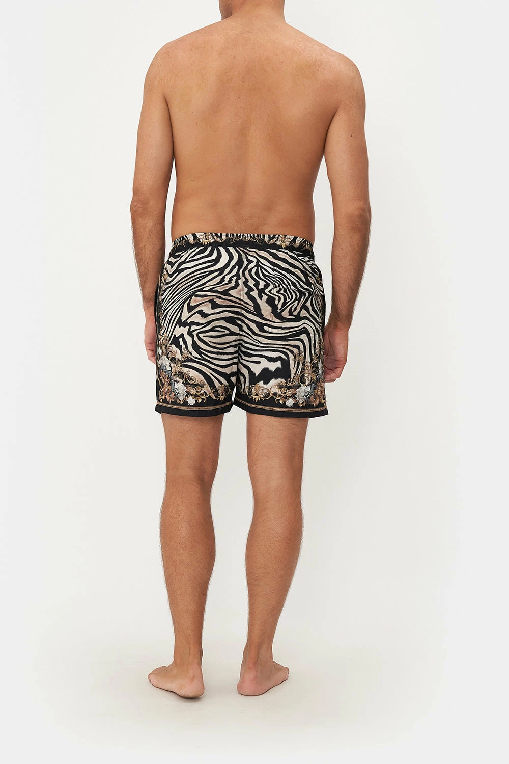Encased in free-spirited animalia, the Earn Your Stripes Elastic Waist Boardshort is enwrapped in monochromatic animal print enveloped by gold baroque detailing, the bloom of white roses and striking zebra portraits. Crafted from recycled polyester retrieved from our seas, this luxury boardshort features an elasticated drawstring waist, pocket details with a velcro fastening and a relaxed mid-length silhouette.