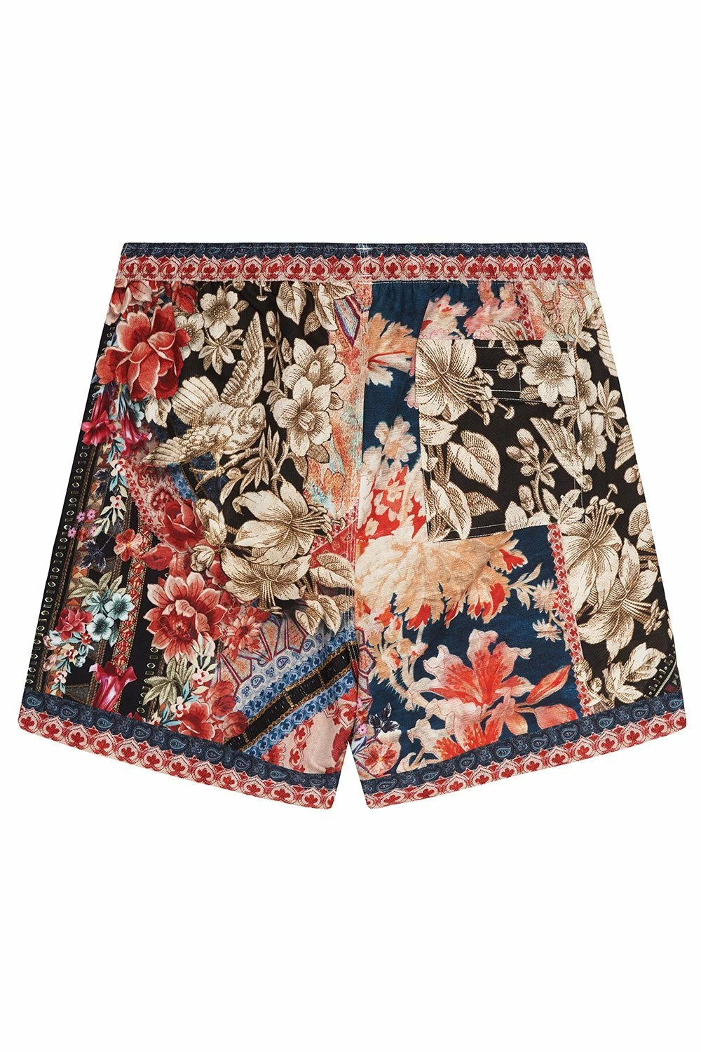 Make a statement in the Meadow He Wrote Elastic Waist Board Short. This patchwork floral print is inspired by blooms found in English gardens and antique markets. Featuring an elastic waist with a drawstring, handy velcro back pocket and side pockets, these standout board shorts are made with swim safe fabric so can be enjoyed on land or in water.