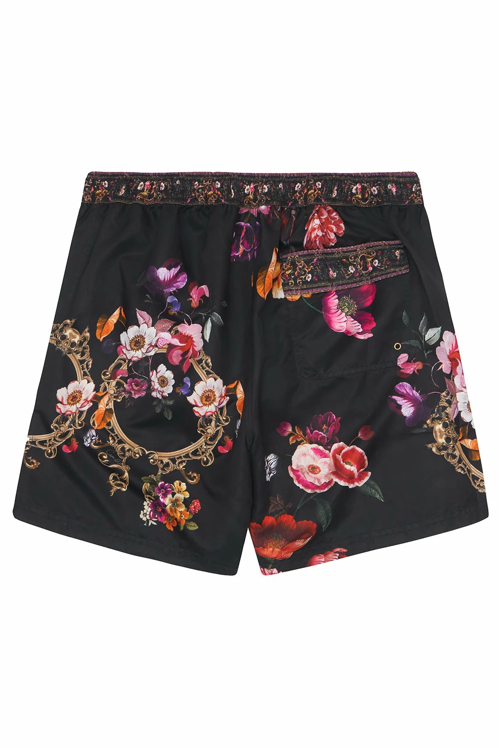 An opulent swim short for the print-loving gentleman, the Mirror Mirror Elastic Waist Boardshorts embodies a scene of French fairy tales. Crafted in a hypnotic black-based print enriched with hand painted florals, these relaxed fit swim shorts feature a comfortable elastic waist with drawstring and toggle ends, front pockets with mesh lining, a back pocket with Velcro closure and an external eyelet for drainage. Pair back with matching Round Neck T Shirt or Hoodie.