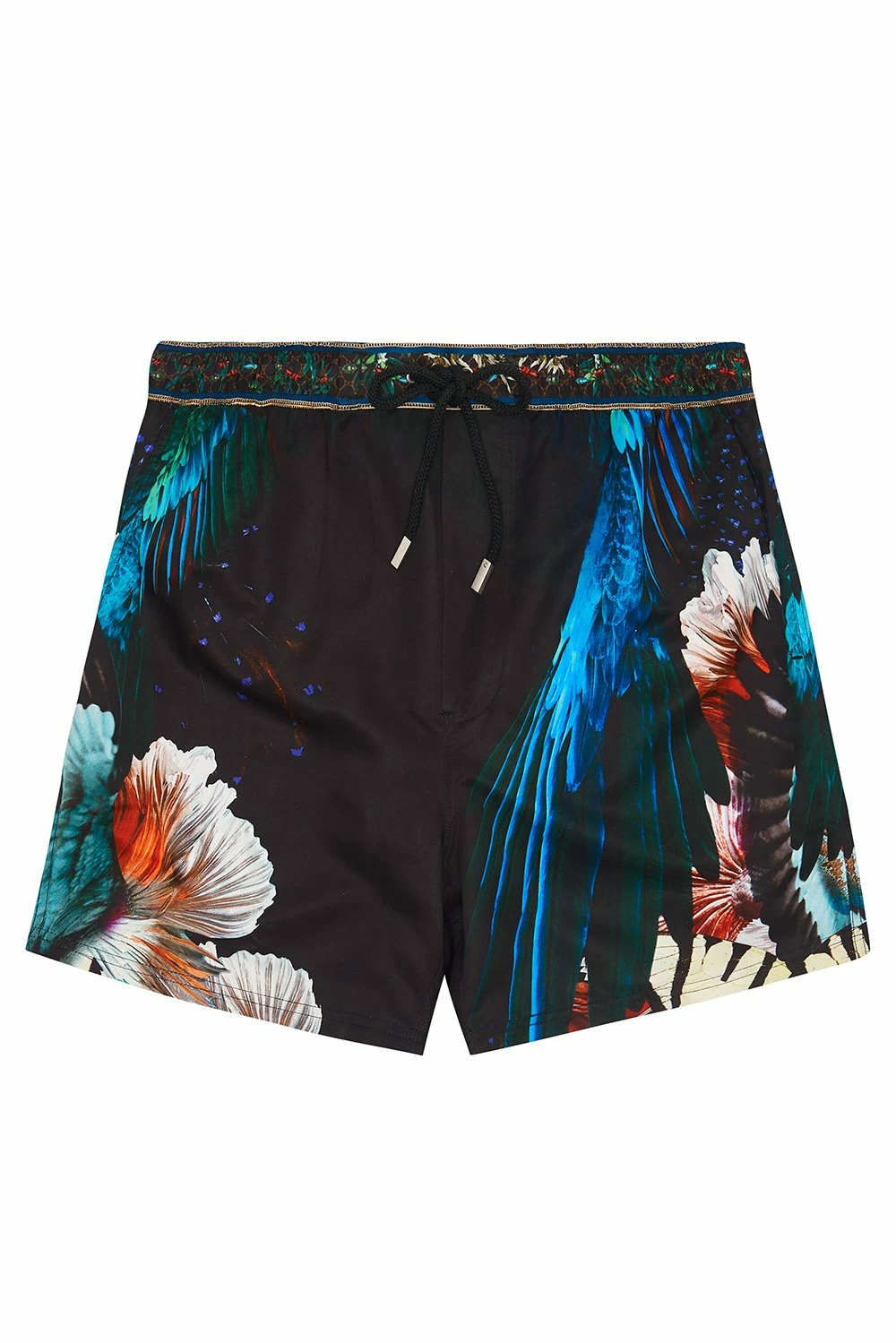 Drawing inspiration from a bird’s eye view at dusk between rainforest and reef, the Night Flight Mens Boardshort exudes exotic charm. These printed swimmers feature an elasticated waist, drawstring and toggle ends, front pockets with mesh lining, as well as back patch pockets with Velcro closure.