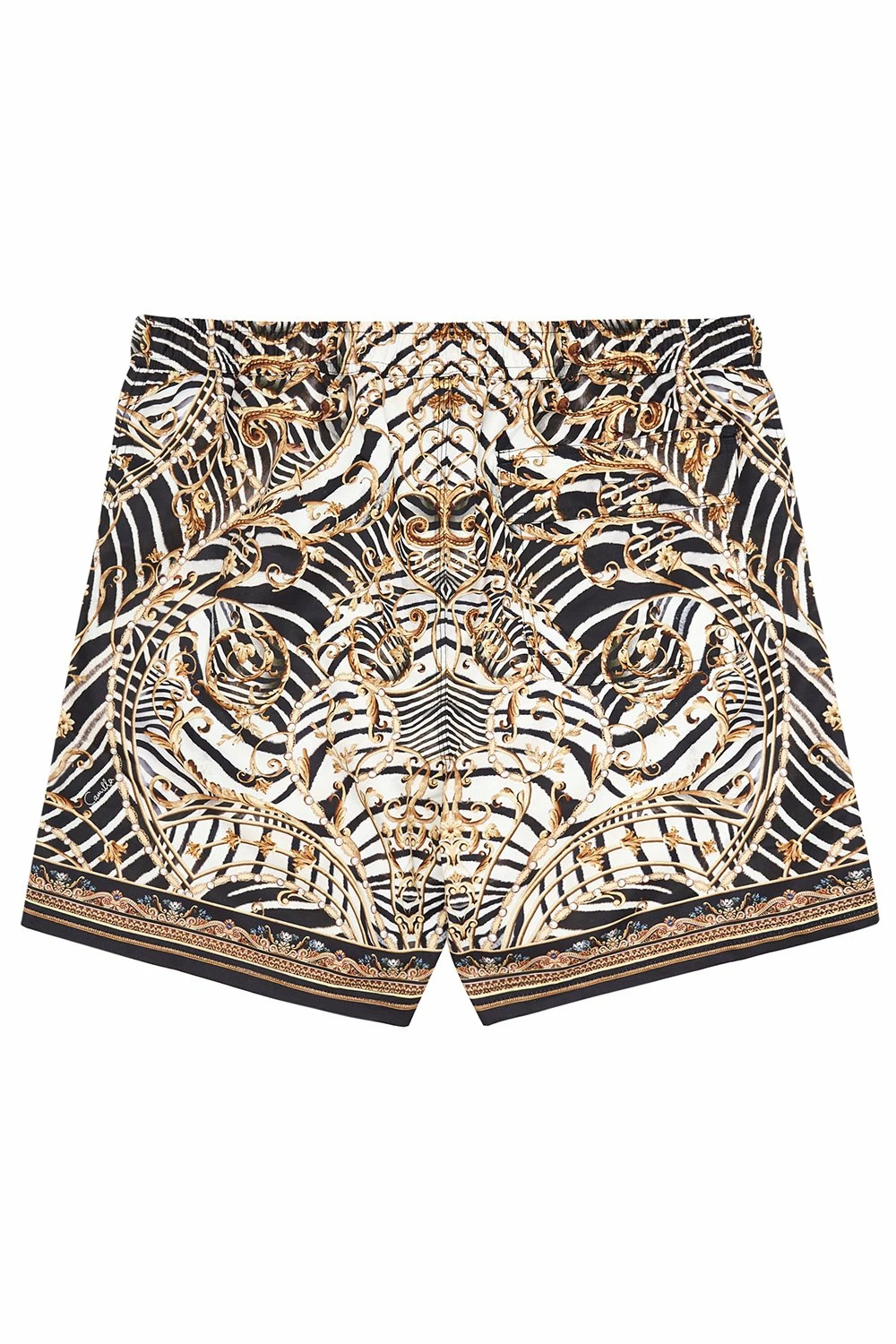 An opulent swim short for the print-loving gentleman, the Night Waiting For Day Elastic Waist Boardshort embodies a scene of Studio 54 fun. Crafted in a hypnotic black-based print enriched with hand painted florals, these relaxed fit swim shorts feature a comfortable elastic waist with drawstring and toggle ends, front pockets with mesh lining, a back pocket with Velcro closure and an external eyelet for drainage. Pair back with matching Round Neck T Shirt.