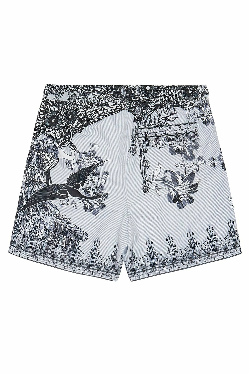 A statement short for the sun chasing gentleman, the Silver Linings Boardshorts play a homage to a monochromatic cinema of painted mythical birds and dainty Chinese florals. Crafted in a dashing black and white print, these striking swim shorts feature a comfortable elastic waist with drawstring and toggle ends, front pockets with mesh lining, a back pocket with Velcro closure and an external eyelet for drainage. Pair back with matching printed shirt for a striking summer ensemble.