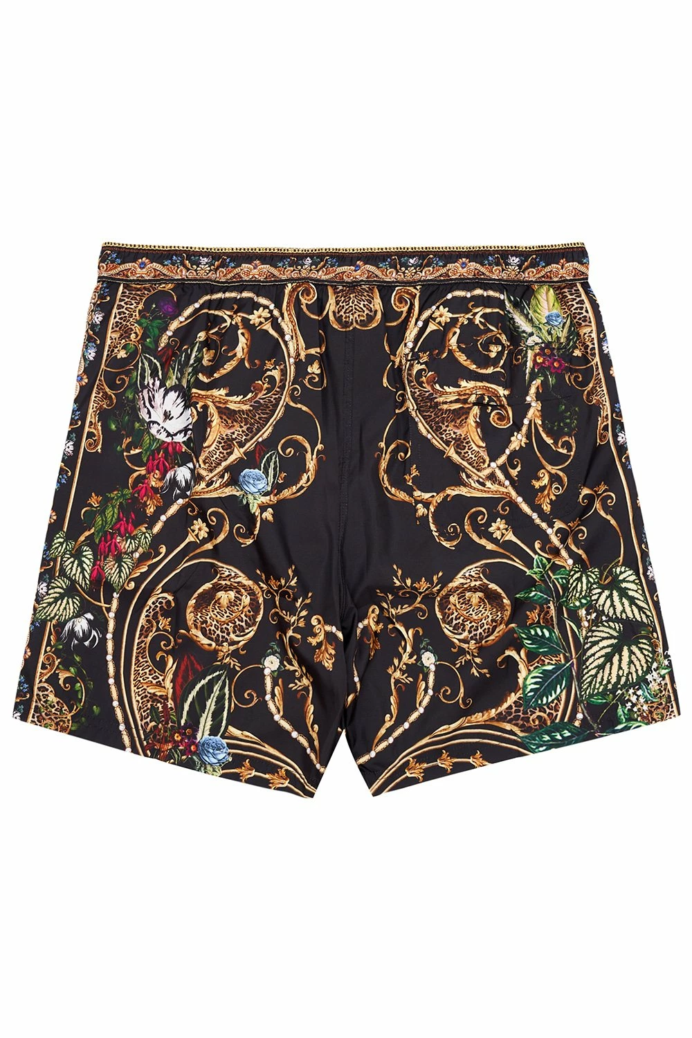 A bold swim short for the print-loving gentleman, the Studio 54 Elastic Waist Boardshort embodies coming together with a single mission: a night of the most raucous kind of revelry. Crafted in a hypnotic black-based print enriched with gold line work, these relaxed fit swim shorts feature a comfortable elastic waist with drawstring and toggle ends, front pockets with mesh lining, a back pocket with velcro closure and an external eyelet for drainage. Pair back with matching Round Neck T Shirt.
