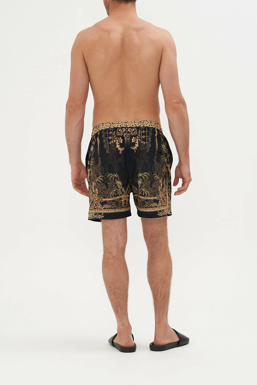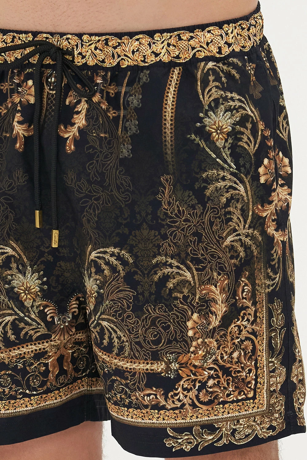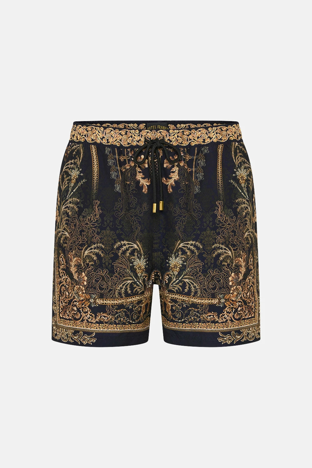 The Night Is Noir Elastic Waist Boardshort explores a mesmorising sea of midnight hues finished with ornate golden swirls that dance alongside decadent botanical details and exquisite chain cascades. Crafted from recycled polyester retrieved from our seas, this luxury boardshort sports an elasticated drawstring waist for your most perfect fit, pocket details with a velcro fastening and a relaxed mid-length silhouette.