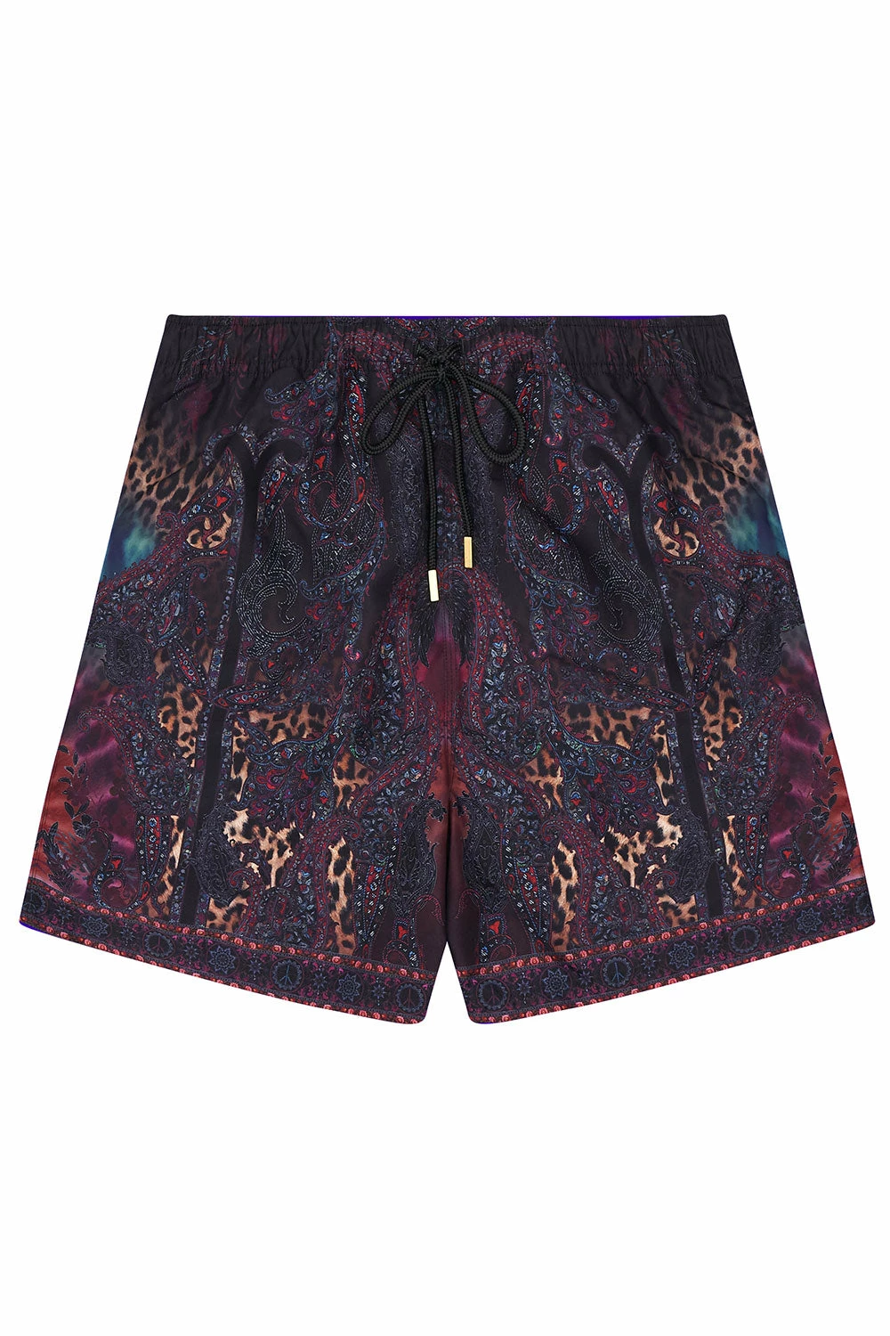 Dive into seductive style with the Smoking Lounge Elastic Waist Boardshort. Inspired by an after dark retreat lined with rich tapestries, these are a vacation staple. Filled with dark hues and strikes of leopard on swim safe fabric, they feature an elasticated waist with drawstring and toggle so they’re as ideal for lounging as they are swimming.
