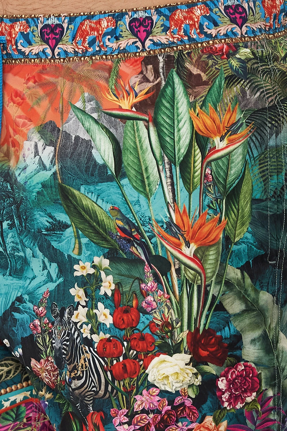 Taking the imagination to moments of nirvana, the Untamed Runaway Elastic Waist Boardshort is wrapped in a soft sunset scene enveloped by zebra print, birds of paradise, blooming palms and the flutter of butterflies. Crafted from recycled polyester retrieved from our seas, this luxury boardshort features an elasticated drawstring waist, pocket details with a velcro fastening and a relaxed mid-length silhouette.