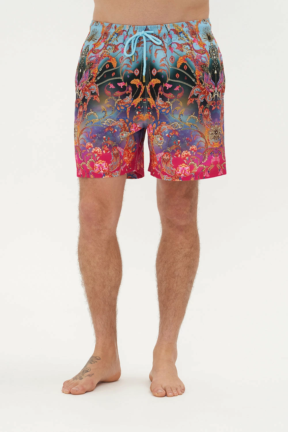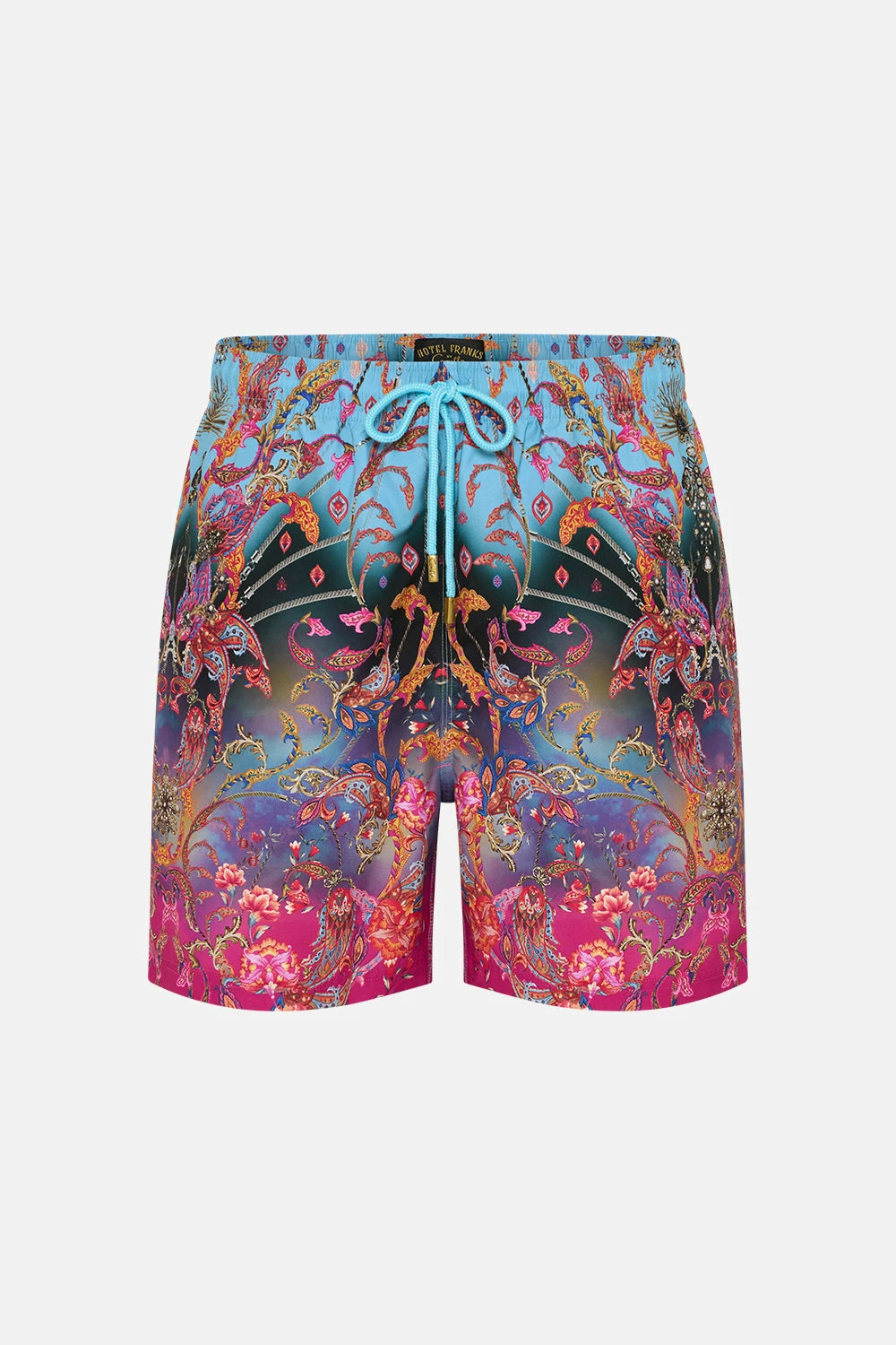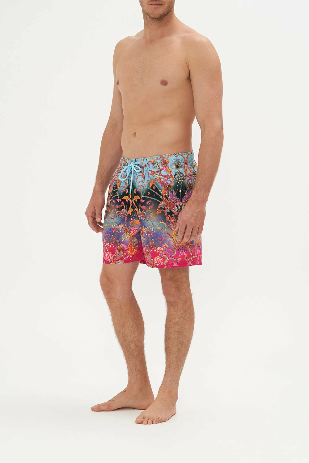 The What Lies Beneath Elastic Waist Boardshort welcomes the eye to paradise with a sky blue hue graced with paisley patterns dipped in raspberry tones, gold baroque details and a soft gradient that falls into shades of lavender. Crafted from recycled polyester retrieved from our seas, this luxury boardshort sports an elasticated drawstring waist for your most perfect fit, pocket details with a velcro fastening and a relaxed mid-length silhouette.